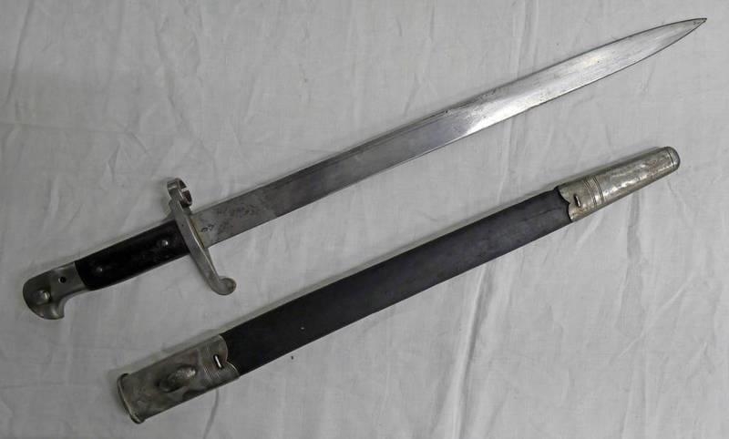 1887 PATTERN BRITISH MK III SWORD BAYONET WITH WILKINSON SWORD CO WITH 46 CM BLADE STAMPED WITH CROWN CYPHER 187 & MAKERS NAME TO SIDE. STEEL MOUNTED LEATHER SCABBARD