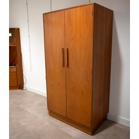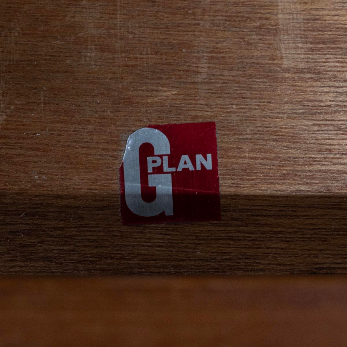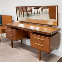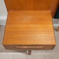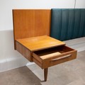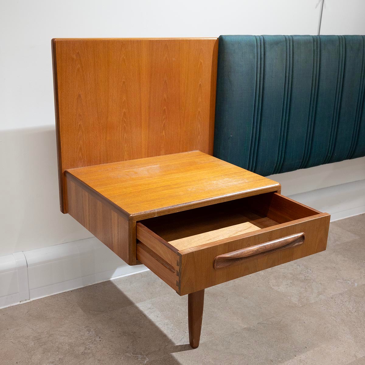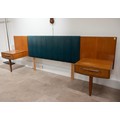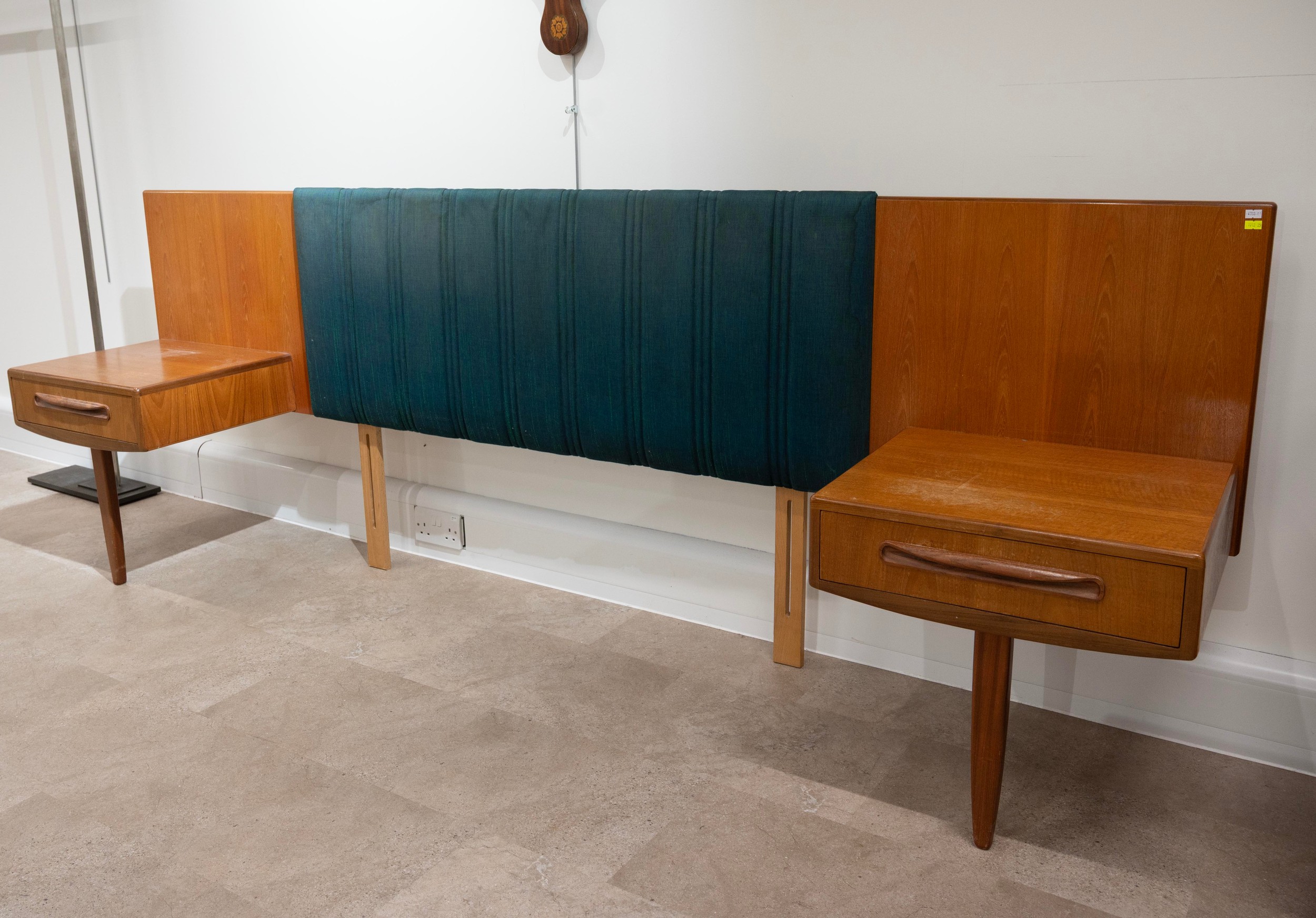 A G-plan teak headboard with padded irredecent fabric with attached single drawer bedside cabinets, raised on a central rectangular tapering support. H91cm X W254cm X D45cm.