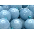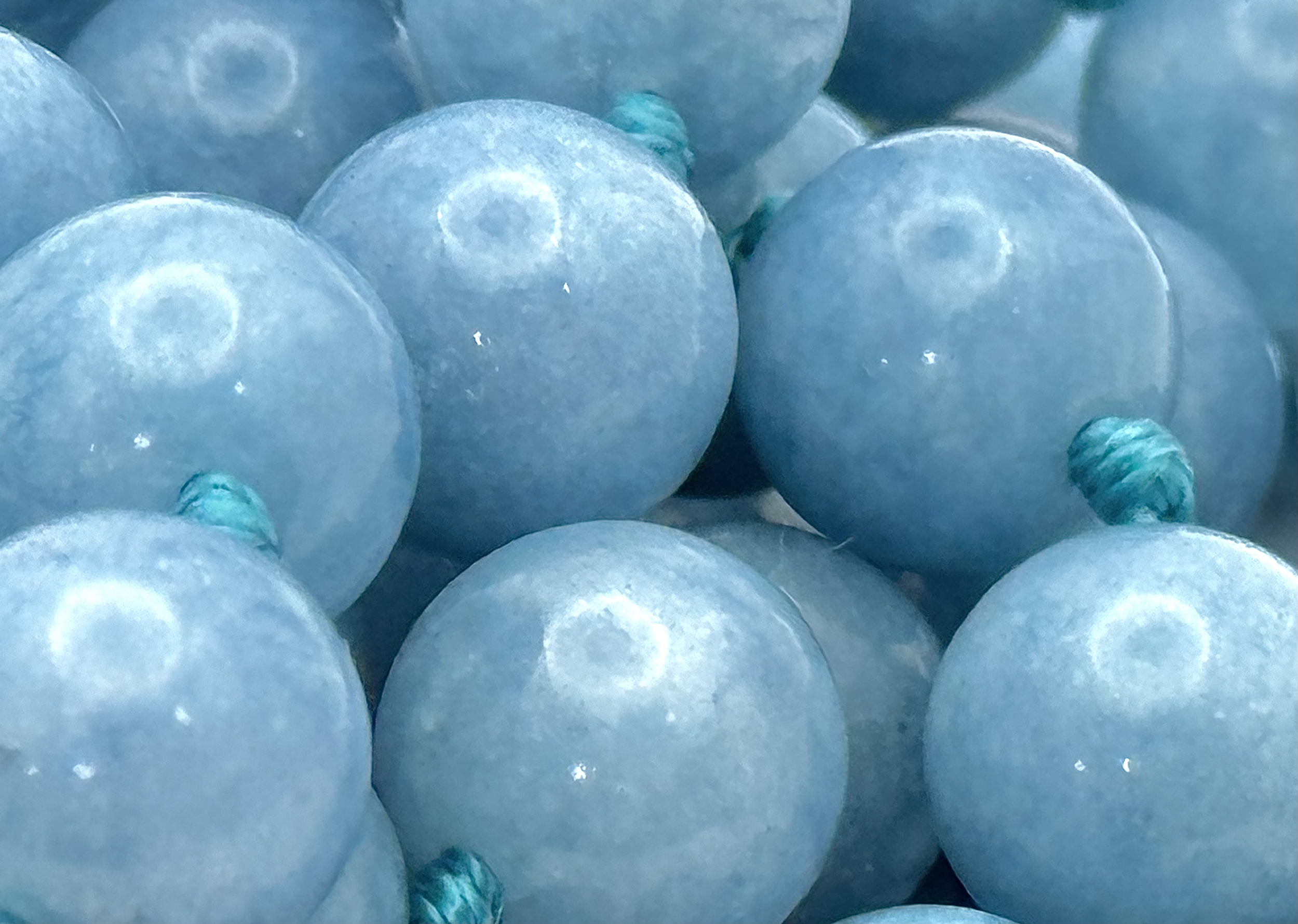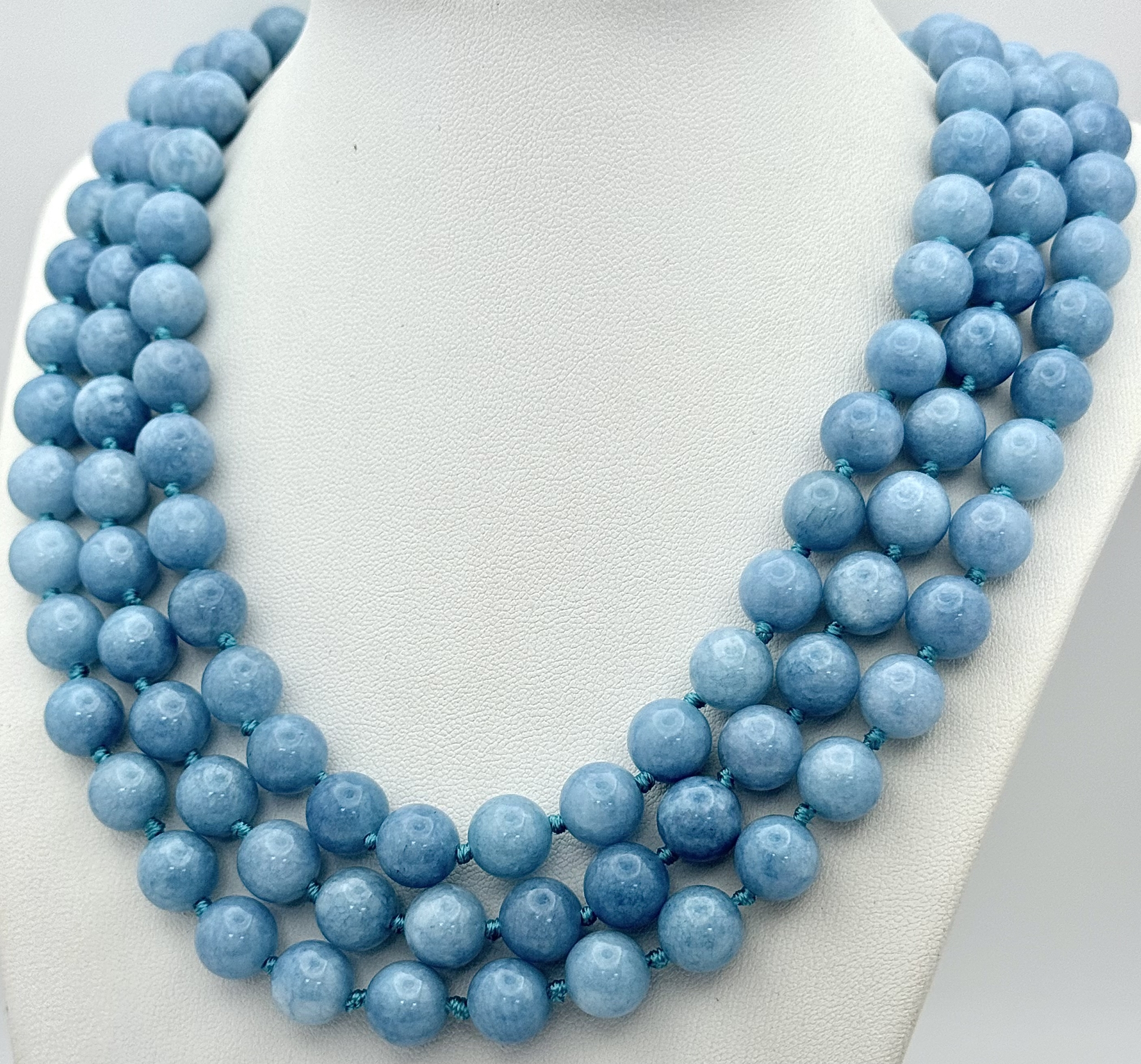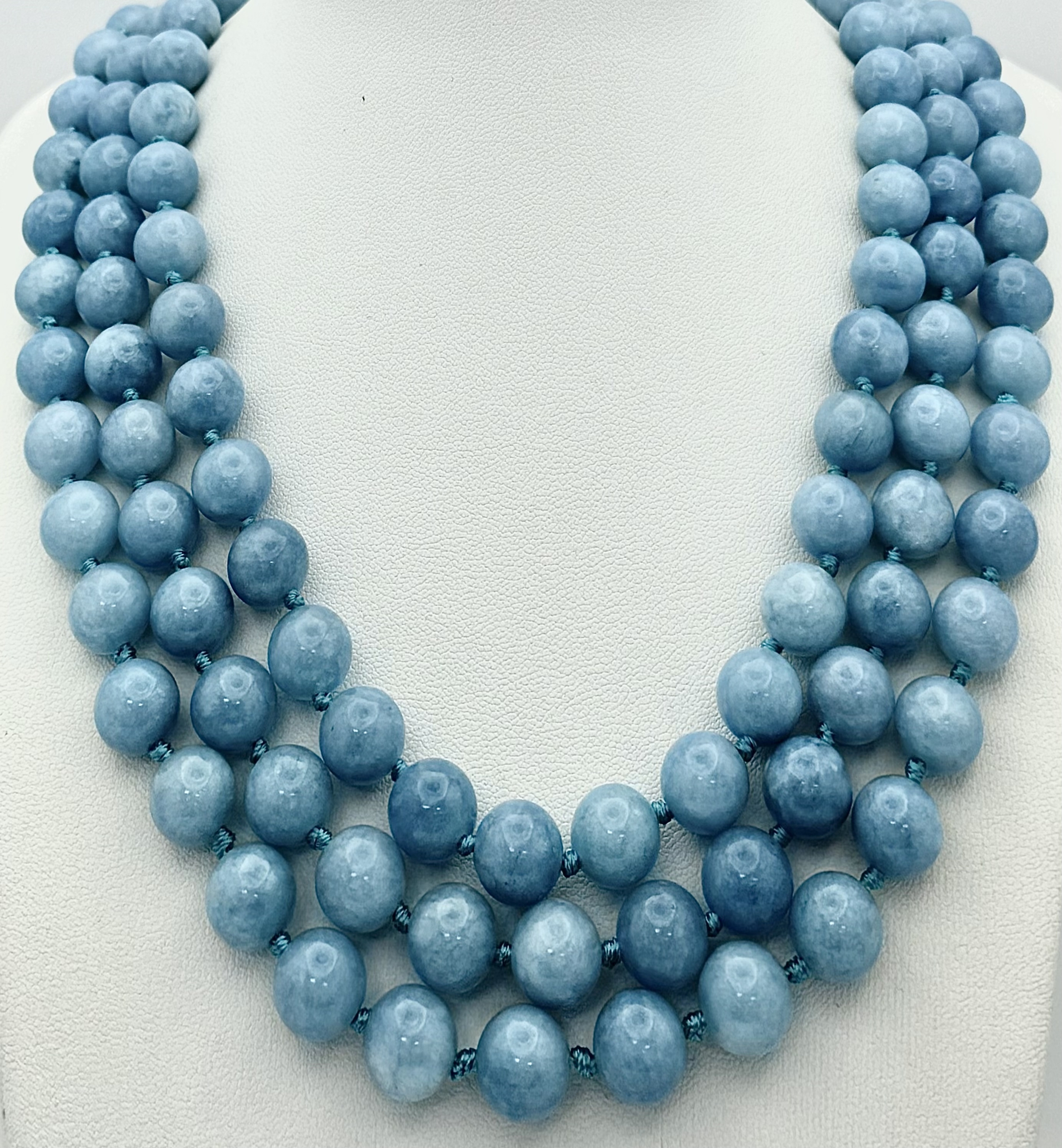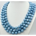 A Three Row Aquamarine Beaded Necklace. 10mm beads. 42-46cm necklace length.