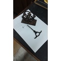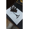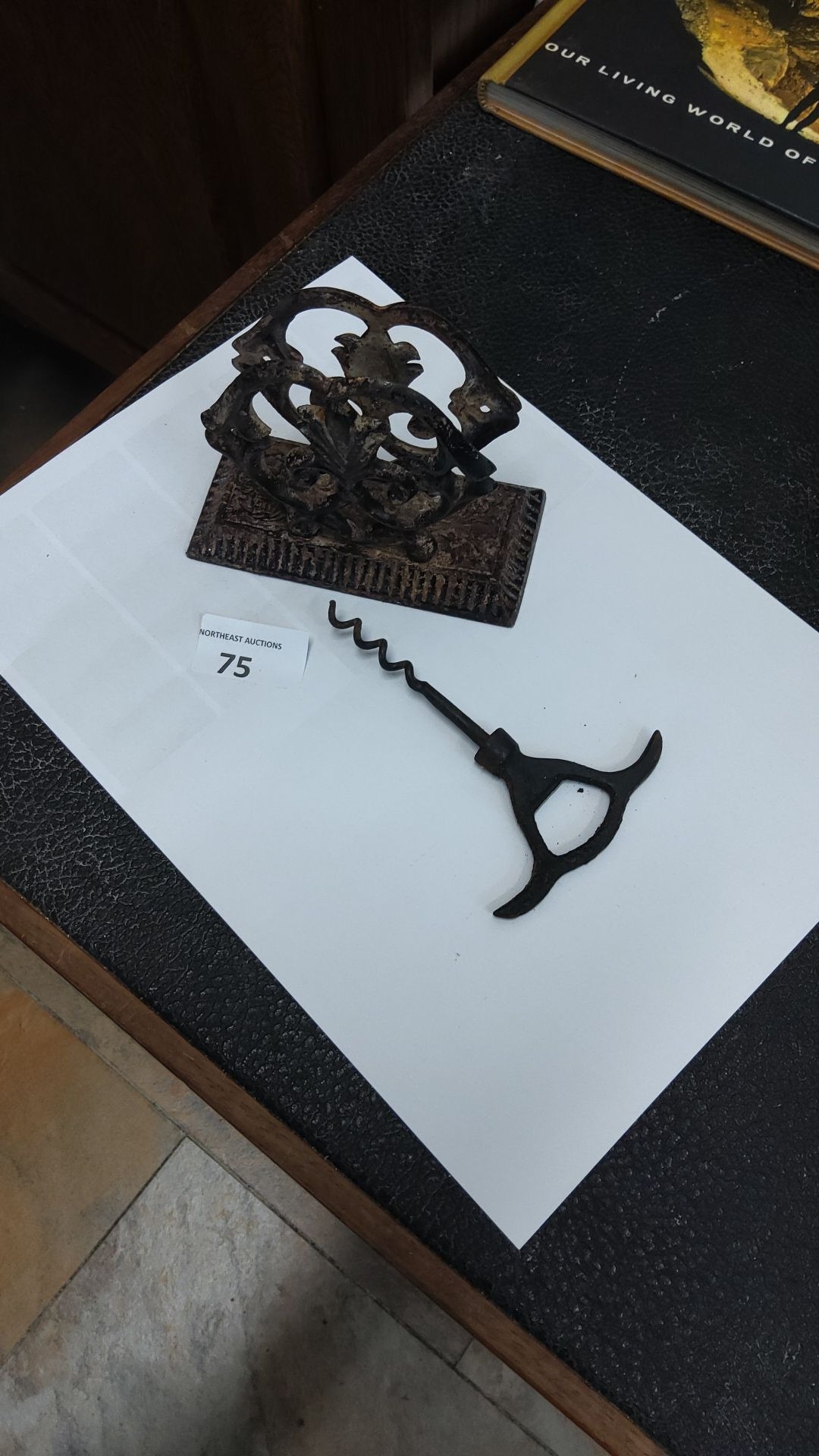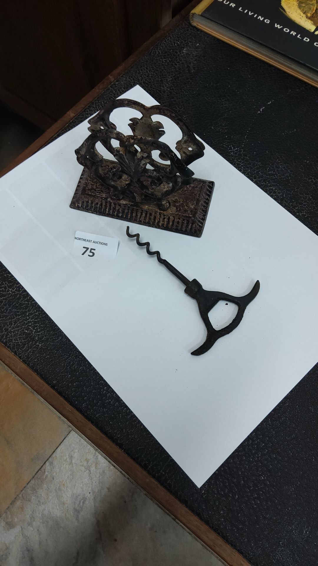 Antique cast iron letter holder featuring ornate scrollwork, paired with a vintage corkscrew.