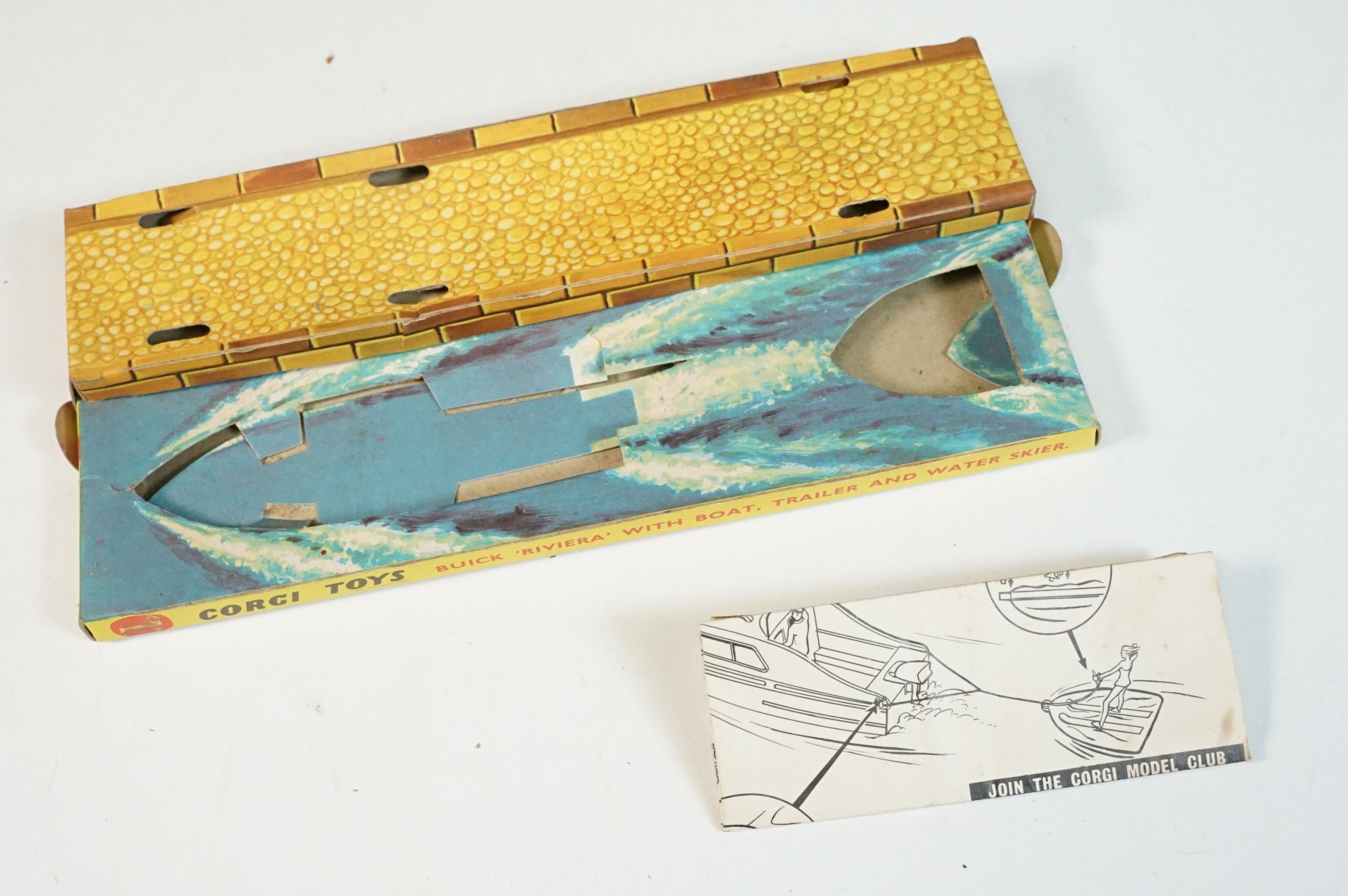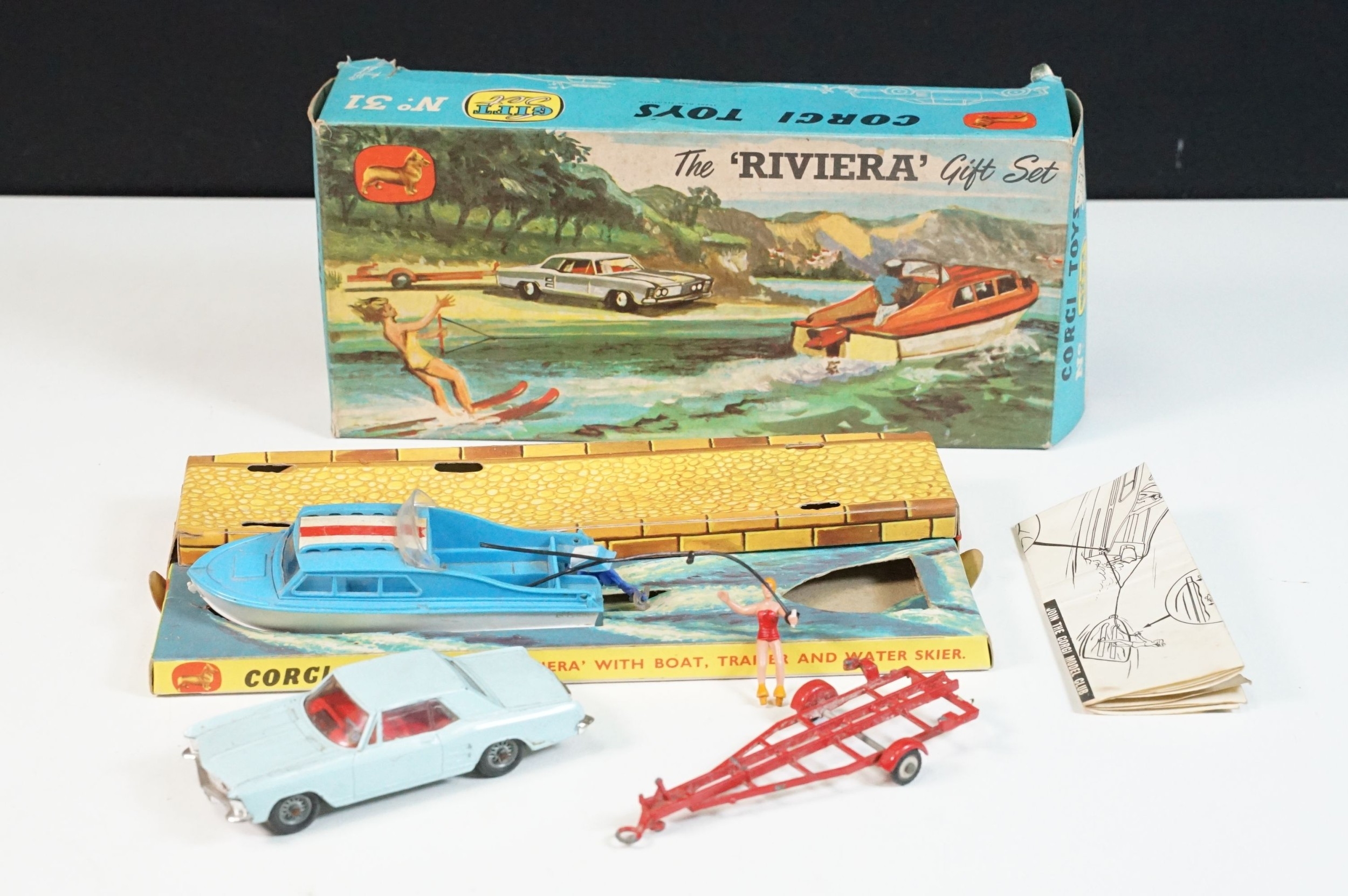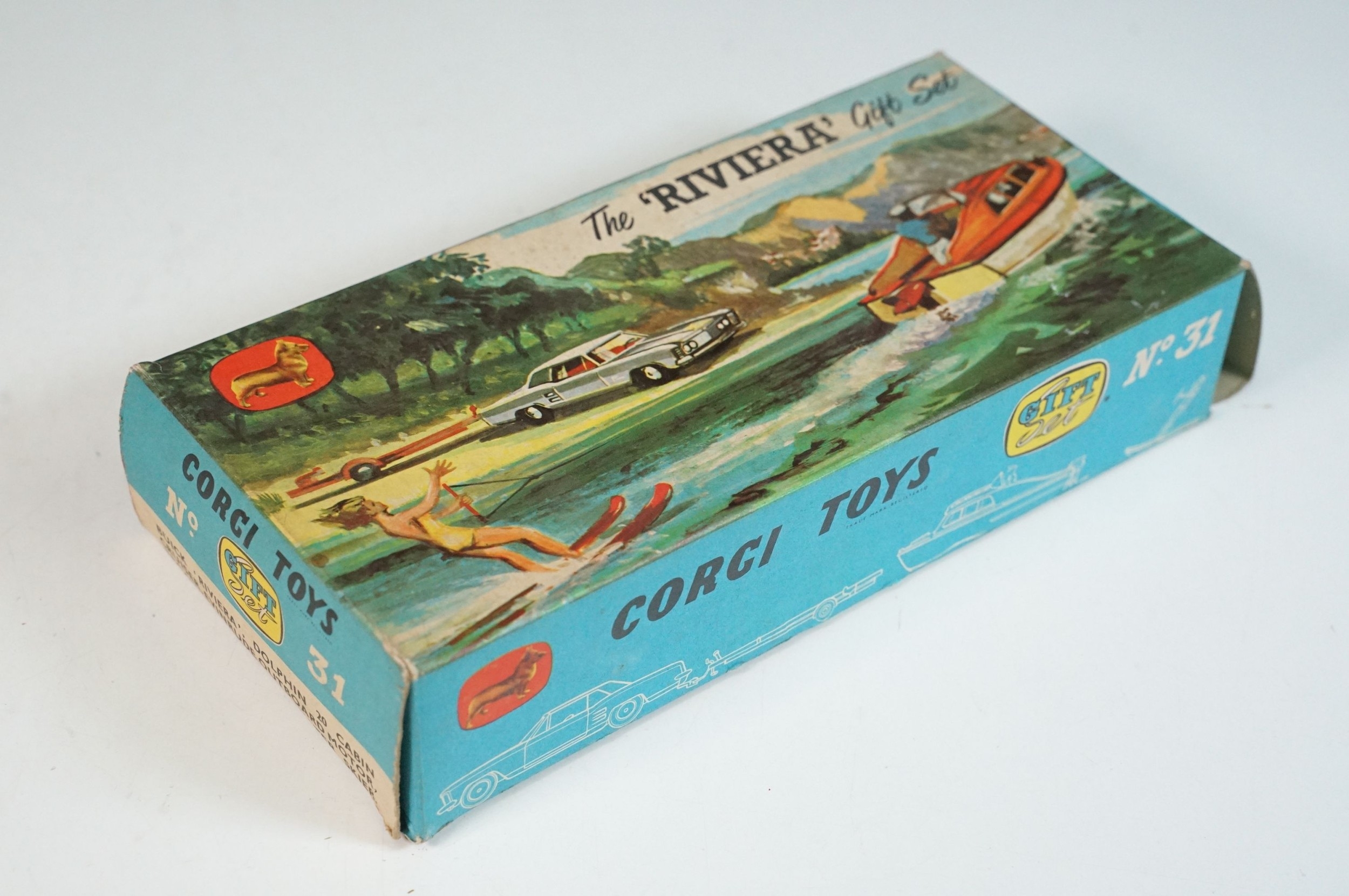 Boxed Corgi The Riviera Gift Set No 31 diecast model, with Buick Riviera, Dolphin 20 Cabin Cruiser, Evinrude Outboard Motor Brooklands Trailer and water skier figure (missing skis), diecast showing play wear, box a touch tatty