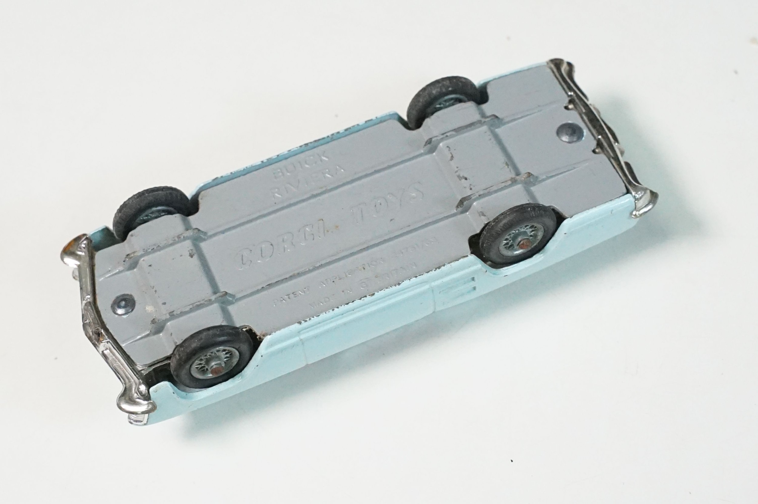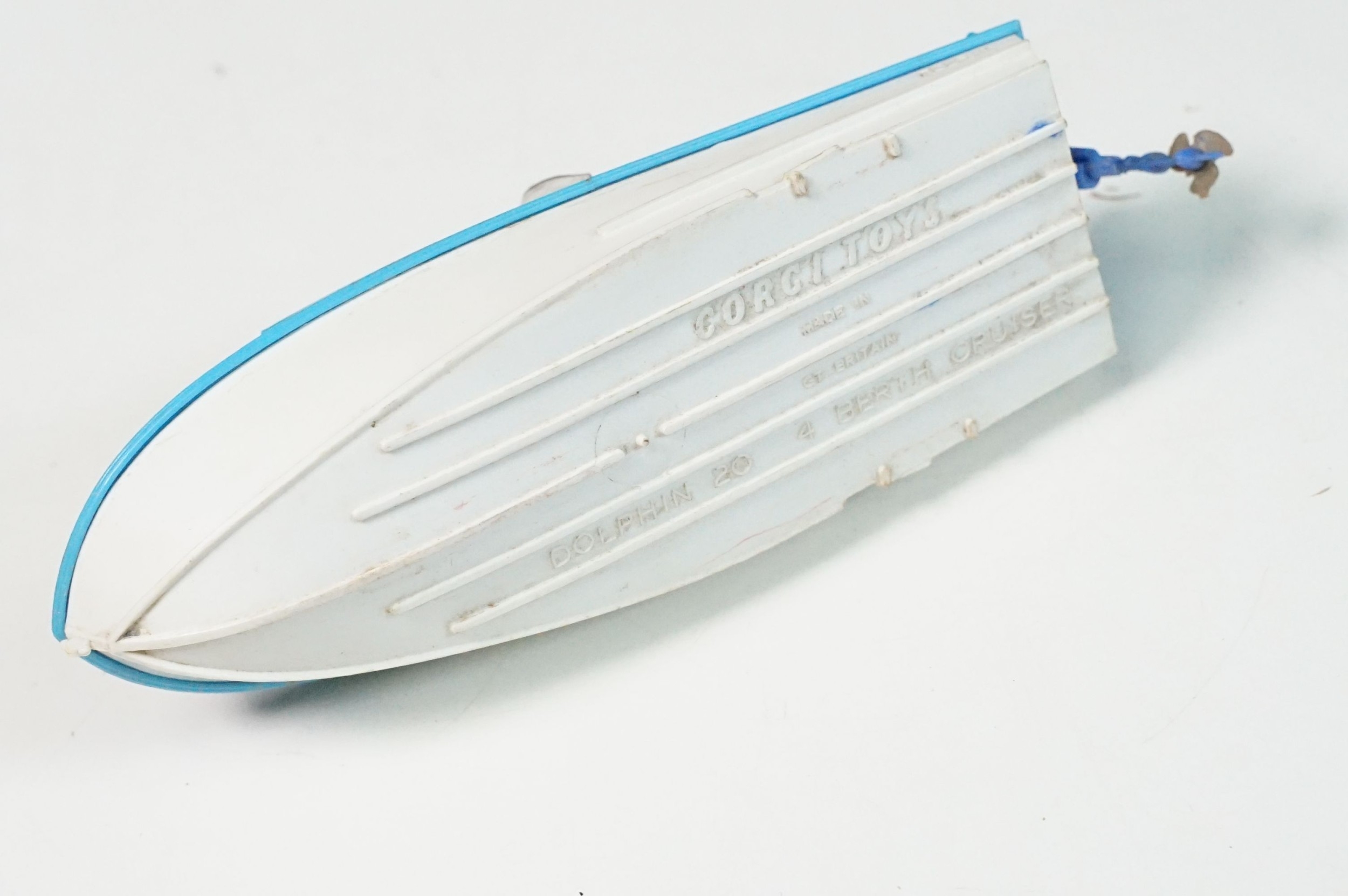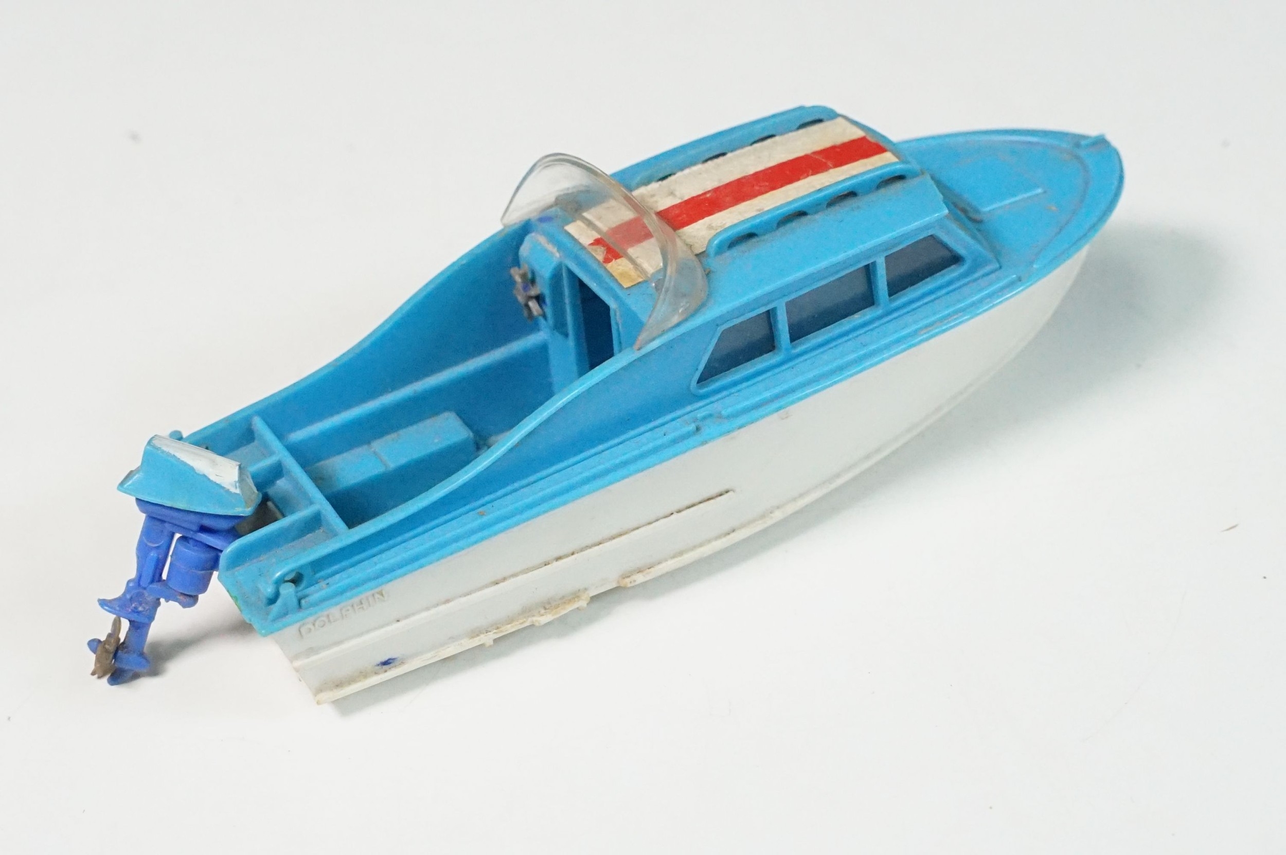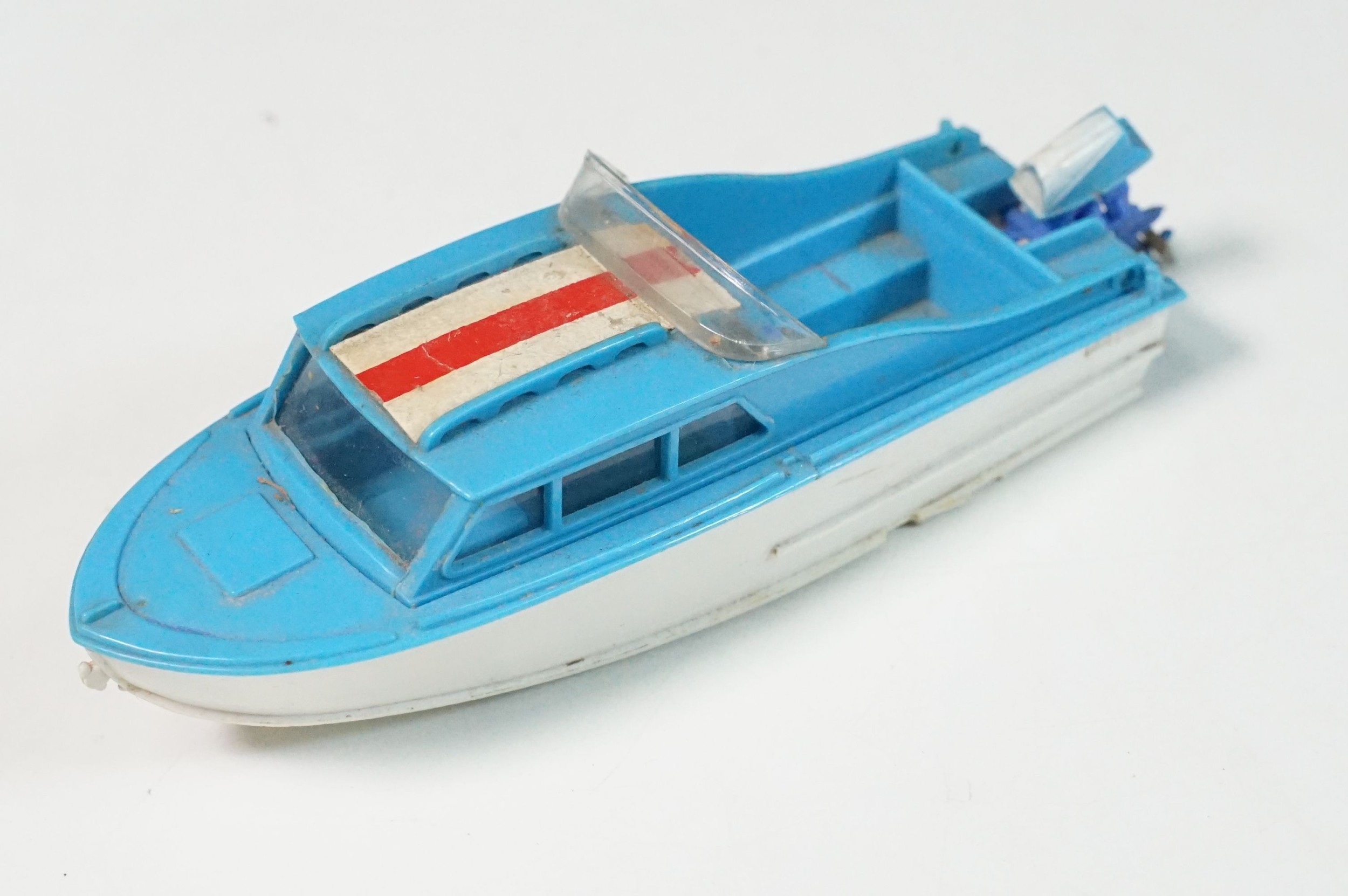 Boxed Corgi The Riviera Gift Set No 31 diecast model, with Buick Riviera, Dolphin 20 Cabin Cruiser, Evinrude Outboard Motor Brooklands Trailer and water skier figure (missing skis), diecast showing play wear, box a touch tatty
