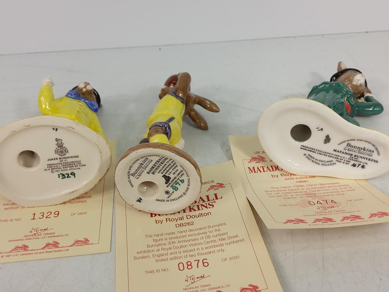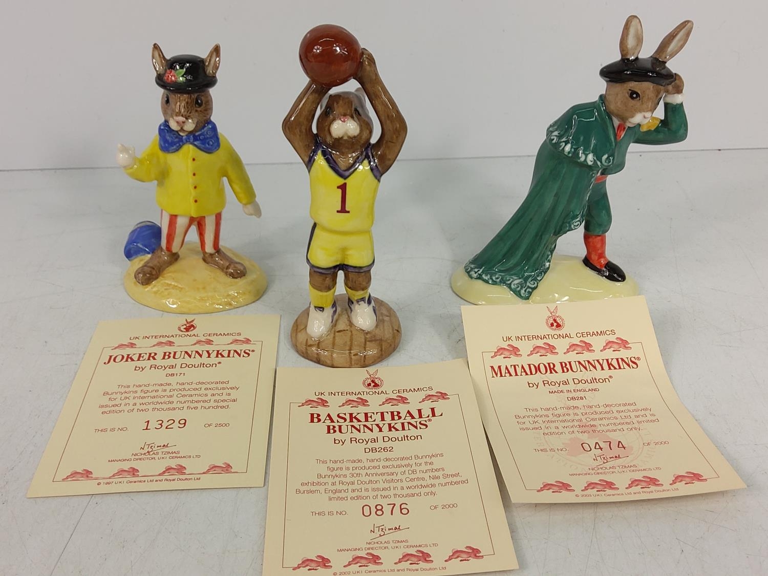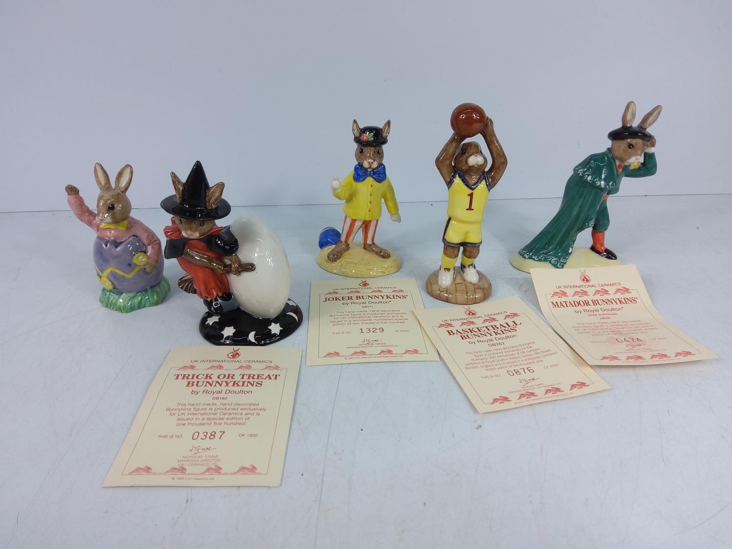 5 various boxed Bunnykin figures, Joker DB171, Basketball DB262, Matador DB281, Trick or Treat DB162 & Easter Surprise DB225, most with certificates
