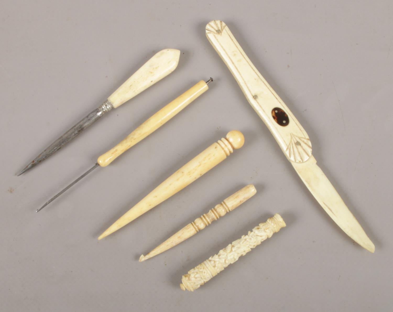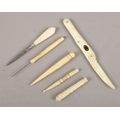 A small collection of ivory oddments. To include folding fruit knife and button hook.