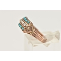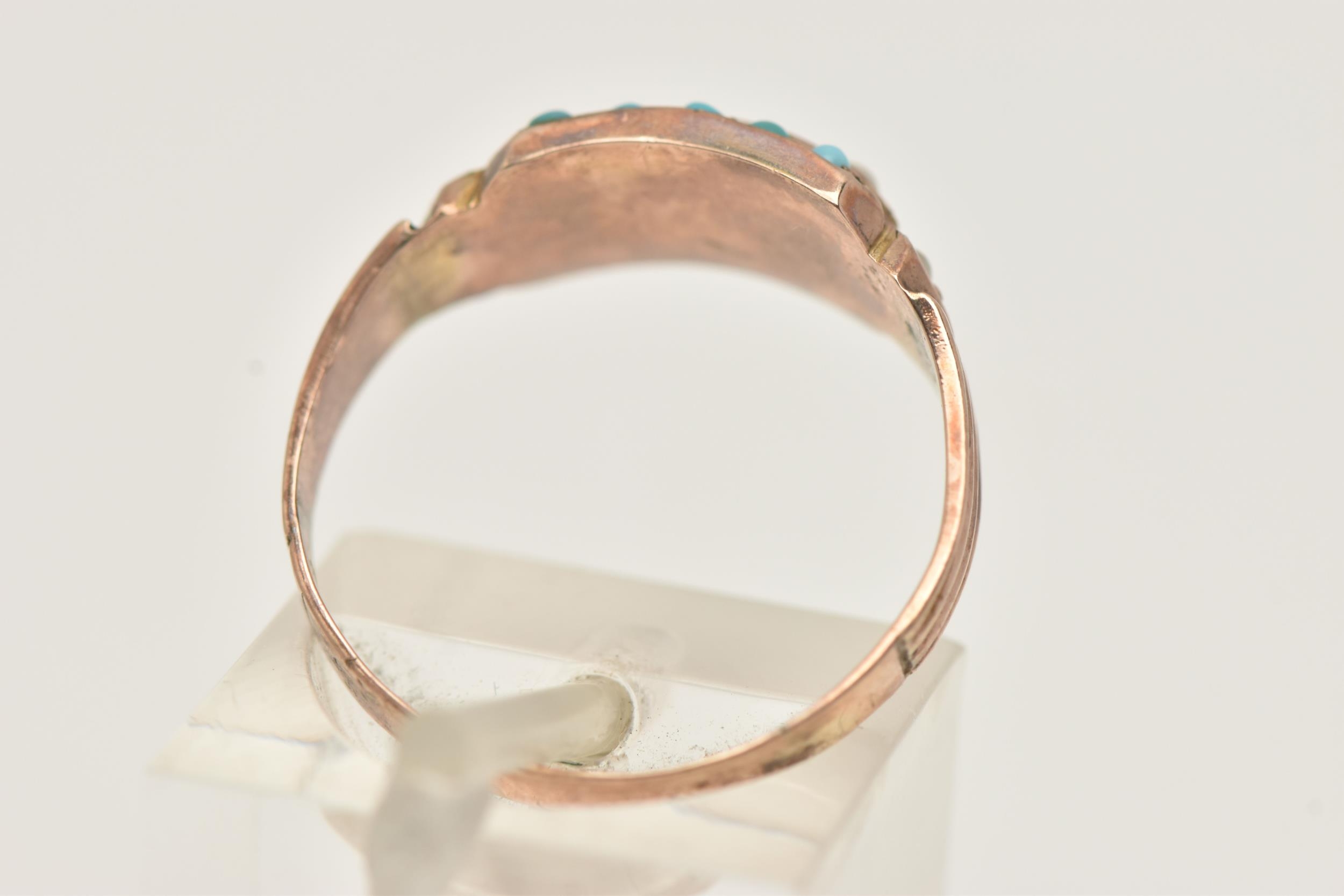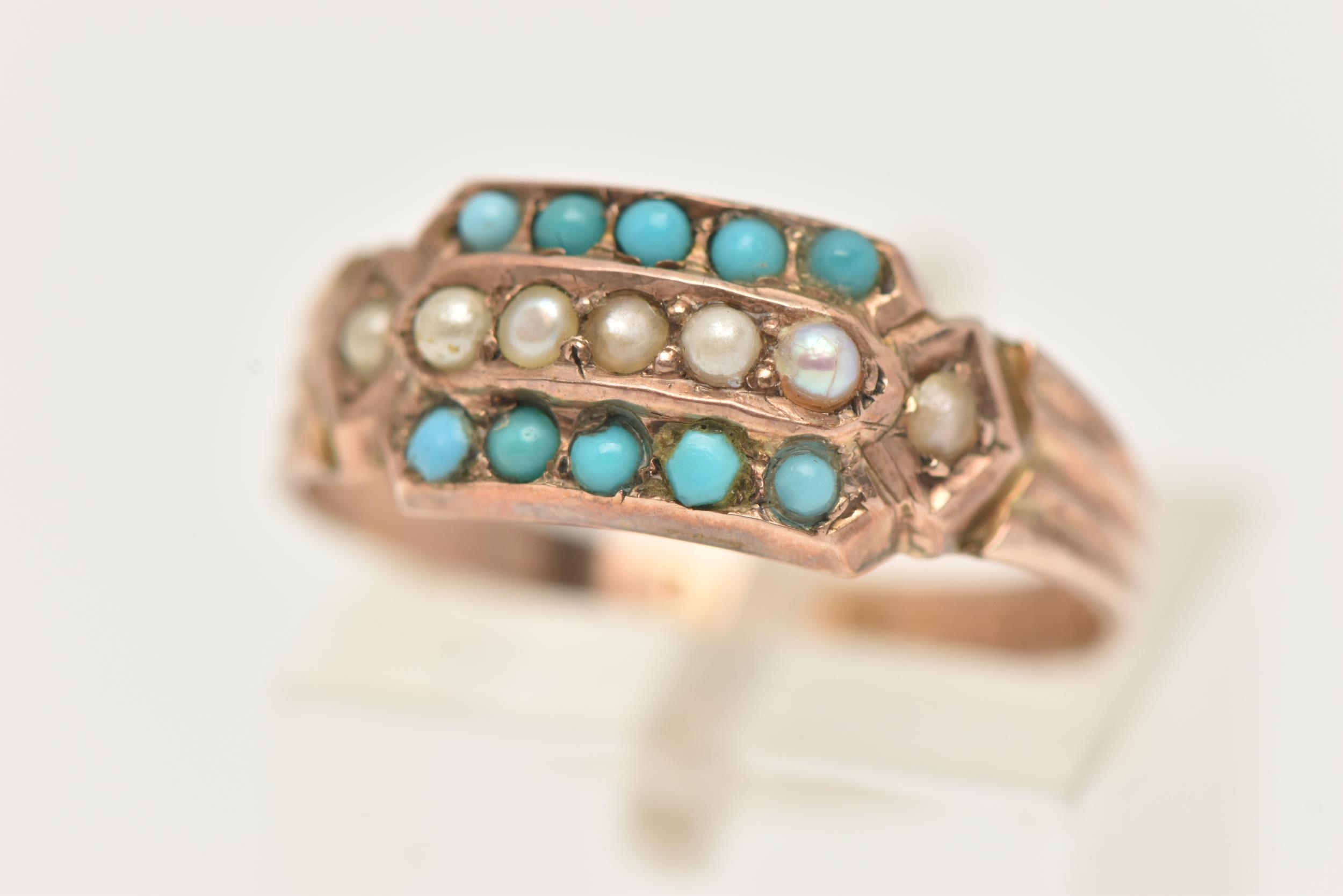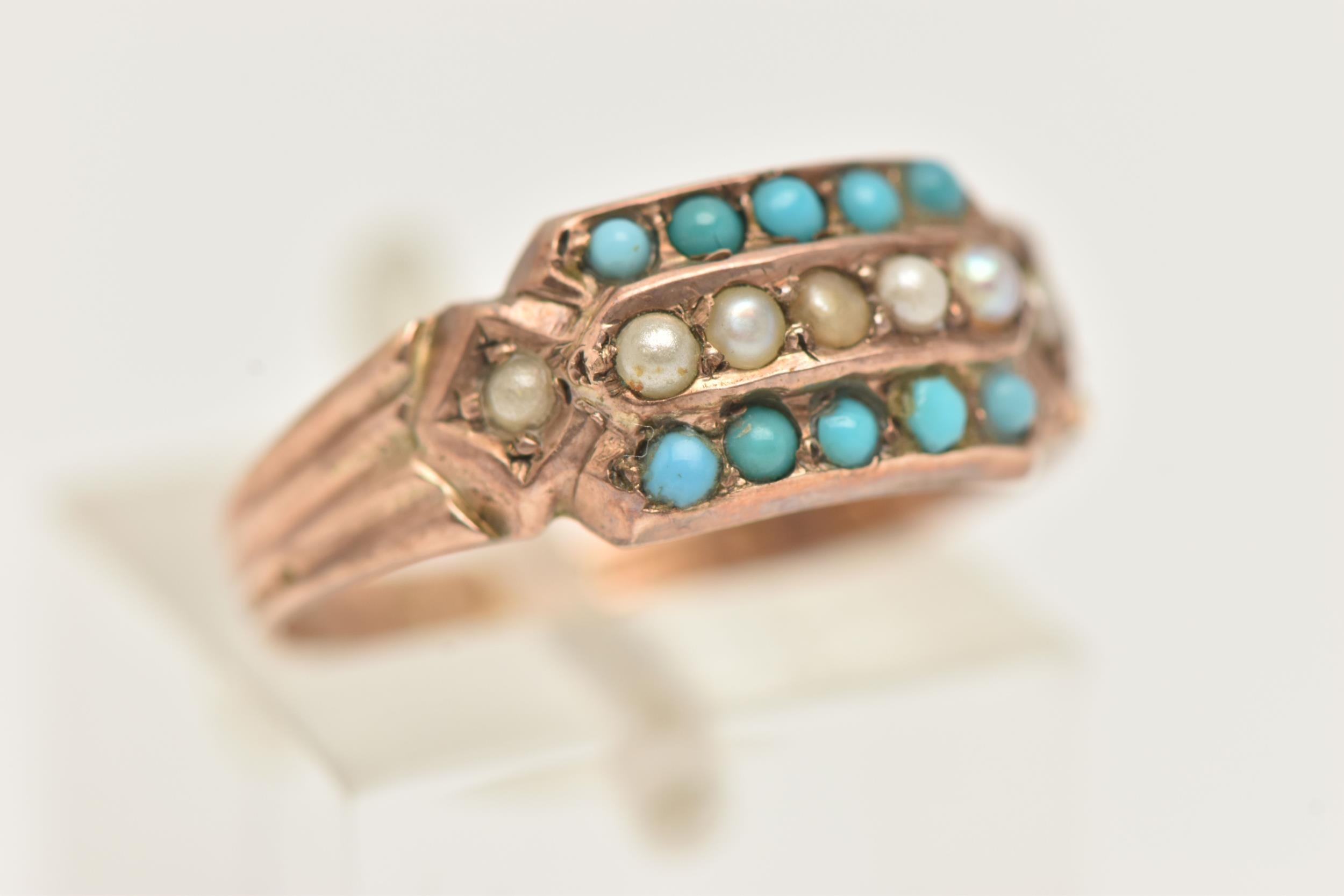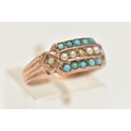 A LATE VICTORIAN 9CT GOLD TURQUIOSE AND SPLIT PEARL RING, set with a central row of small split pearls within two rows of small turquoise cabochons, textured shoulders leading onto a polished band, hallmarked 9ct Birmingham 1879, ring size N 1/2, approximate gross weight 1.8 grams (condition report: general light wear, would benefit from a gentle clean and polish, signs of a previous ring size alteration)