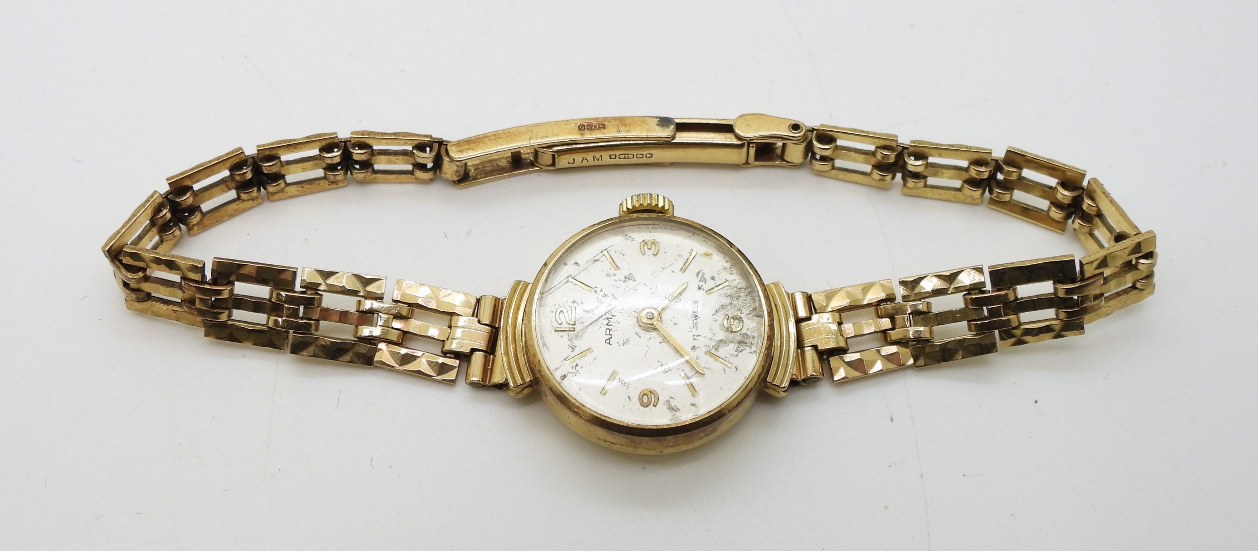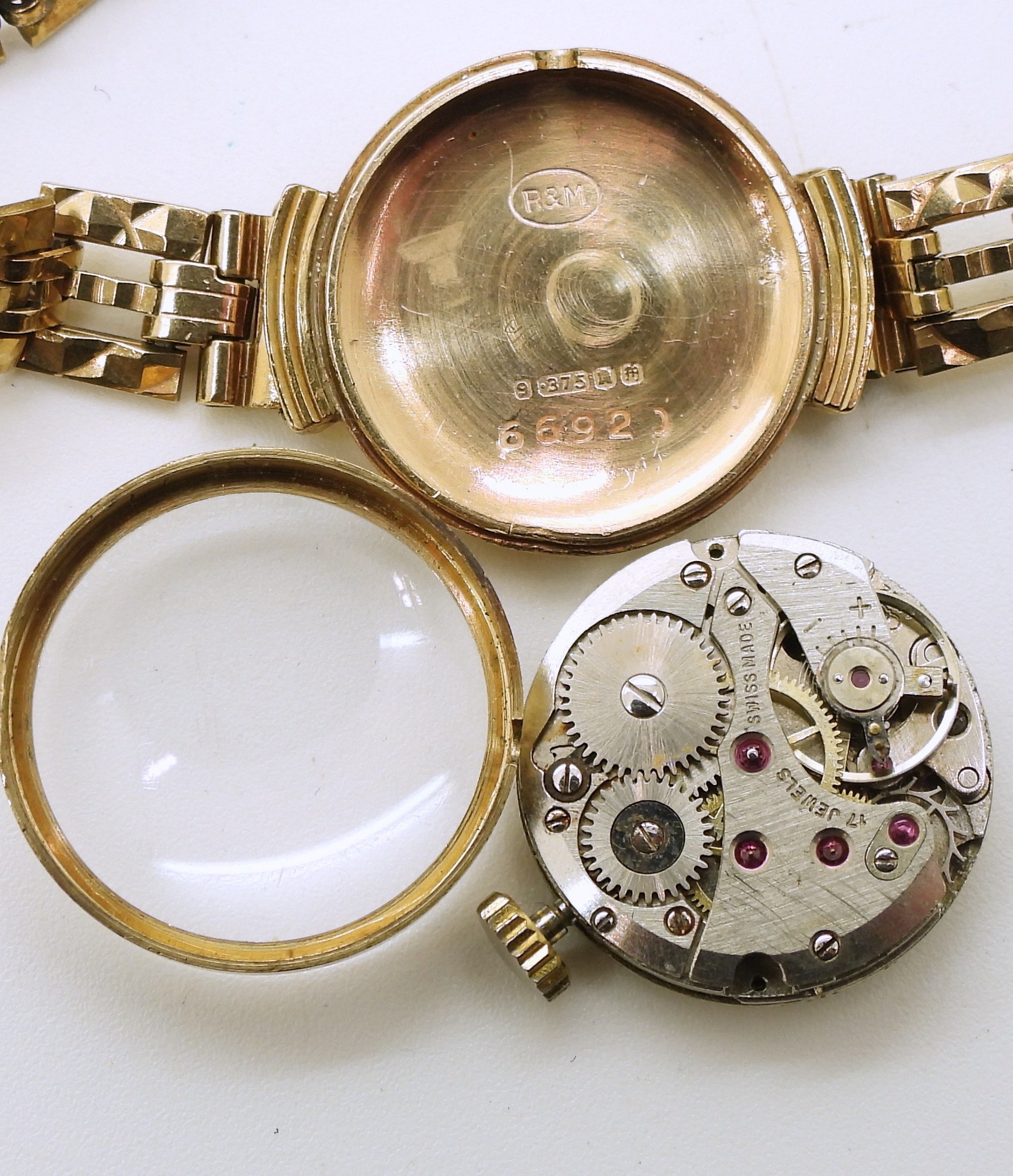 A 9ct gold ladies Swiss made 17 Jewel wristwatch, length 18.5cm, weight without mechanism 10.7gms