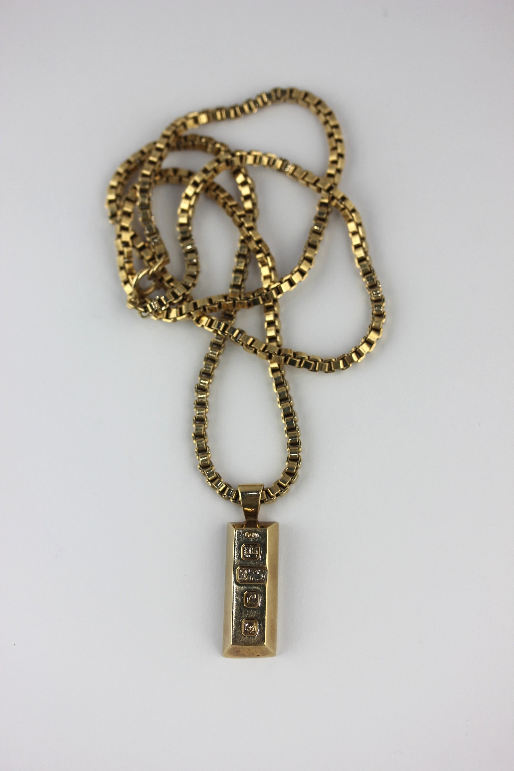 A 9ct gold rectangular pendant ingot with a 9ct gold square link neck chain on a bolt ring clasp detailed 9k, weight 46.9g