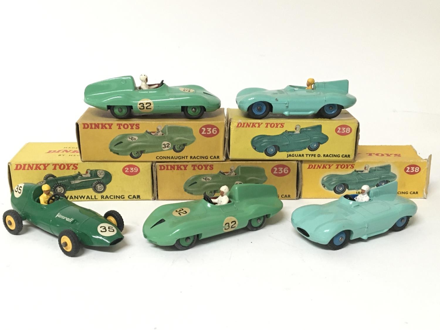 Dinky toys, #239 Vanwall racing car, #238 Jaguar type D racing cars x2 and #236 Connaught racing car x2 , boxed
