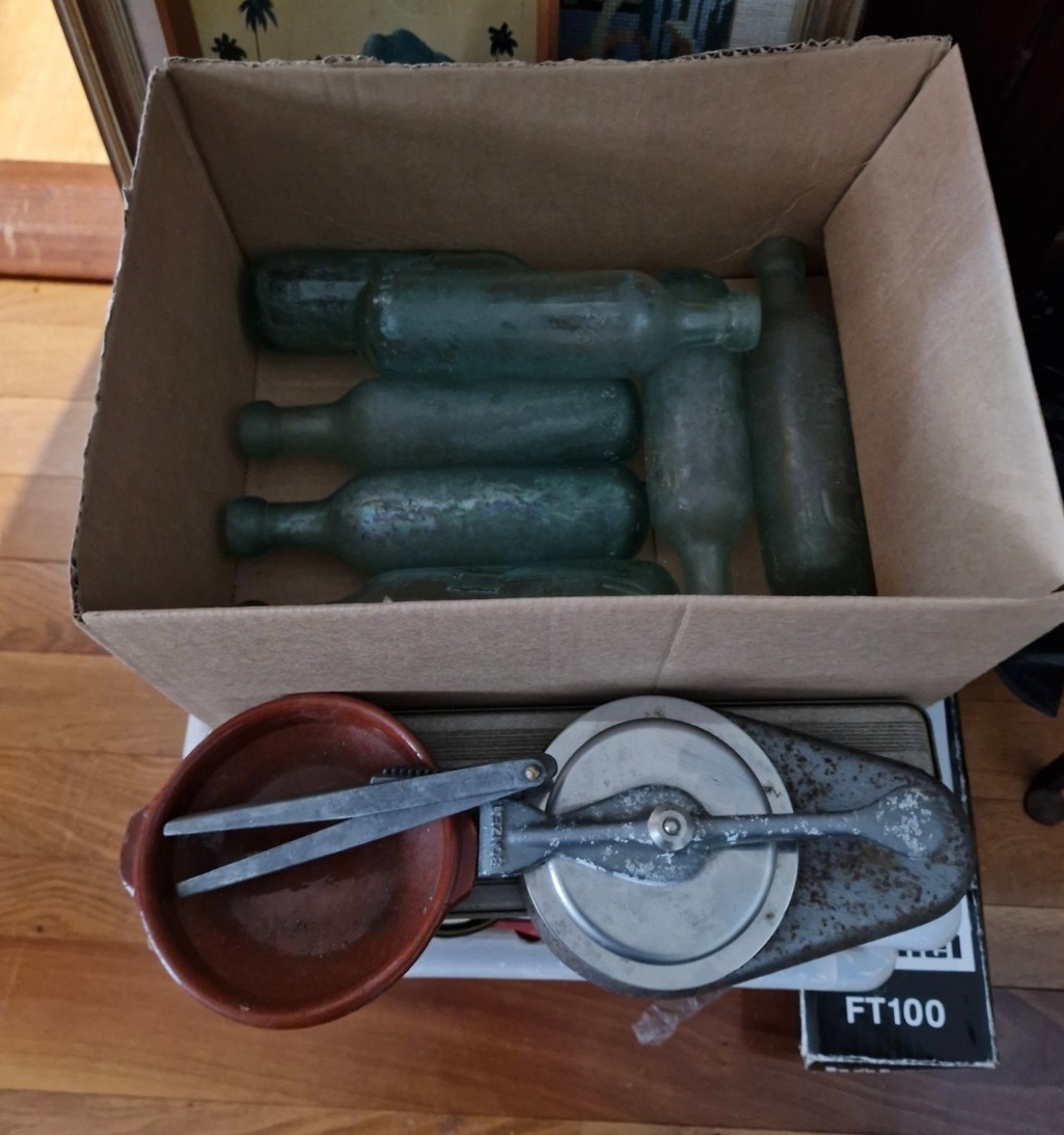 Mixed items - torpedo bottles, a 1960s burger patty press bow and garlic crusher.