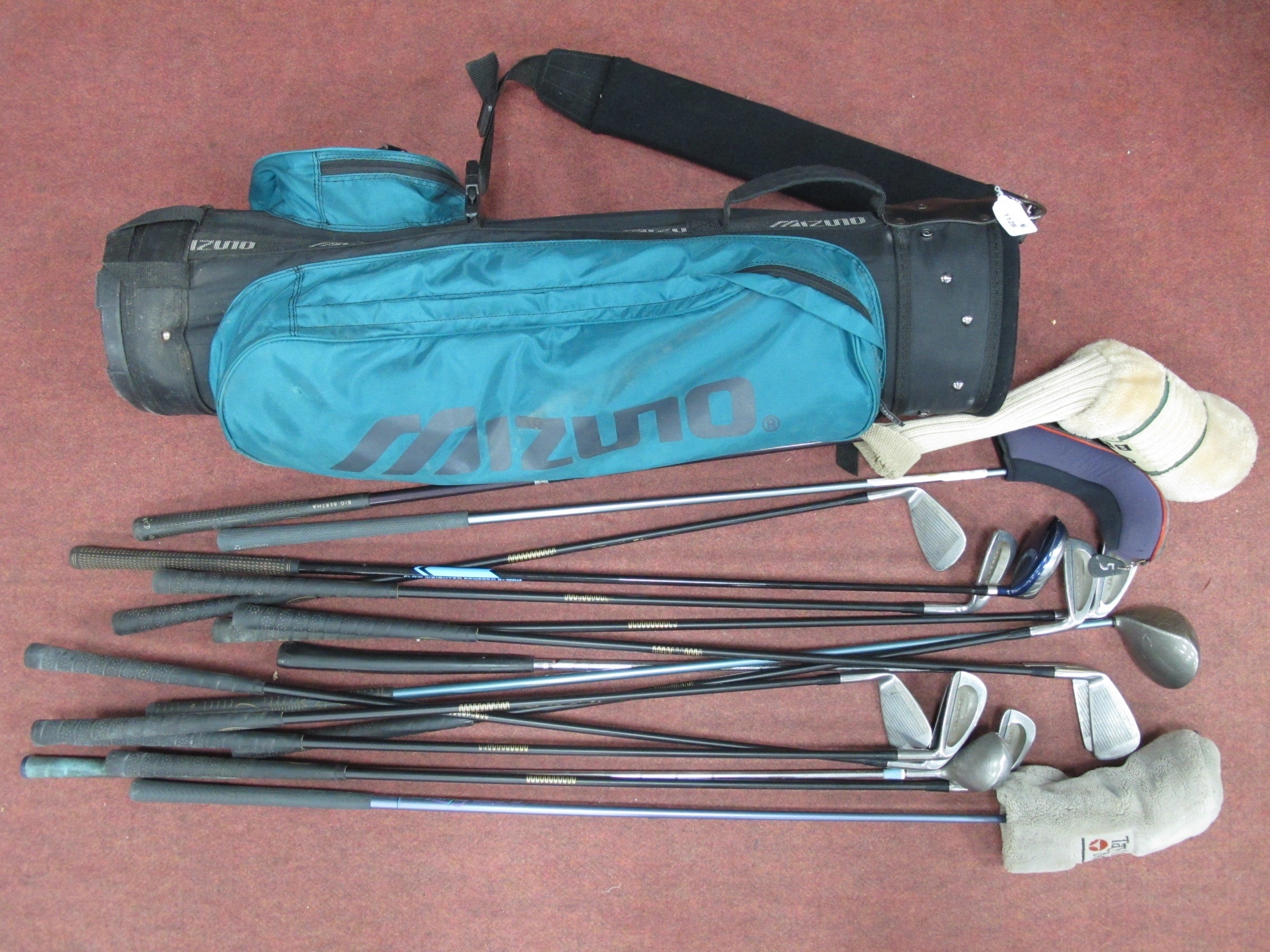 Golf Clubs and Balls in a Mizuno Green Carrier Bag, including Callaway titanium drivers, Taylor Made and Pro Drive irons with protectors, etc.
