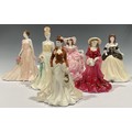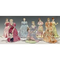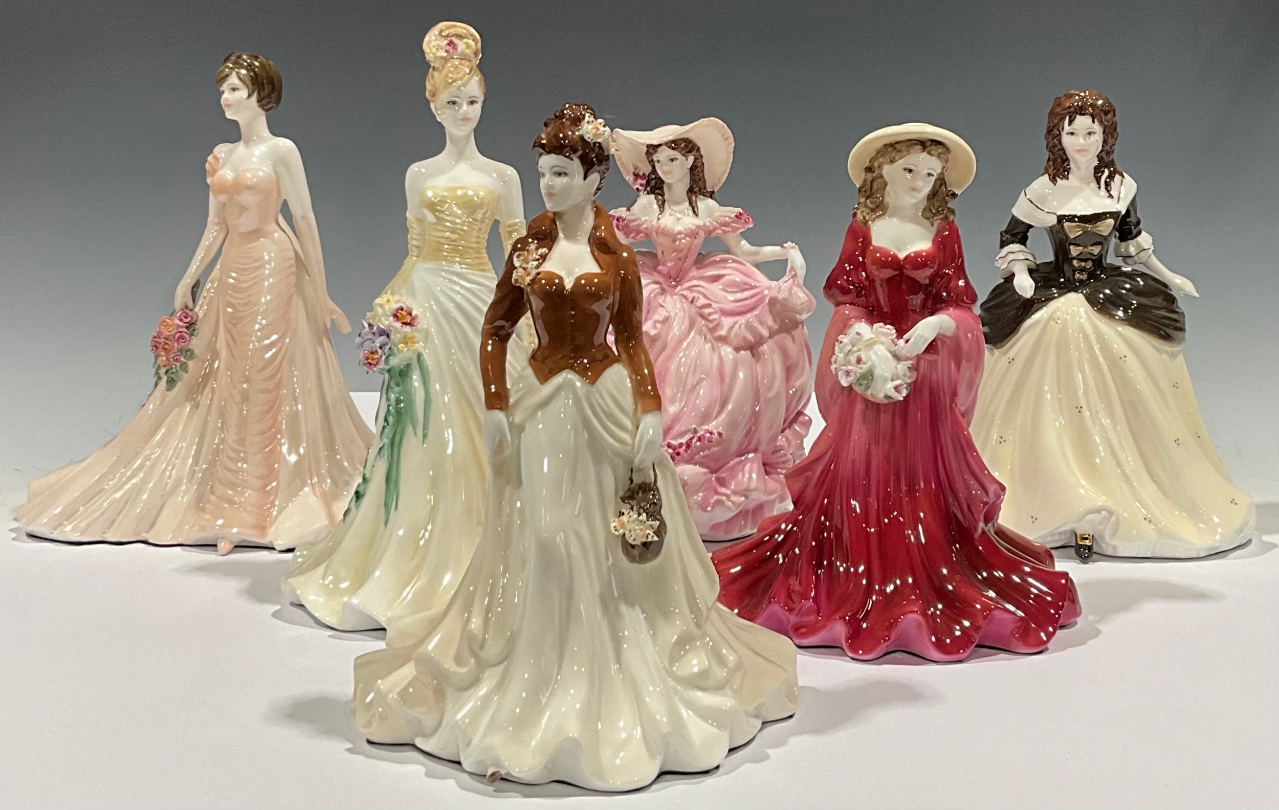 A Coalport figure, Literary Heroines, Rebecca, limited edition 1,020/2,500; another, Moll, limited edition 399/2,500; a Coalport figure, The Modern Bride Collection, Paris, limited edition 609/2,000; another, Vienna, limited edition 342/2,000; a Coalport figure, Four Seasons, Winter, limited edition of 2,000; another, Autumn (6)