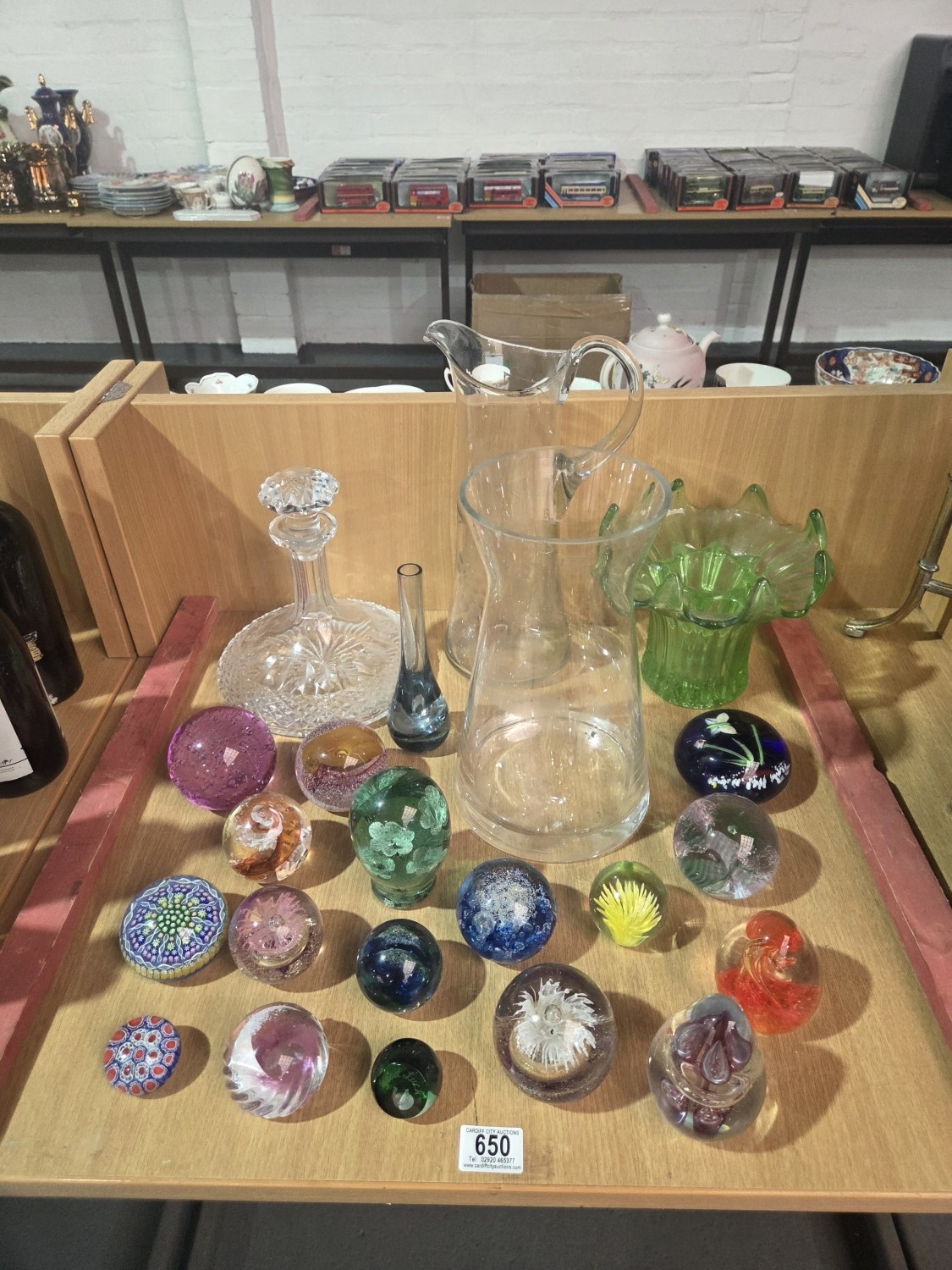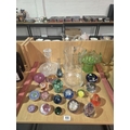 A cut glass decanter, LSA vase with a selection of paperweig...