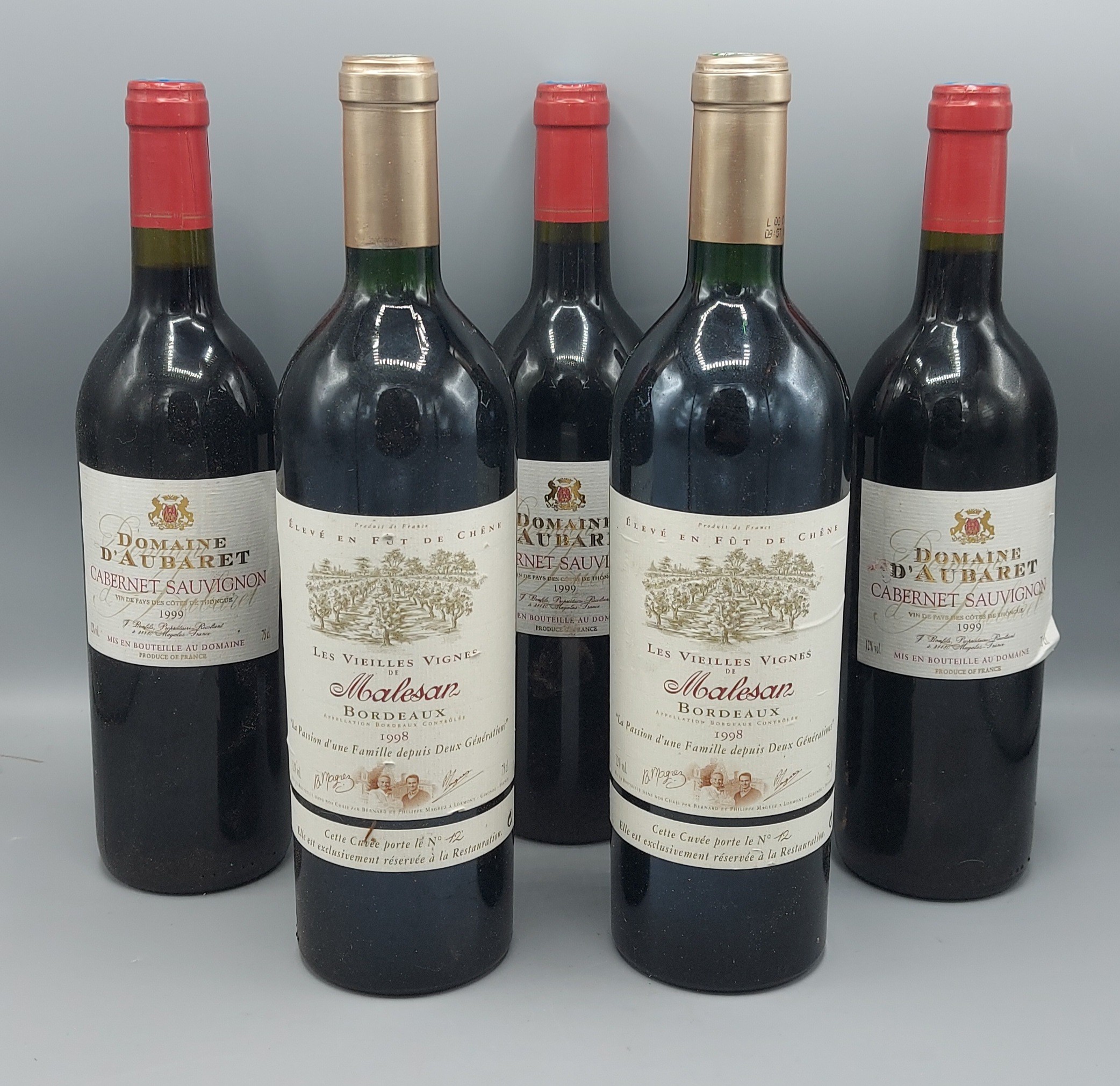 Two bottles of Les Vieilles Vignes de Malesan Bordeaux, dated 1998, red wine together with three bottles of Domaine D'Aubaret Cabernet Sauvignon, dated 1999, red wine