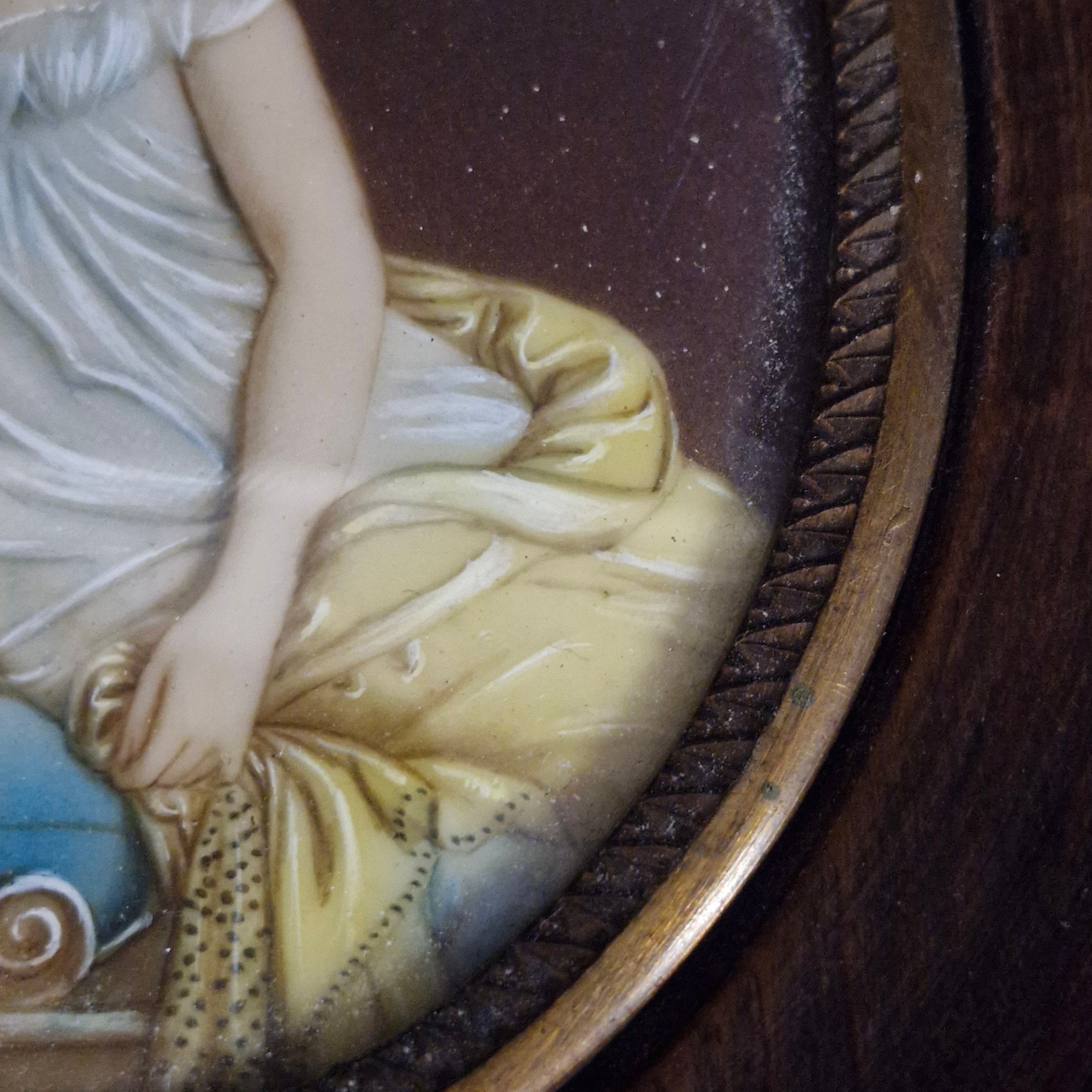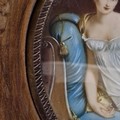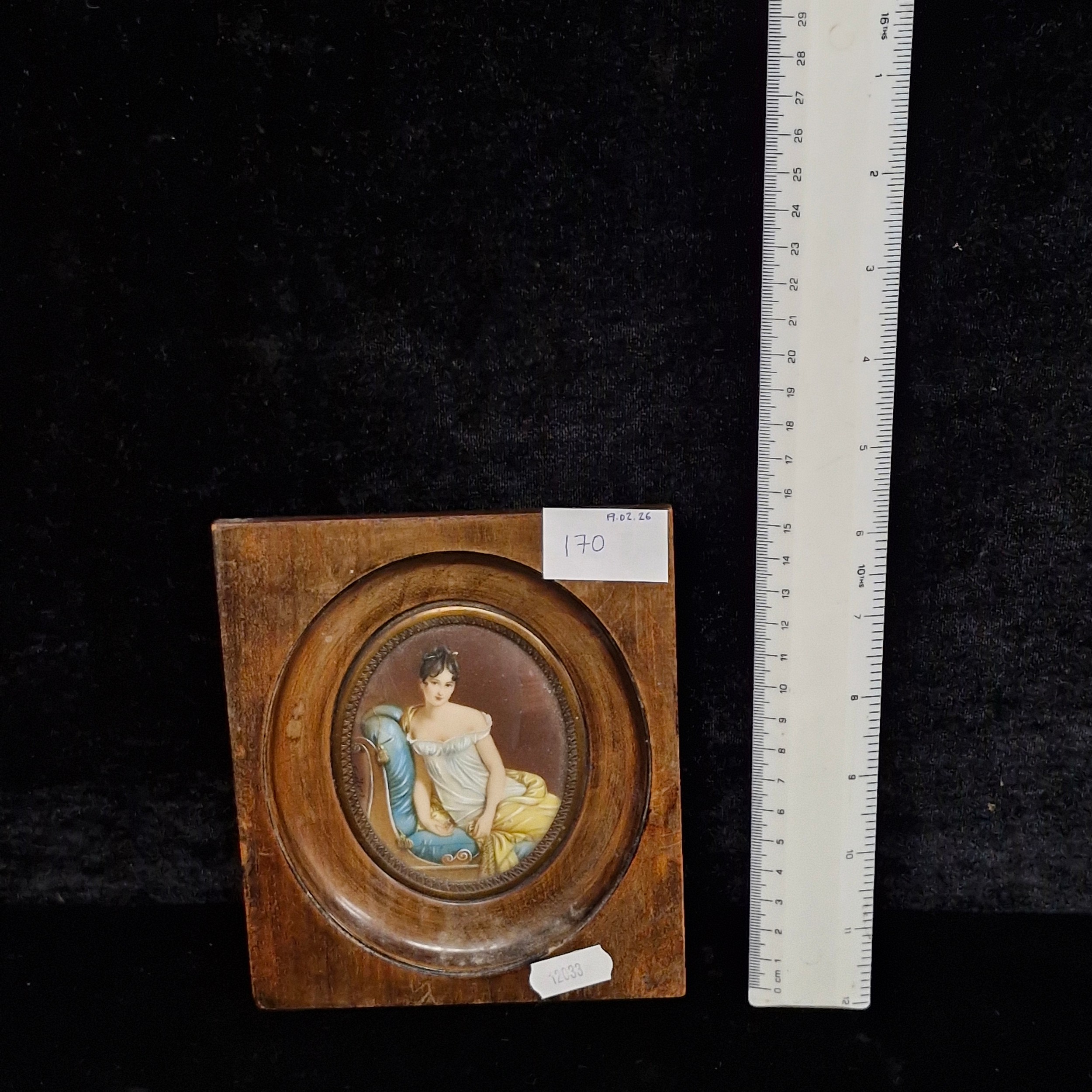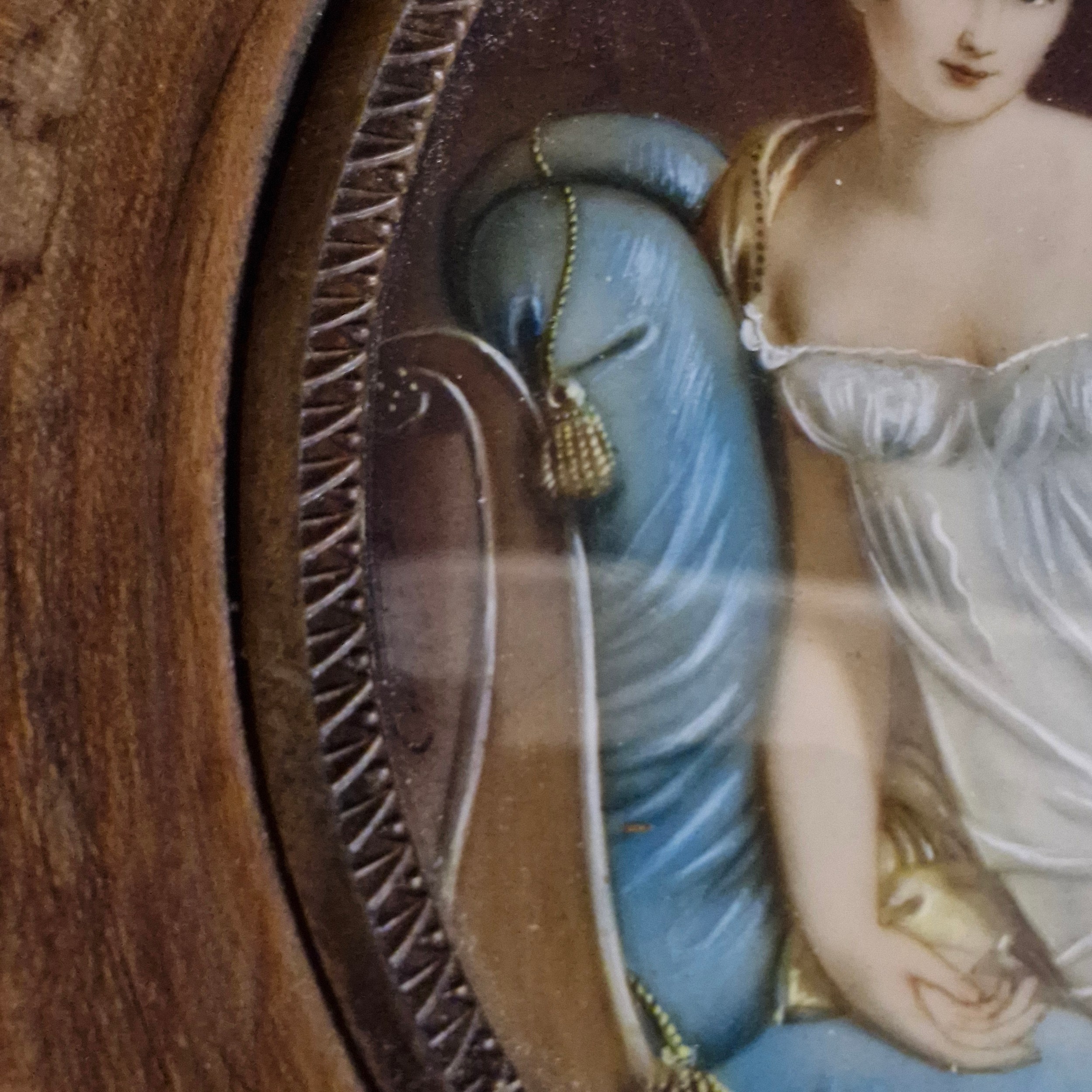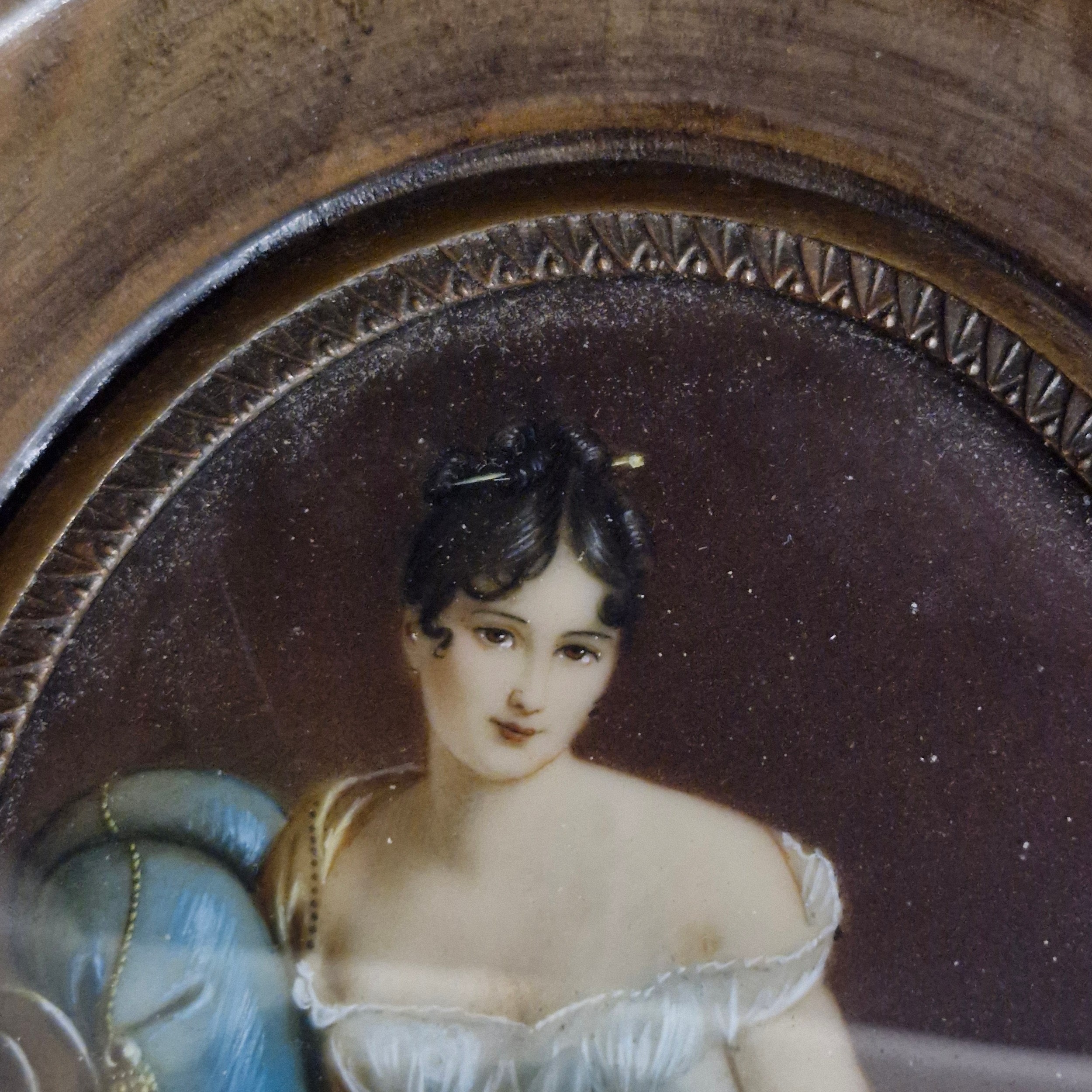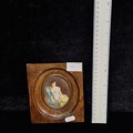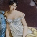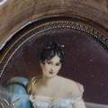 Star Lot: A beautiful 19th century miniature oil on board painting. Features 'Jeanne Françoise Julie Adélaïde Récamier', a French socialite whose salon drew people from the leading literary and political circles of early 19th century Paris. Rendered in meticulous and fluid brushstrokes with fine, controlled detailing. Signed. Housed in a wooden frame behind glass.