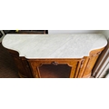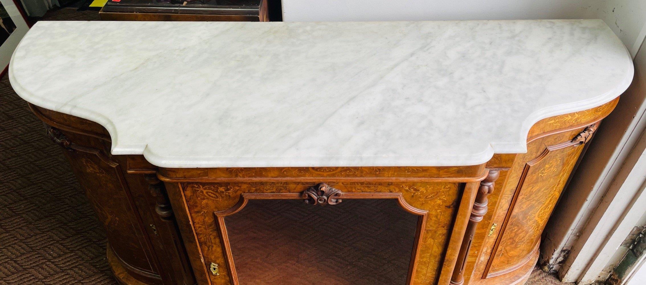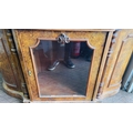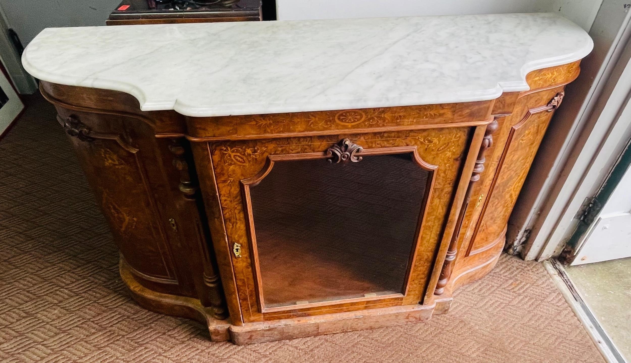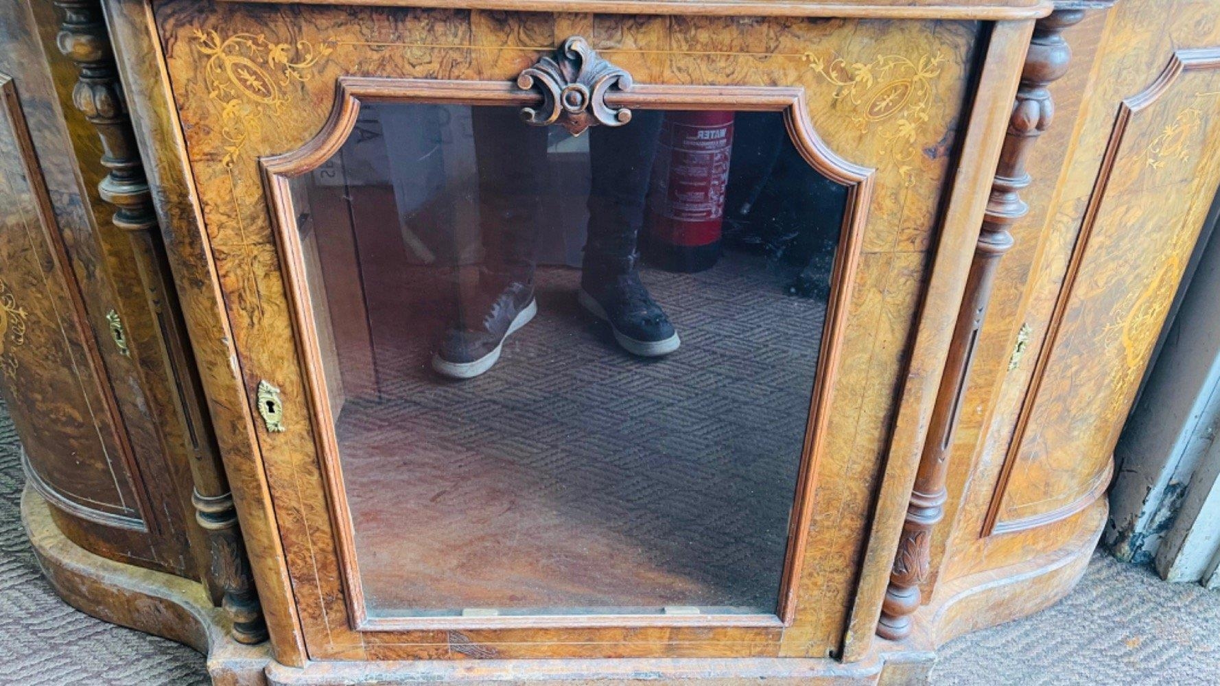 A BEAUTIFUL CREDENZA with walnut and marquetry facade and glazed central panel door with key - three doors in total length 149cm x depth 59cm x height 90cm approx -