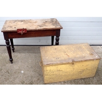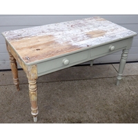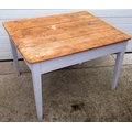 A pine topped kitchen table on painted legs, drawer filled in, 114cm x 92cm