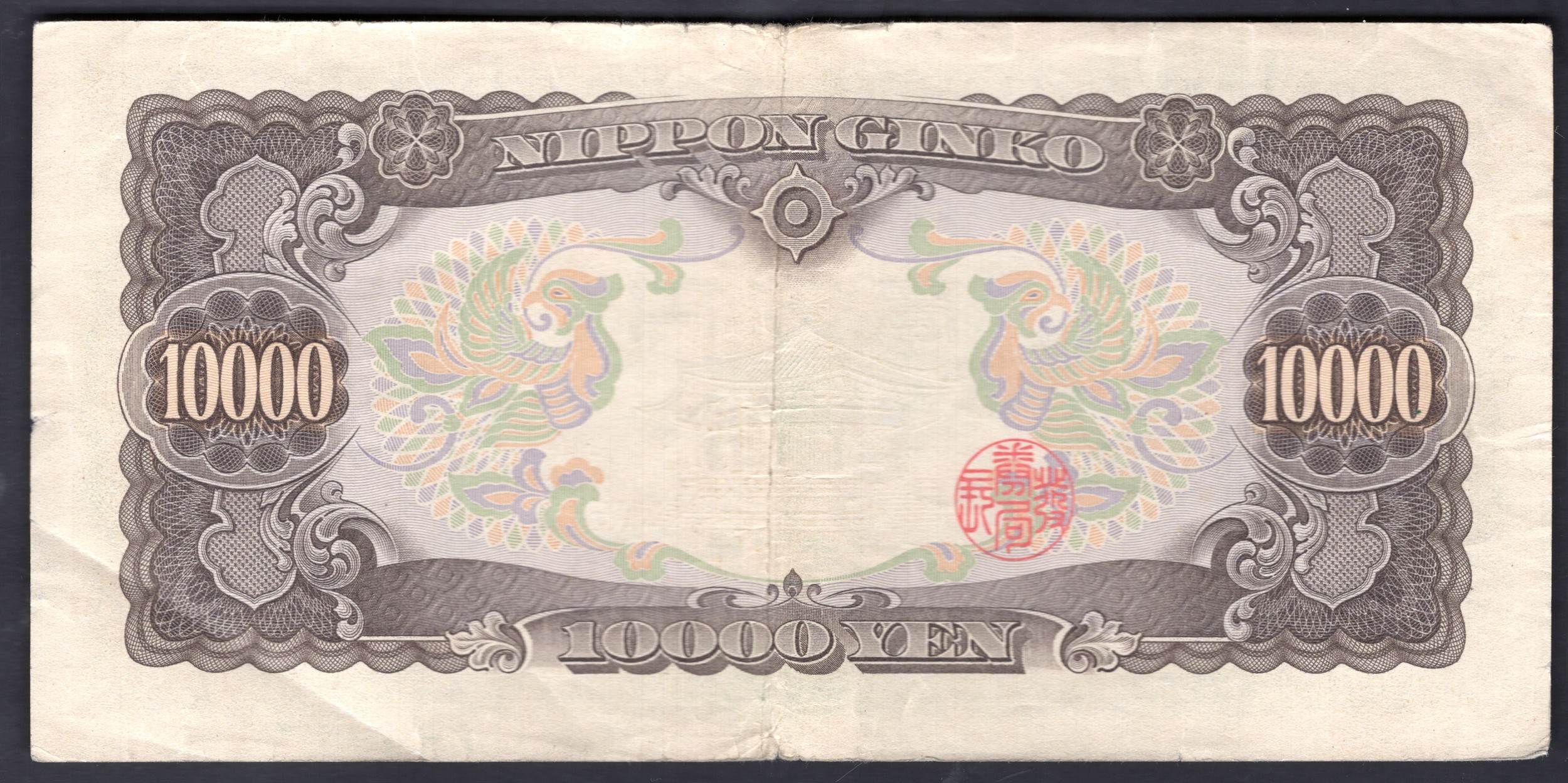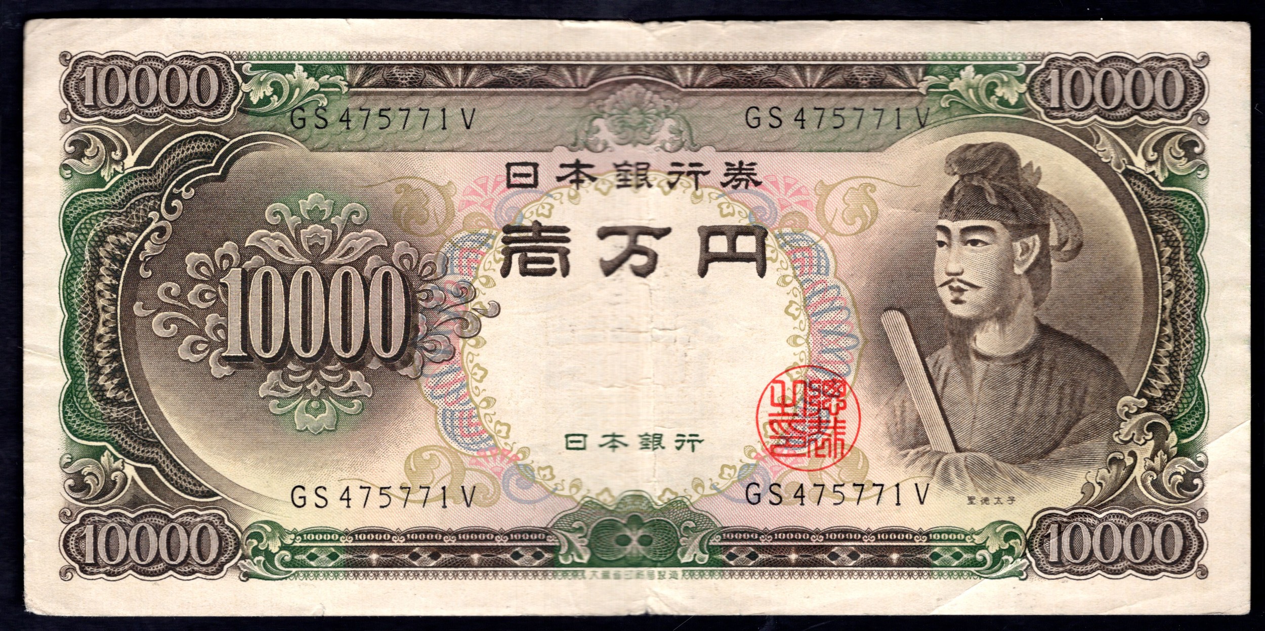 Japan, Nippon Ginko, 10000 yen, (1958), #GS475771V. A few edge nicks, GVF.(P 94b)