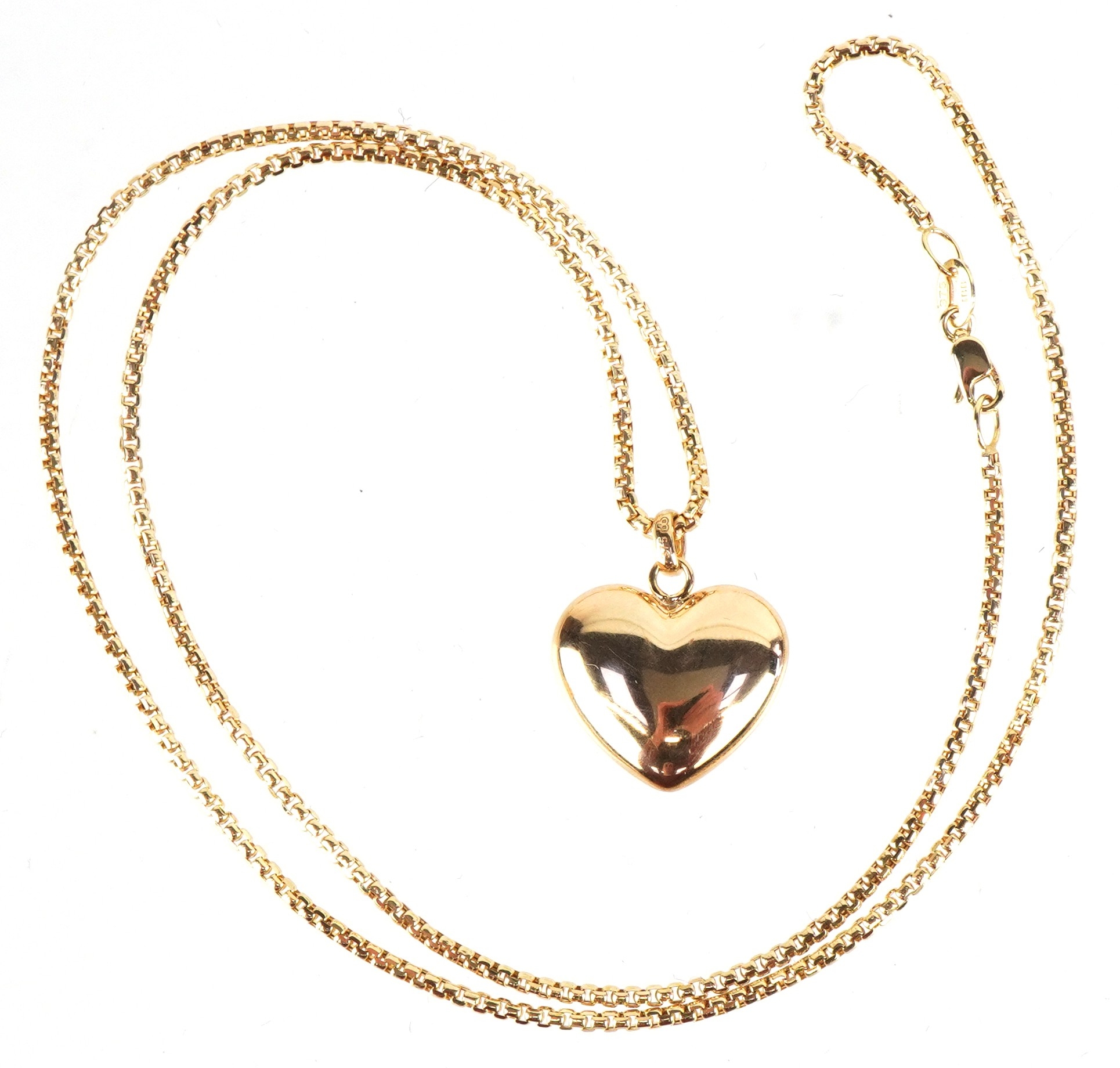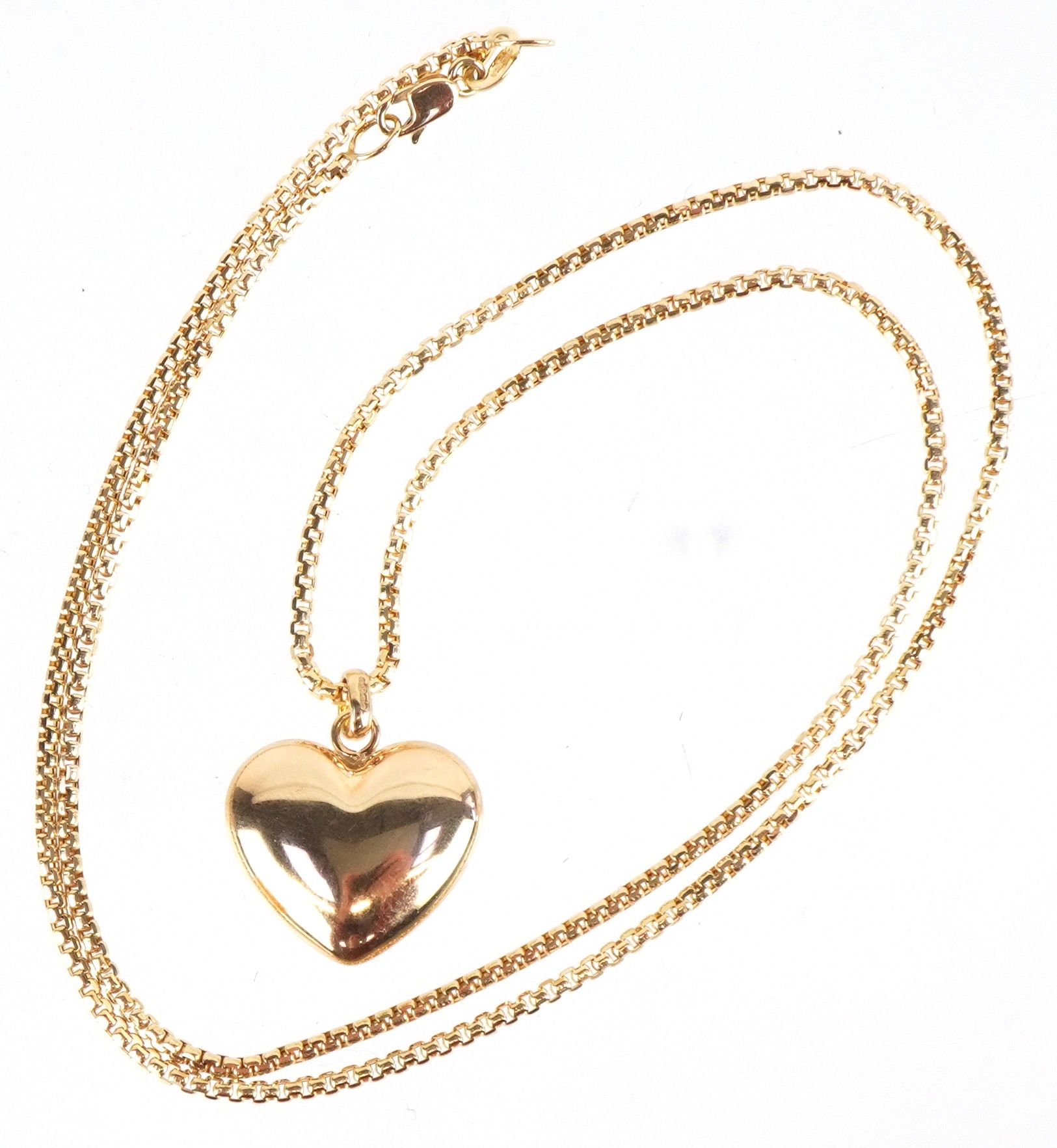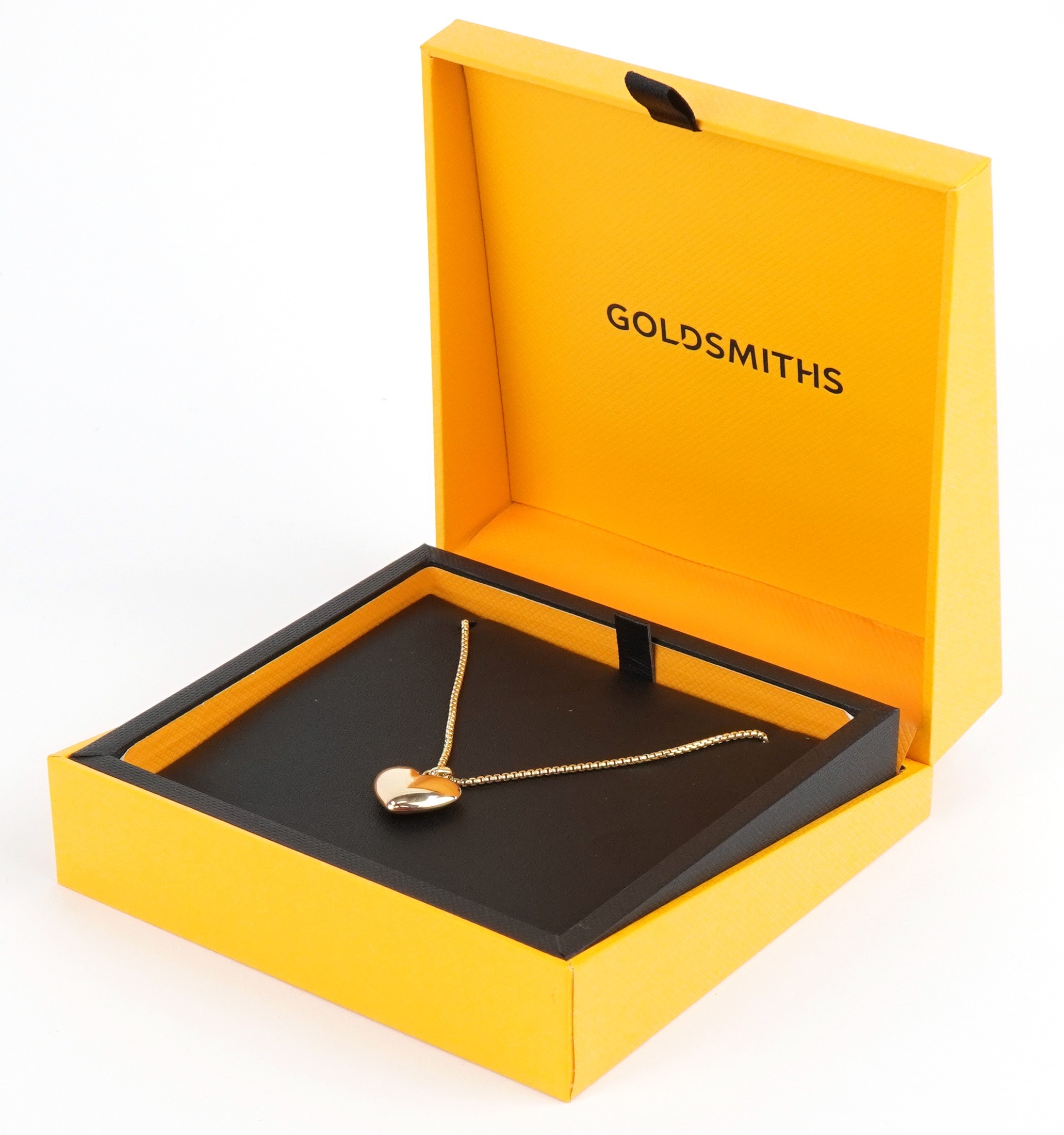An as new 9ct gold love heart pendant on a 9ct gold necklace retailed by Goldsmiths, with box, 2cm high and 46cm in length, total 3.7g.