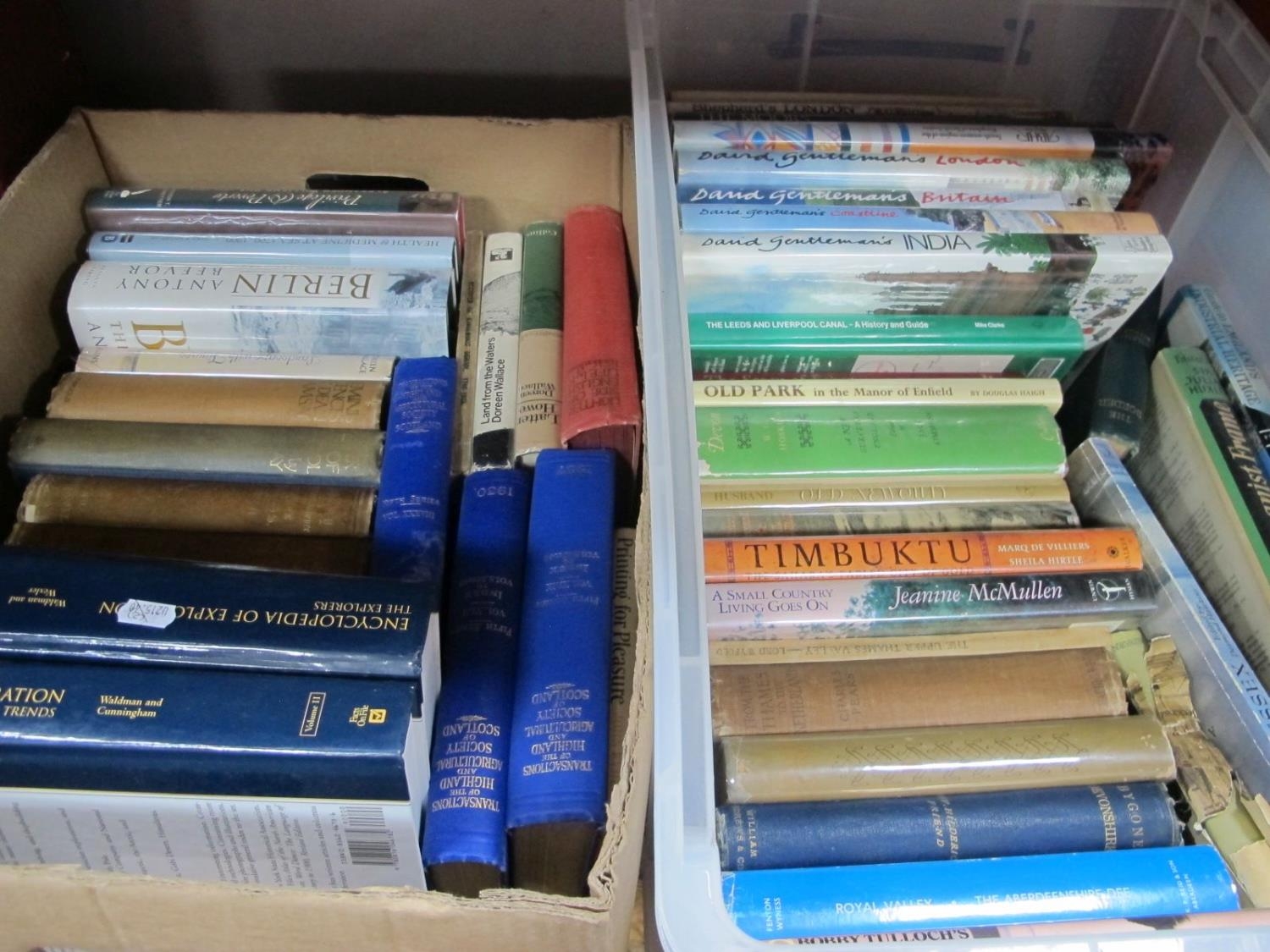 Two Boxes of Travel and Related Books, including 'Encyclopedia of Exploration', Berlin the Downfall', 'Landscape with Figures', etc.