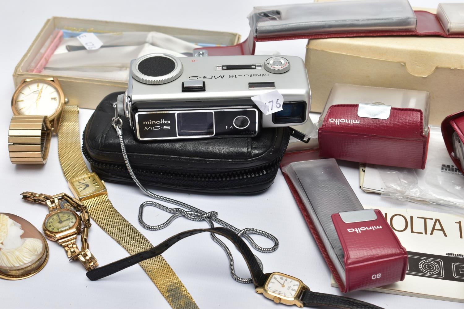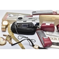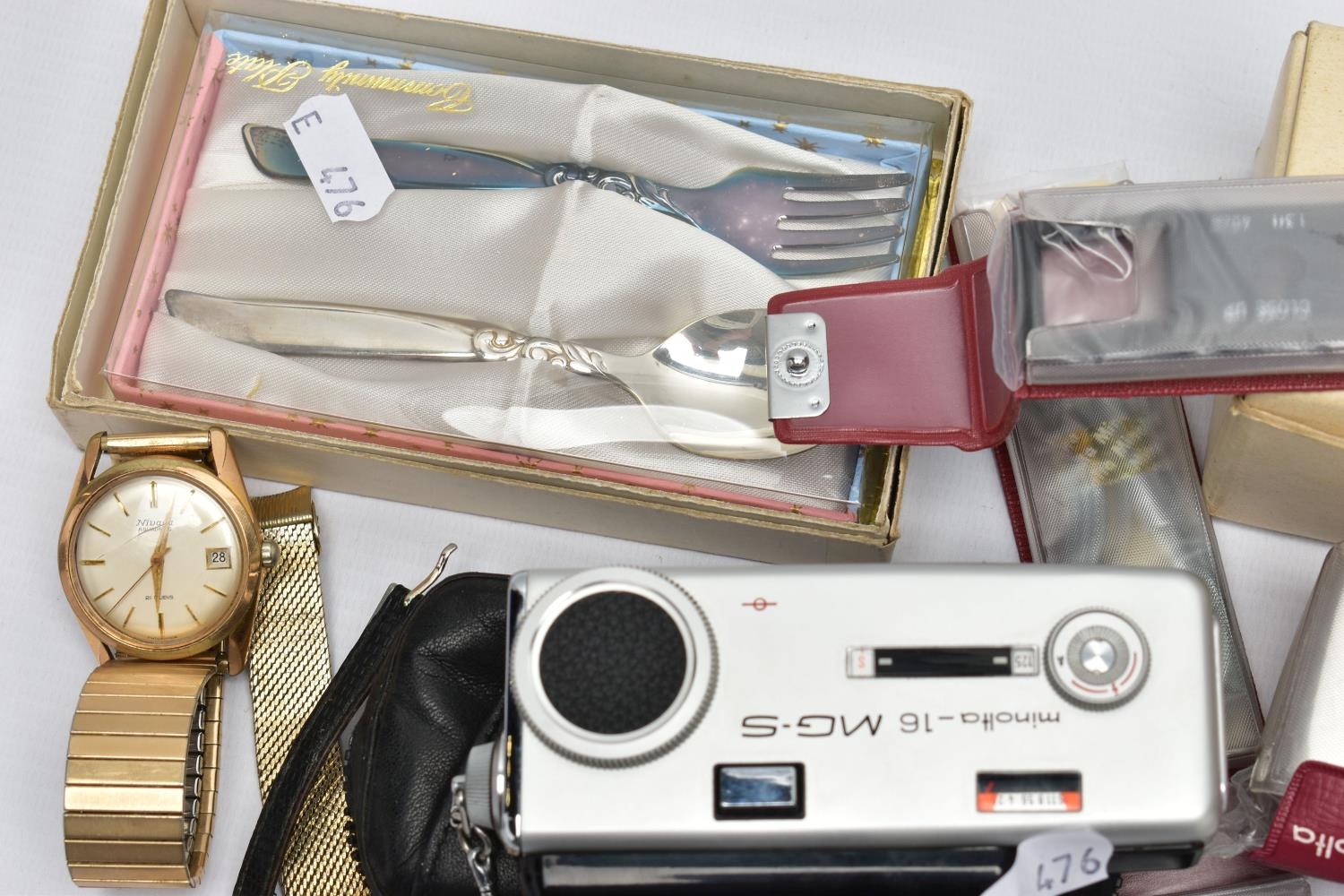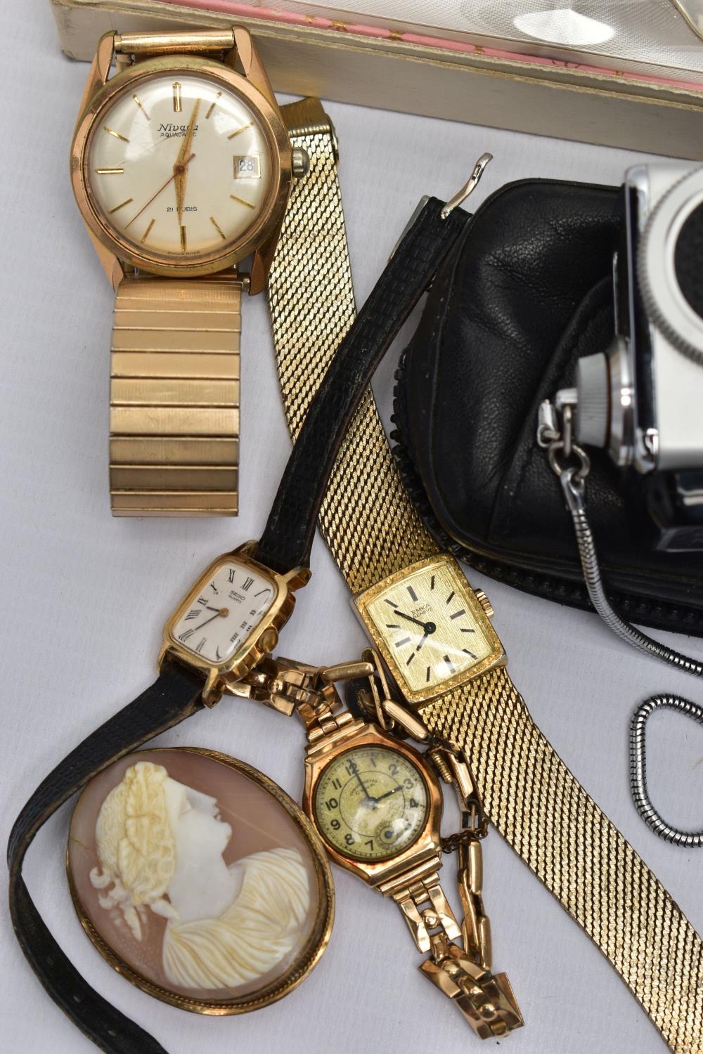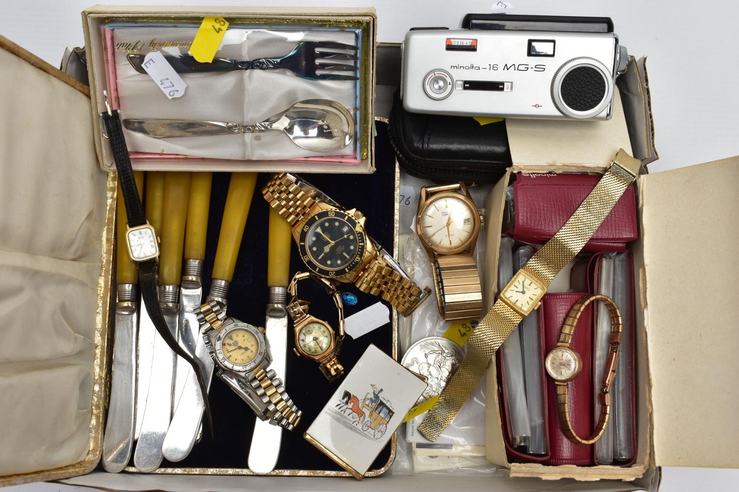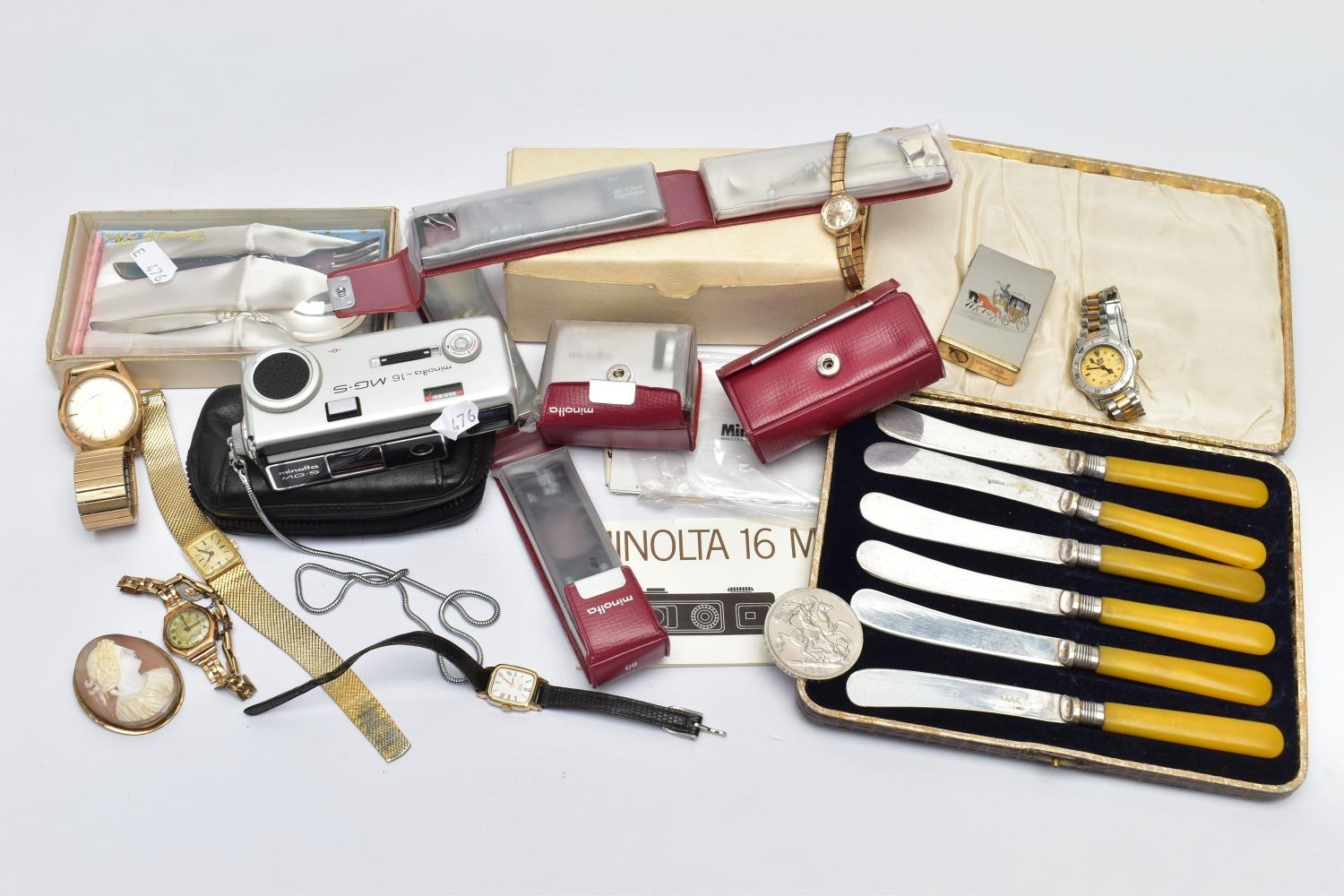 A BOX OF ASSORTED ITEMS, to include a ladies yellow metal wristwatch, AF round discoloured silver dial signed Cyma chronometer Arabic numerals, seconds subsidiary dial at the six oclock position, polished case stamped 14k Swiss control marks, approximate case width 21.2mm, fitted with a rolled gold openwork bracelet with fold over clasp, other ladies and gents fashion wristwatches, a Minolta 16mm camera with accessories, a cased six piece EPNS butter knife set, a boxed community plate christening set, a George VI commemorative five shilling coin, lighter, cameo brooch etc (Condition report:- some watches are replicas)