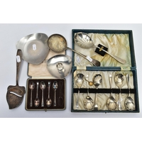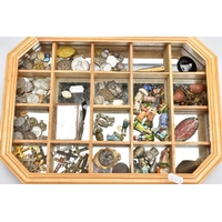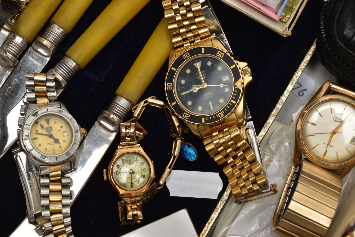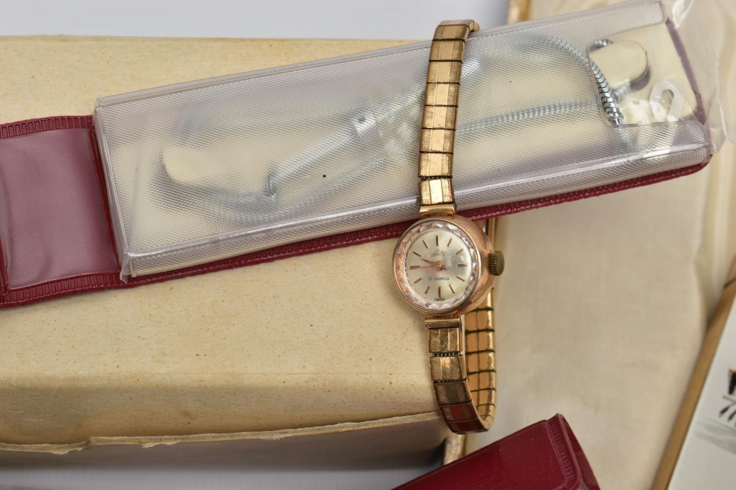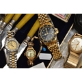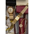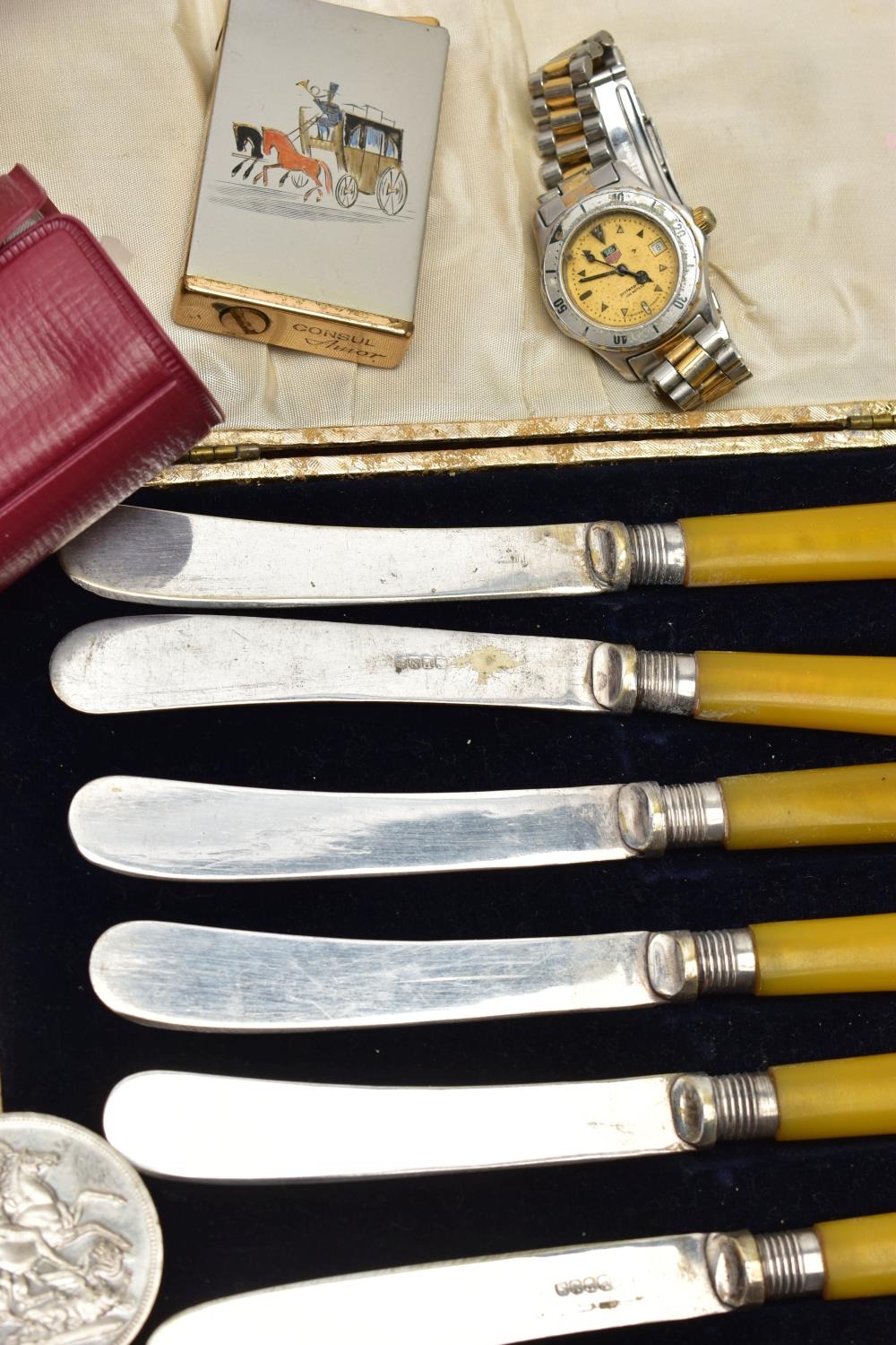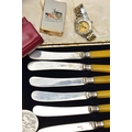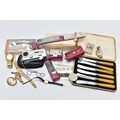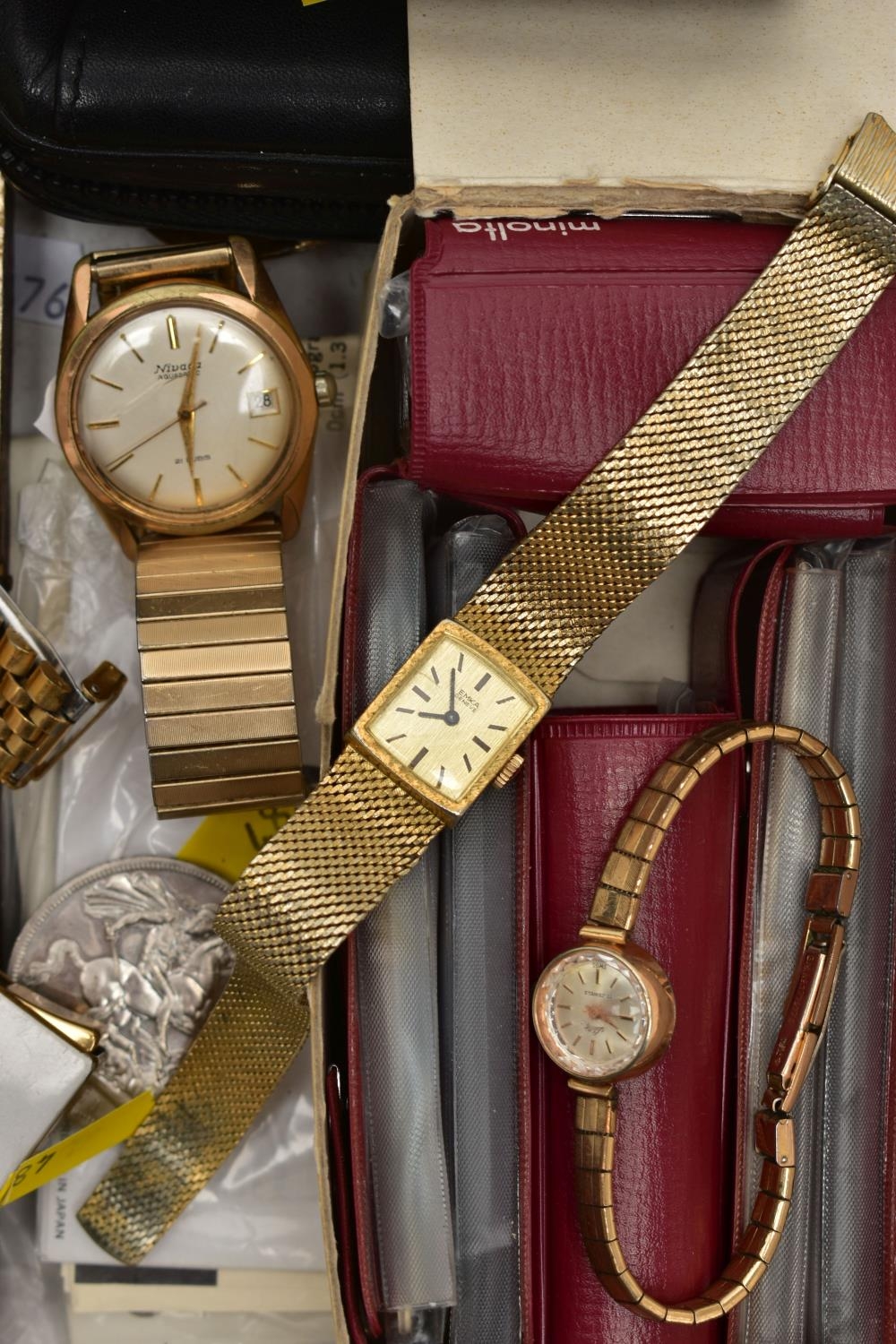 A BOX OF ASSORTED ITEMS, to include a ladies yellow metal wristwatch, AF round discoloured silver dial signed Cyma chronometer Arabic numerals, seconds subsidiary dial at the six oclock position, polished case stamped 14k Swiss control marks, approximate case width 21.2mm, fitted with a rolled gold openwork bracelet with fold over clasp, other ladies and gents fashion wristwatches, a Minolta 16mm camera with accessories, a cased six piece EPNS butter knife set, a boxed community plate christening set, a George VI commemorative five shilling coin, lighter, cameo brooch etc (Condition report:- some watches are replicas)
