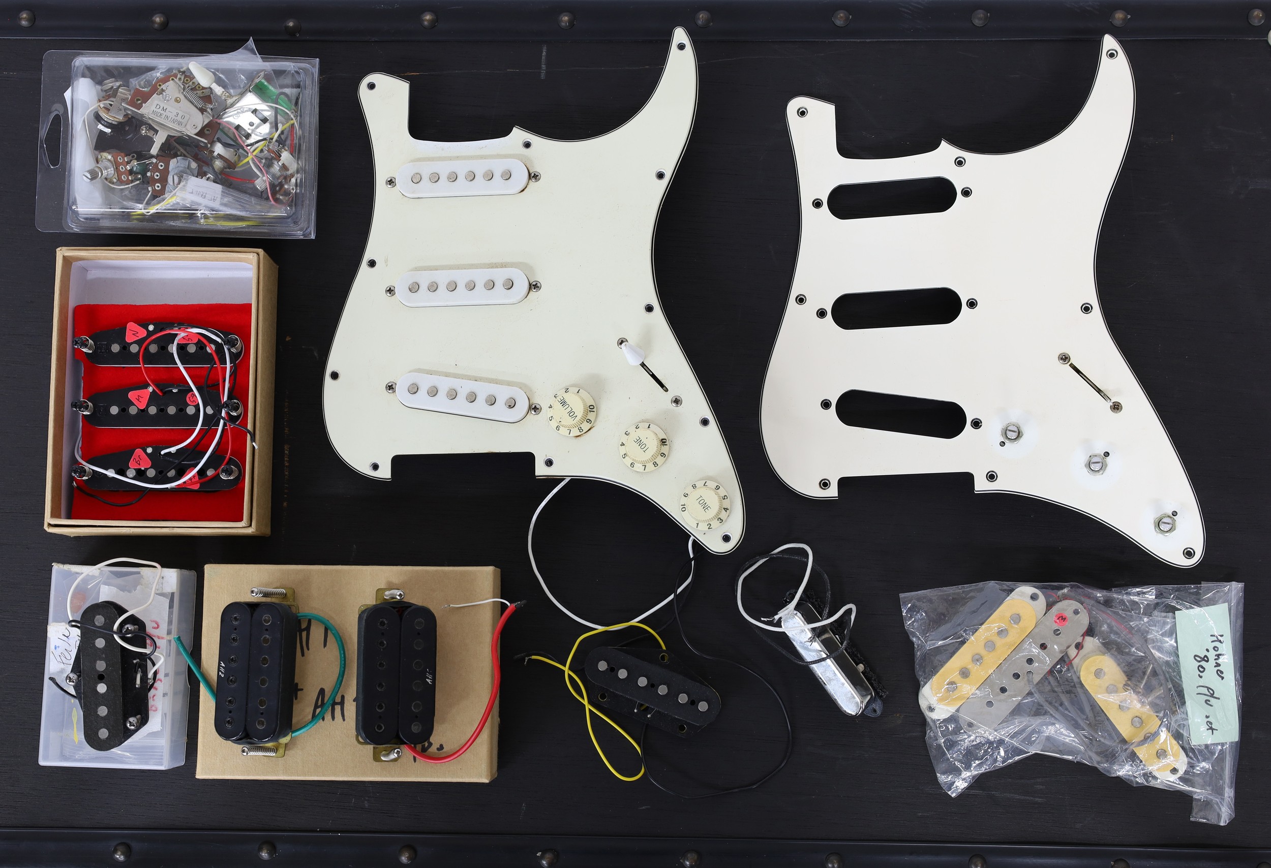 Selection of guitar electronics including pickups, switches and pots to include a set of Alan Holdworth AH1 and AH2 pickups, a Squier SQR Strat pickup, a 1980s Hohner single coil pickup set and a Fender Baja Telecaster bridge pickup etc
