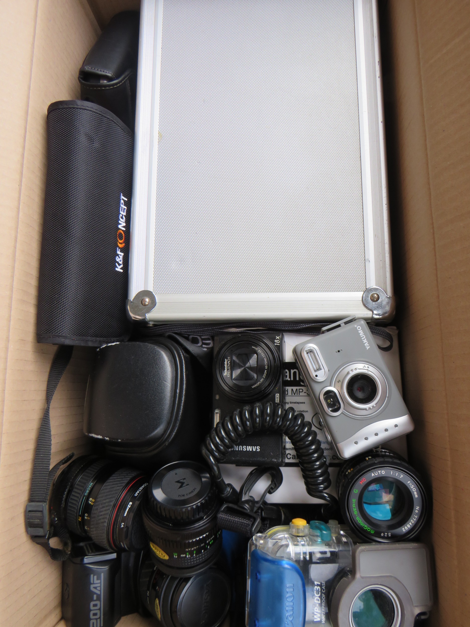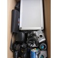 Box of assorted cameras including digital compacts