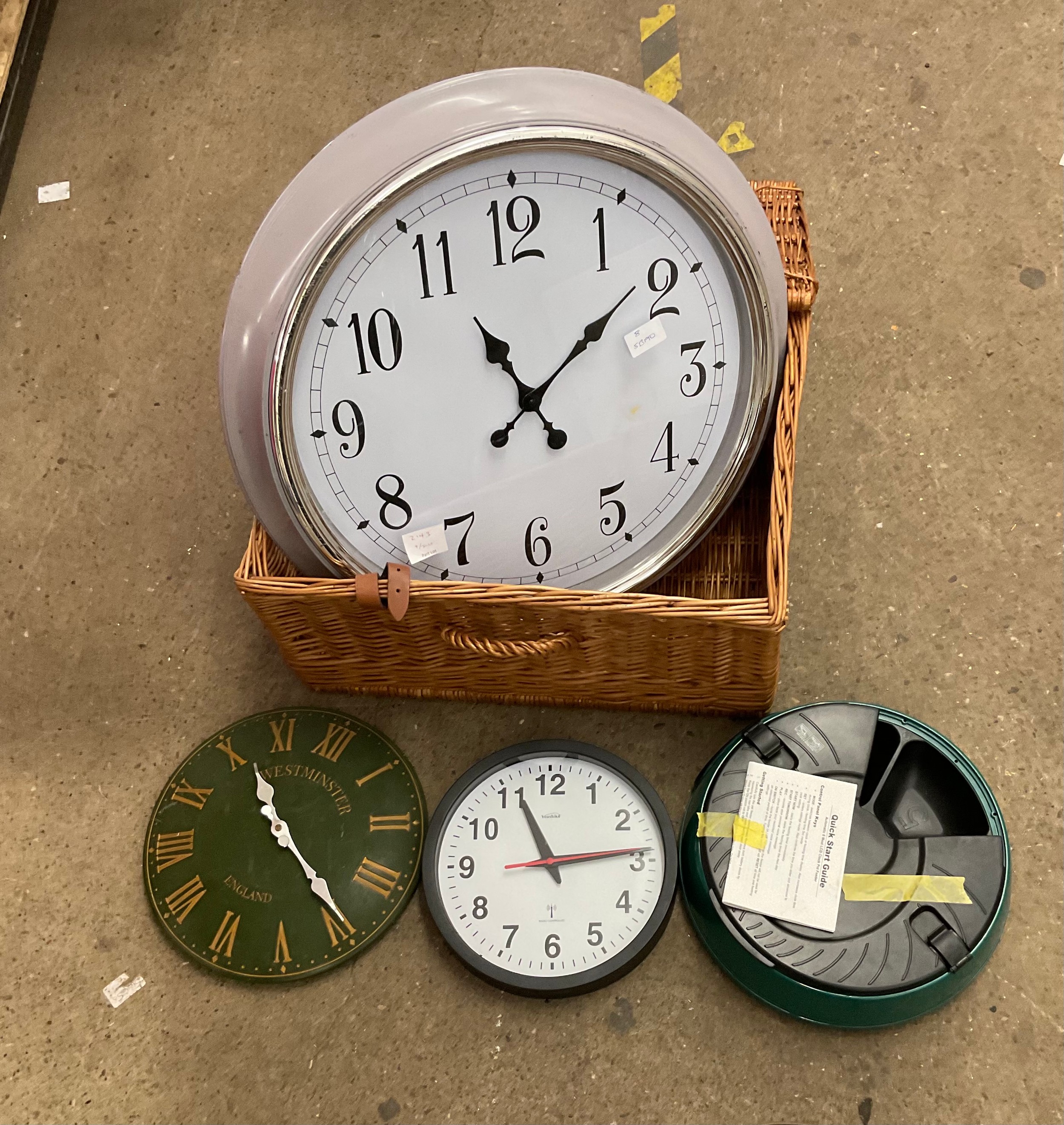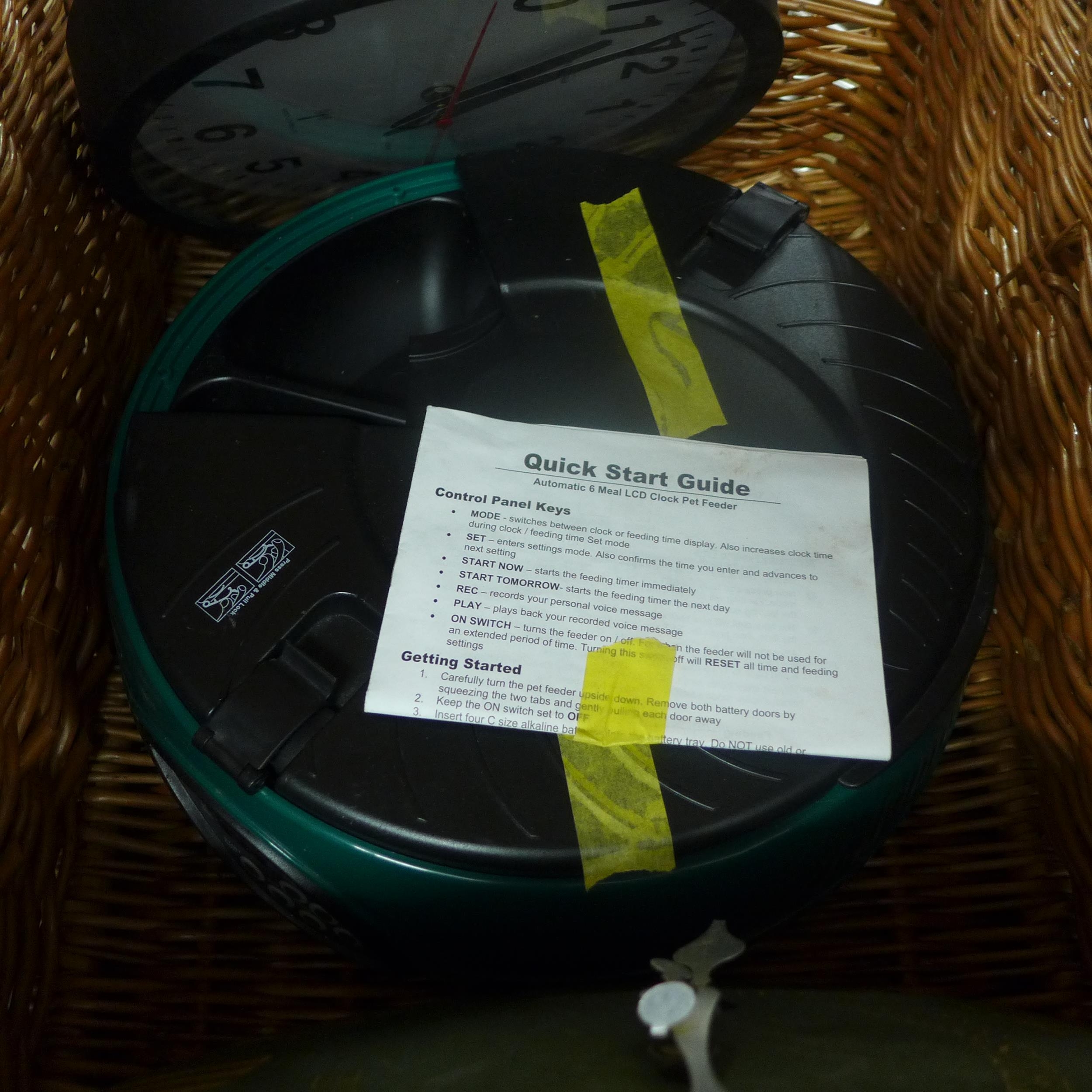 3 clocks, LCD clock timed cat feeder and picnic baskets