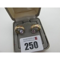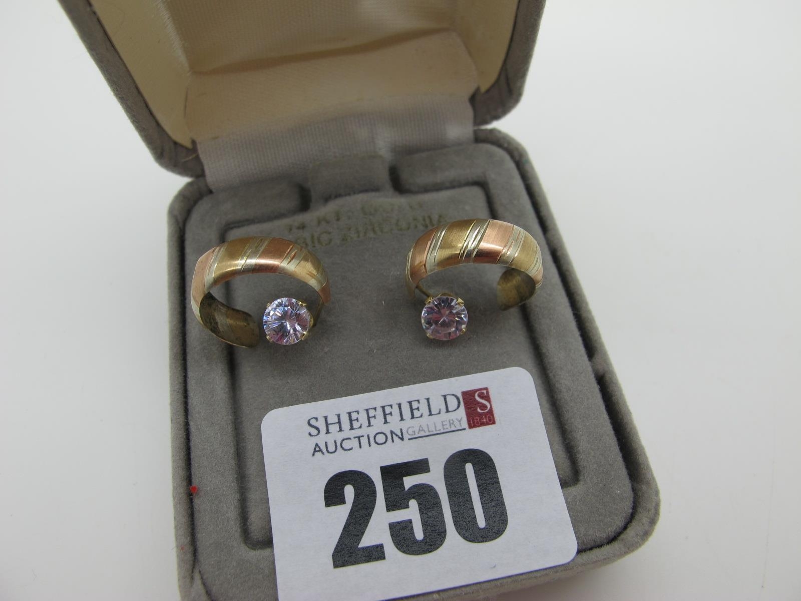 A Pair of Claw Set Earstuds, (lacking butterfly backs) stamped "14k" to post; and a pair of three colour half hoop earrings (damaged / lacking butterfly backs).