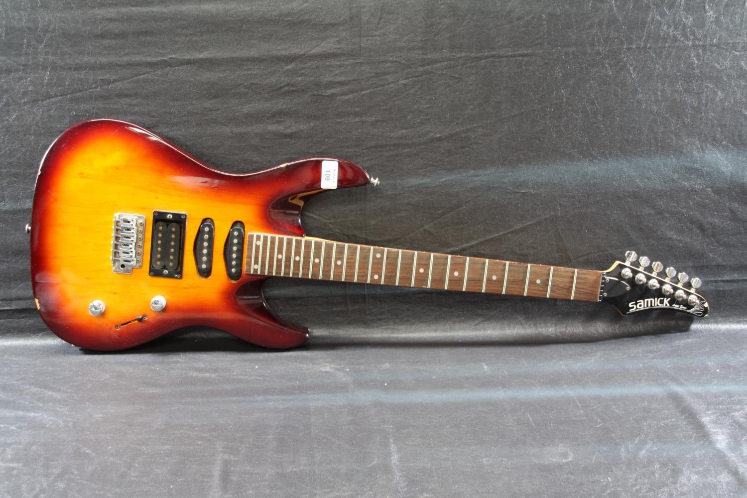 Samick Artist Series electric guitar - 24 frets, whammy style bridge, two single coil and one humbucker pickups, chrome hardware - no strings