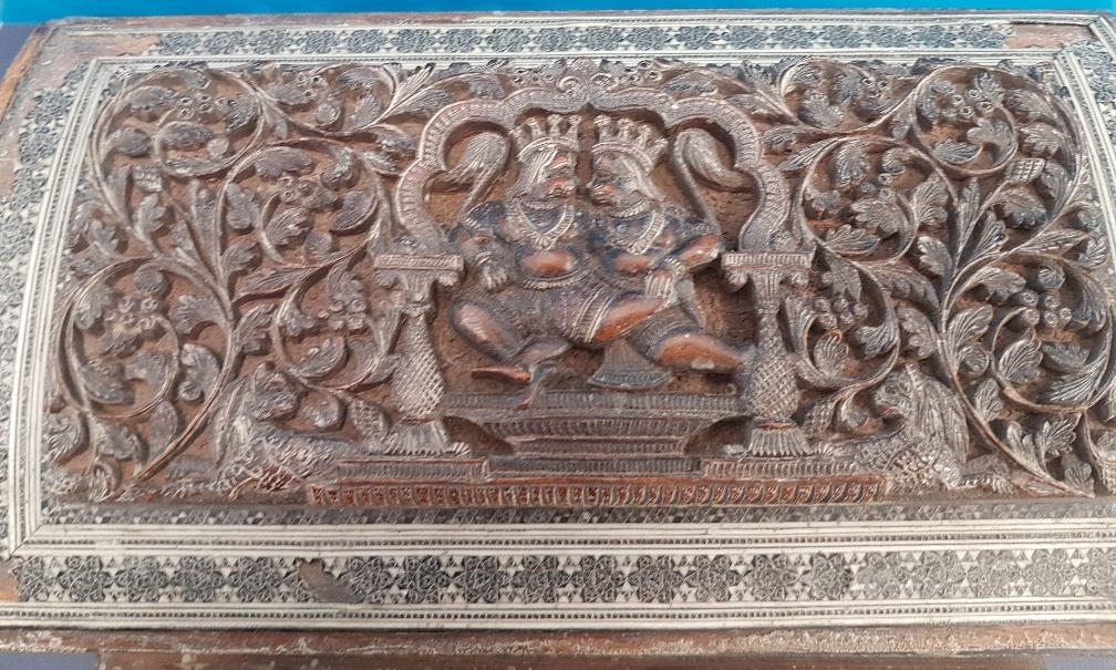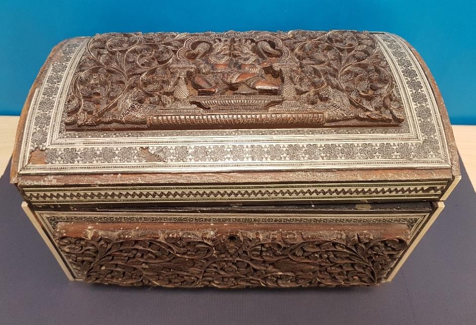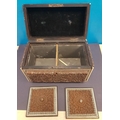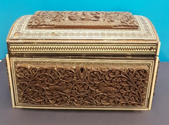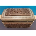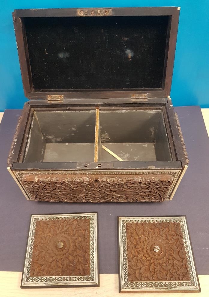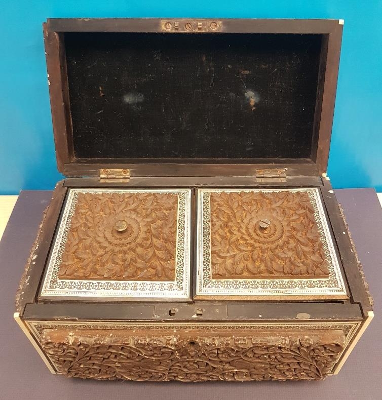 Anglo Indian Carved Sandalwood and Sadeli Double Tea Caddy 1820 with all over panelling (some damage). Measures 10 inches x 7 inches x 6 inches