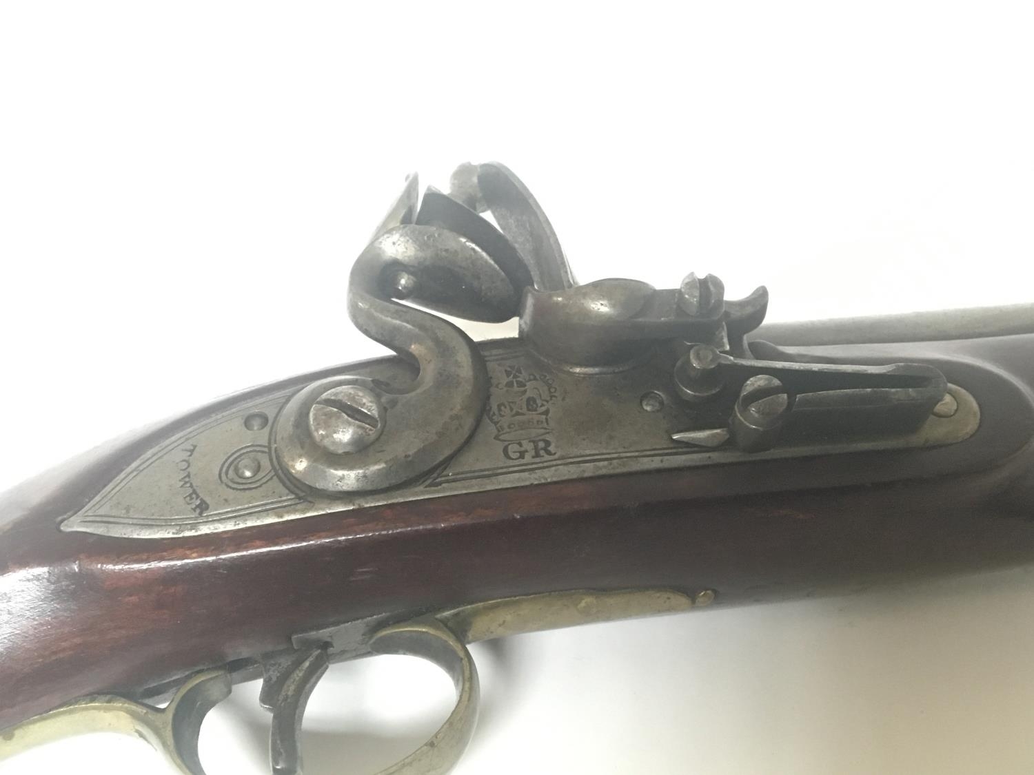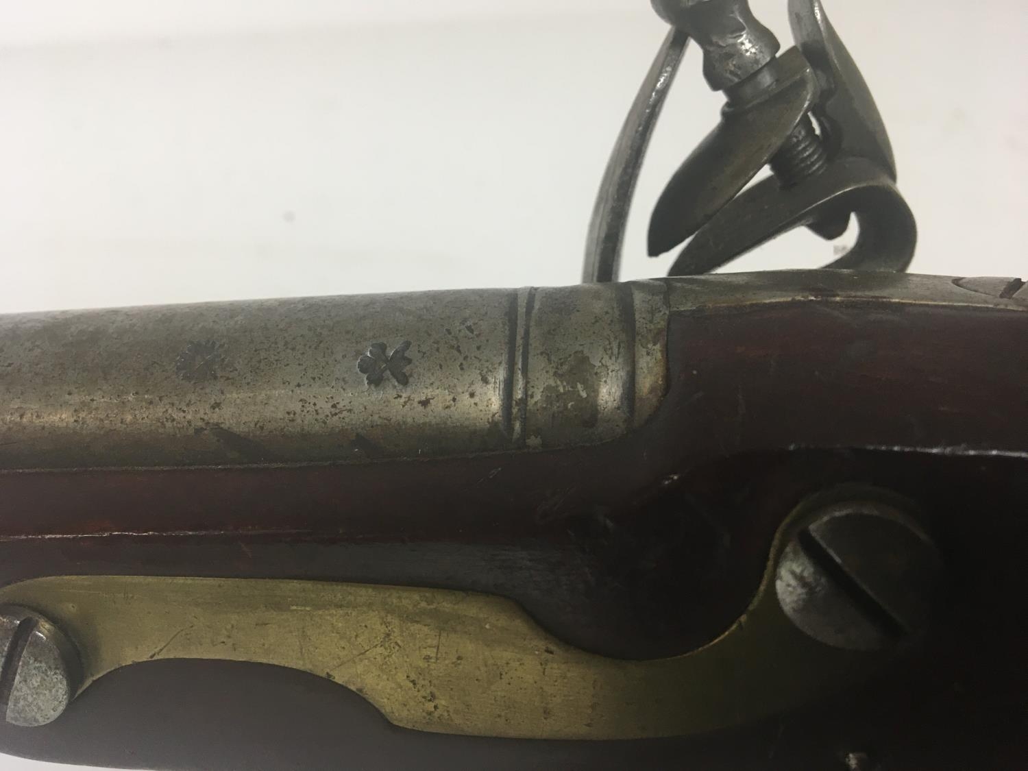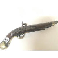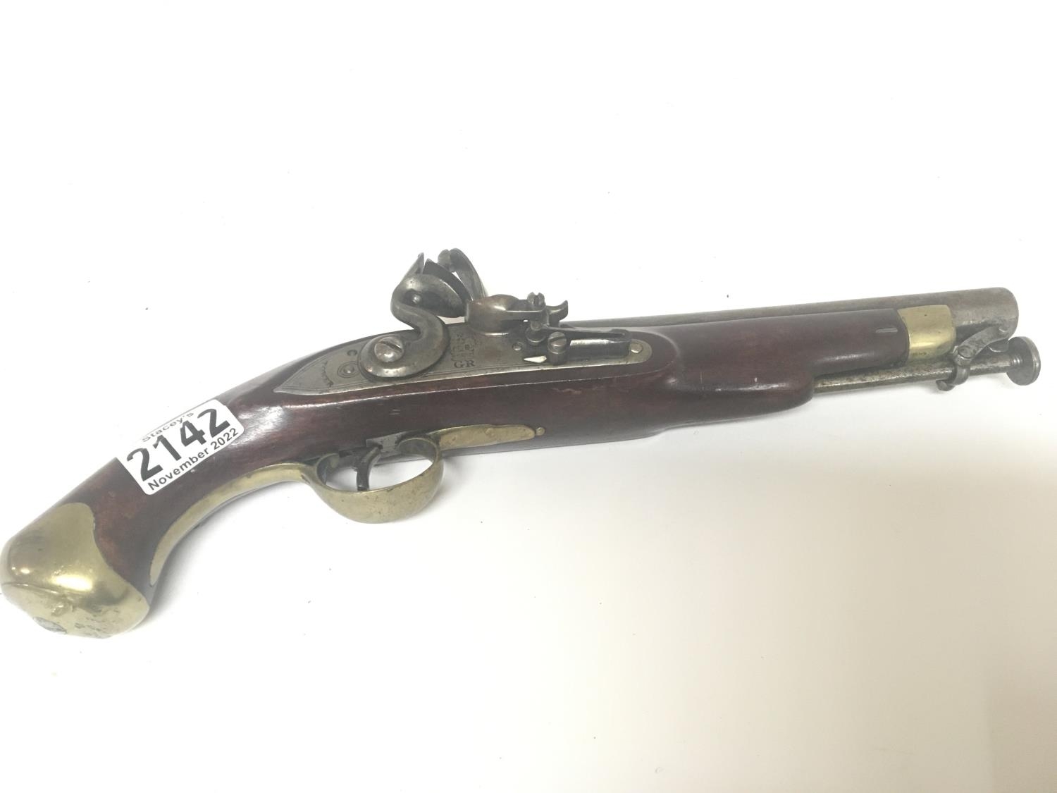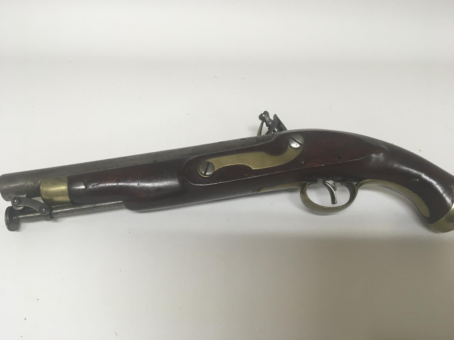A nice original flintlock Early 19th century pistol with brass trigger Guard brass end stop the action stamped Tower with George III crown the barrel with proof marks.