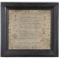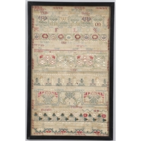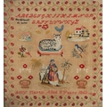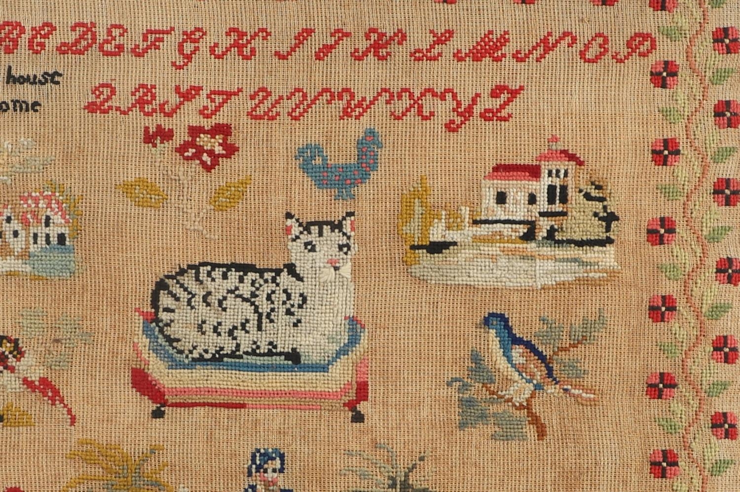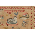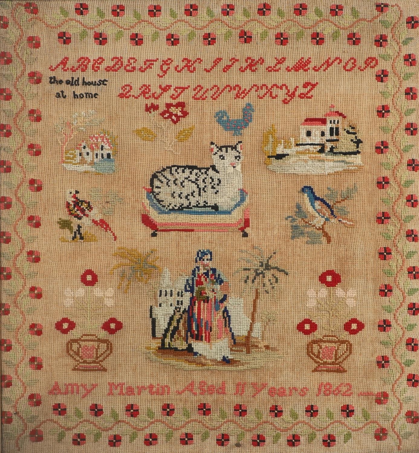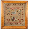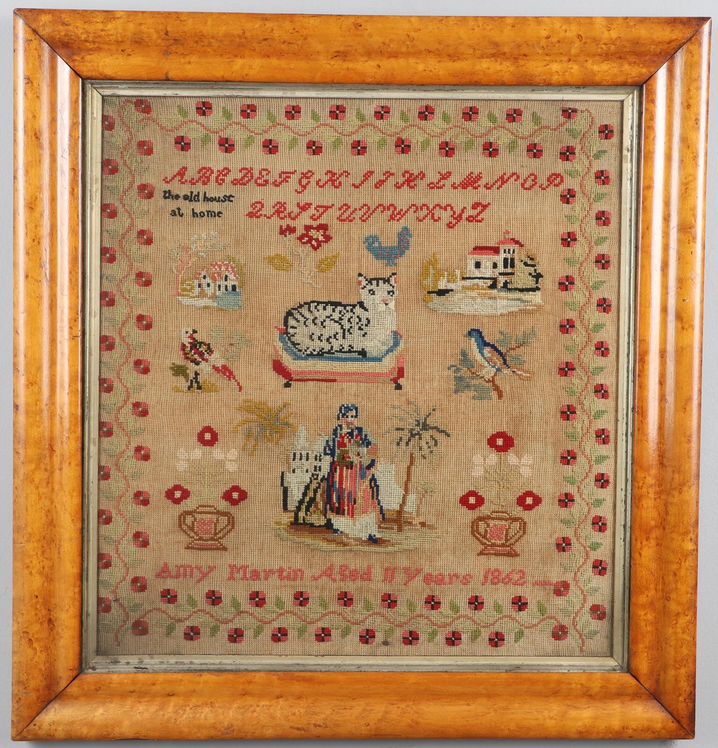 A MID-19TH CENTURY PICTORIAL WOOLWORK SAMPLER. illustrating the alphabet, birds, a cat, an Oriental figure, buildings and vases of flowers, by Amy Martin Aged 11 Years 1862, within a birds eye maple frame, overall size 68cm x 63cm.