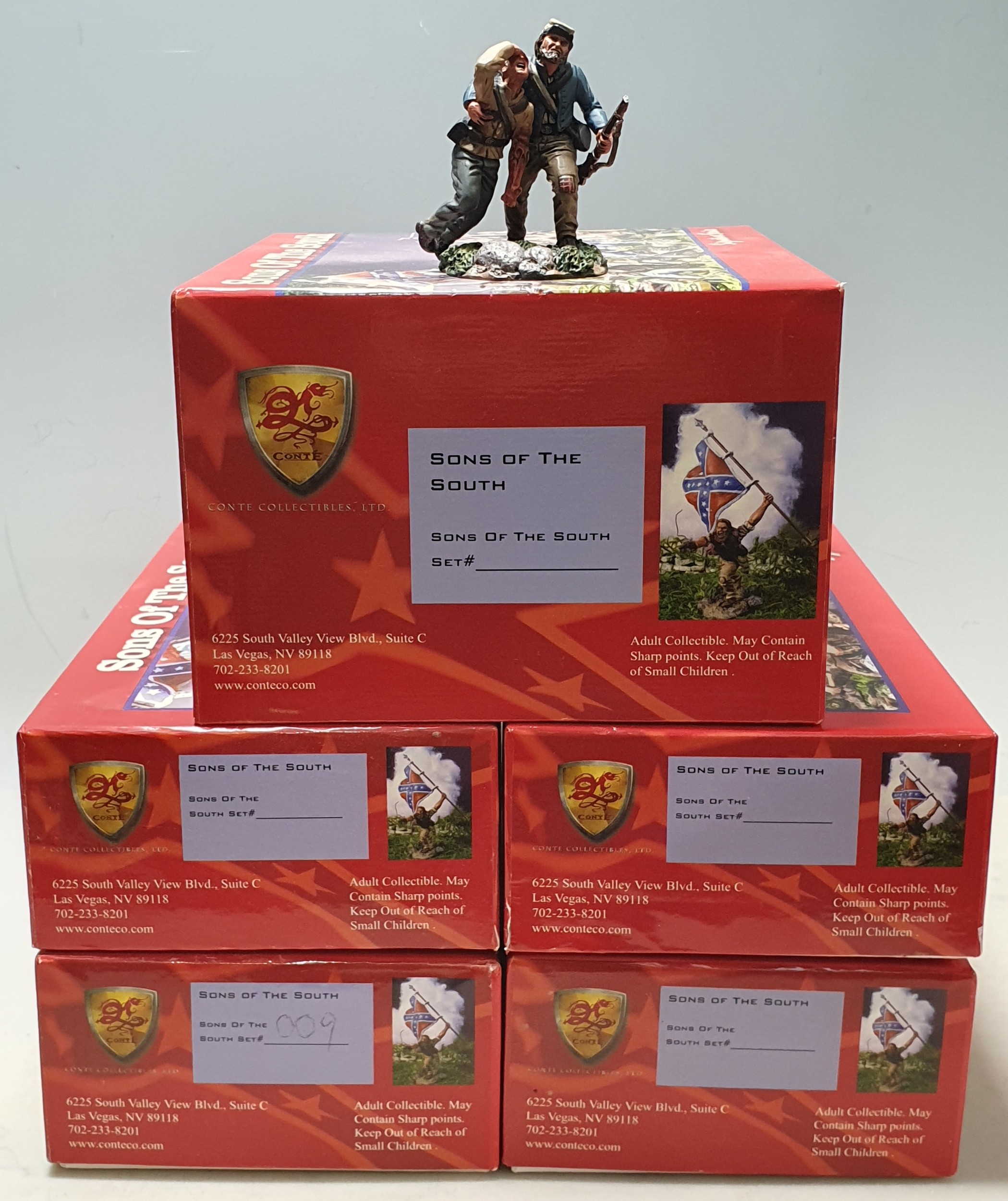 Five boxed Conte Collectibles 'Sons of the South' Rebel Yell Series comprising SOS-012 'Aftermath', SOS-011 Firing Set No.2, 2x SOS-015 'Down but not Out' and SOS-009 Advancing Command Set, all M, boxes Nr perfect