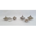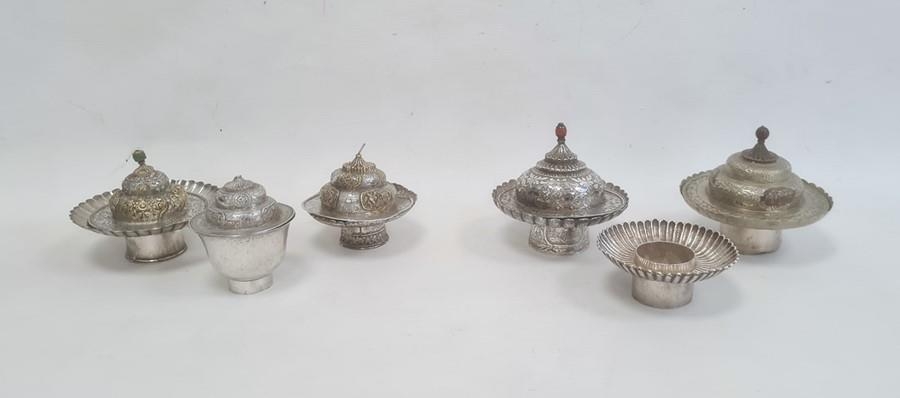 Six various engraved and shaped silver-coloured bowls and cups and five various domed covers, all profusely chased and some partly gilded, one bearing indistinct Chinese character mark to base