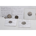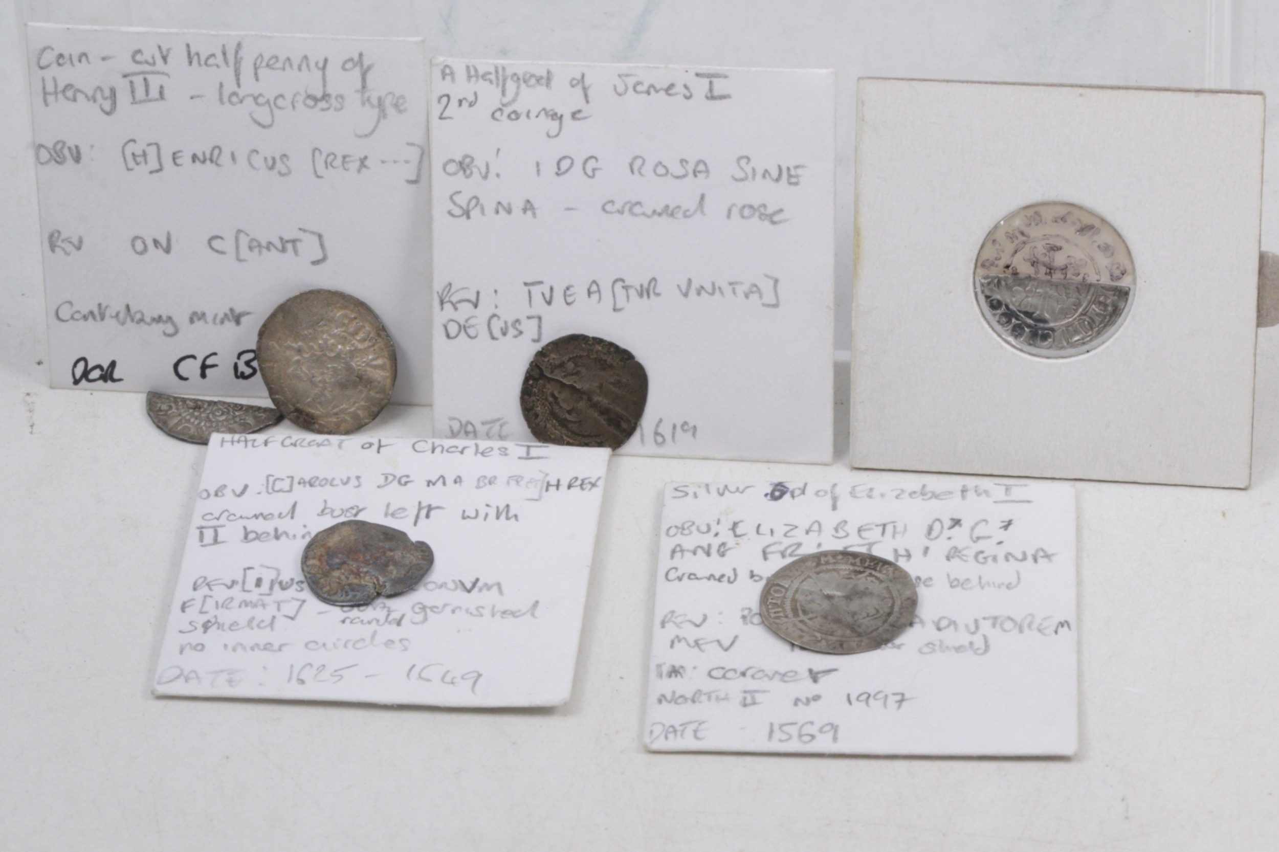 Henry III longcross cut halfpenny, William I circa 1066-1087 cut halfpenny, half groat of Charles I, Silver 5d of Elizabeth I, halfgroat of James I
