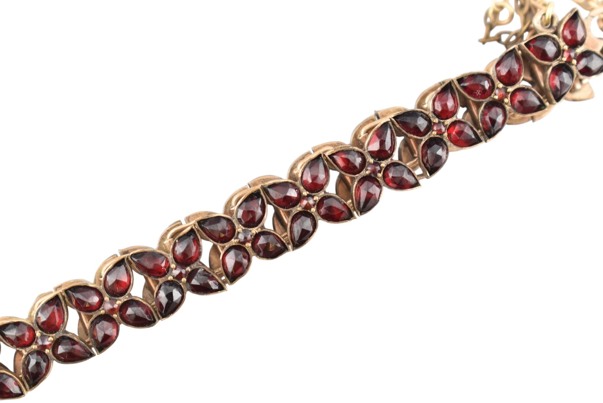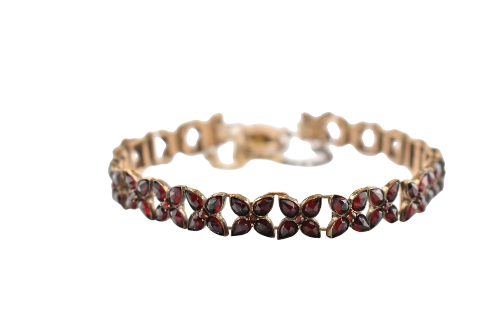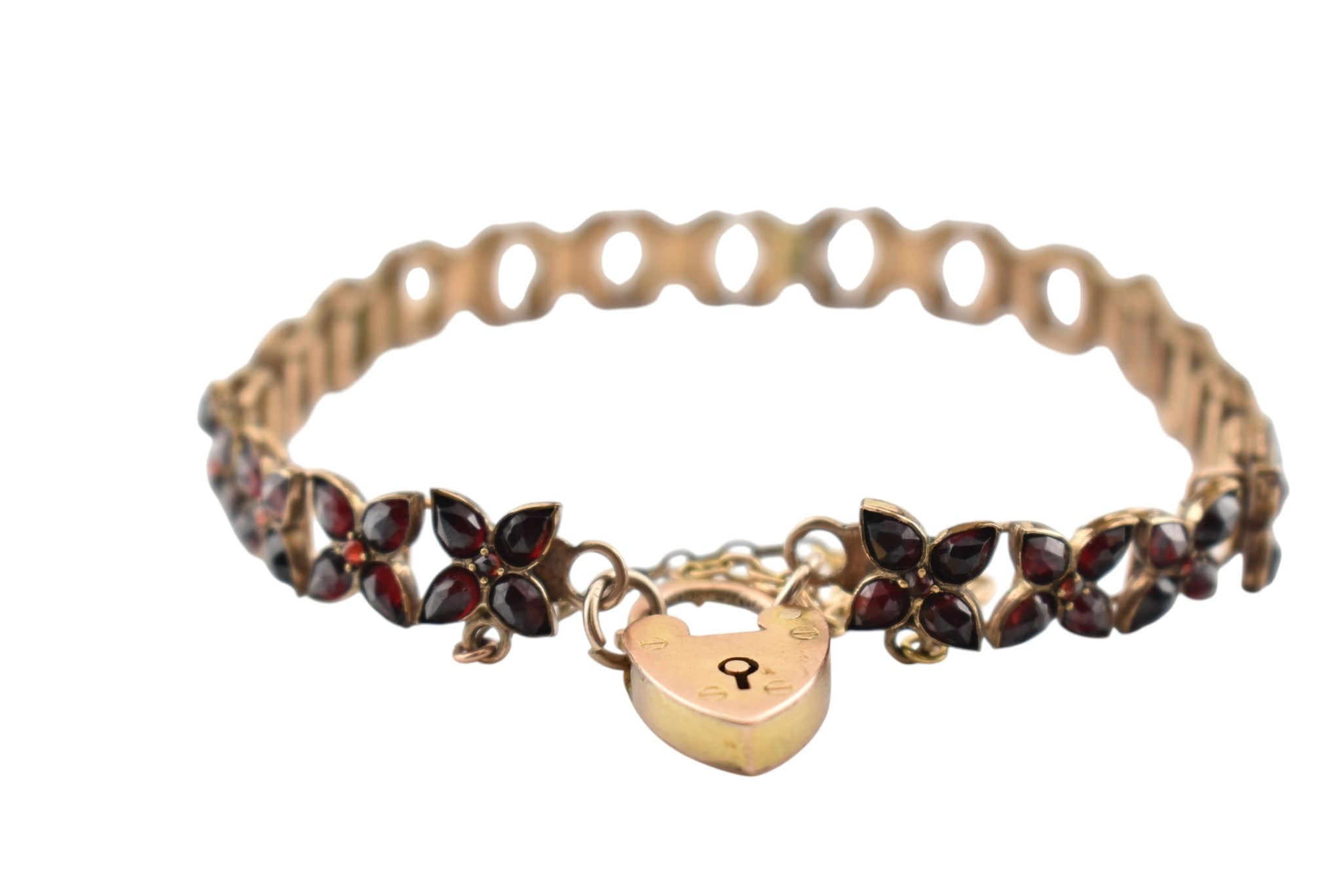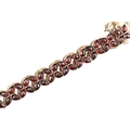 An early 20th century Bohemian garnet bracelet with a hallmarked 9ct gold padlock clasp. The clasp is hallmarked Birmingham 1906. Measures approx 18cm. Clasp 1.8g.