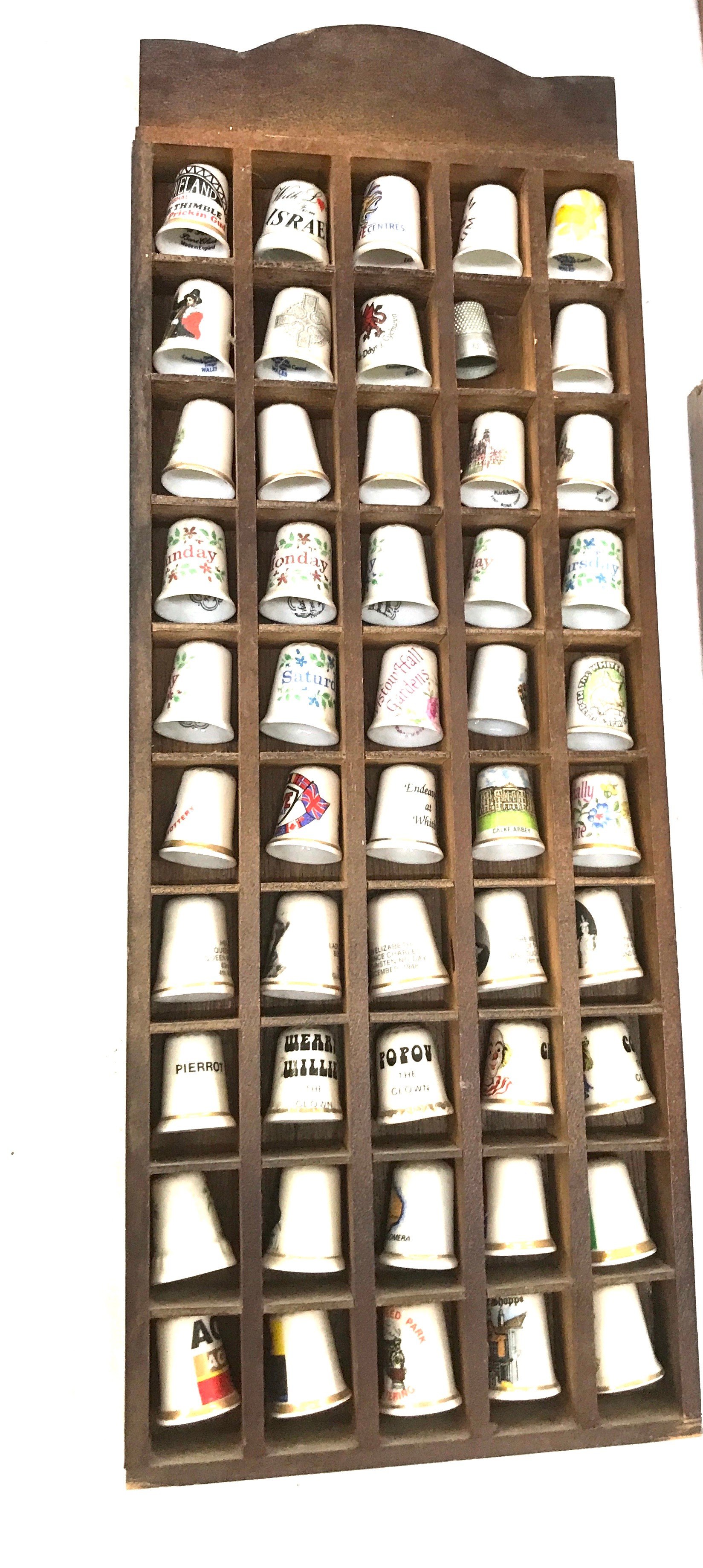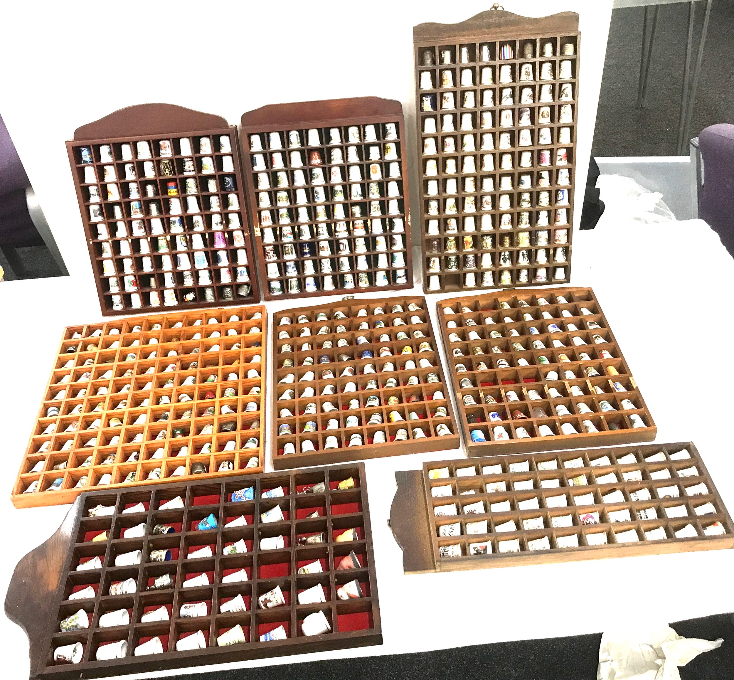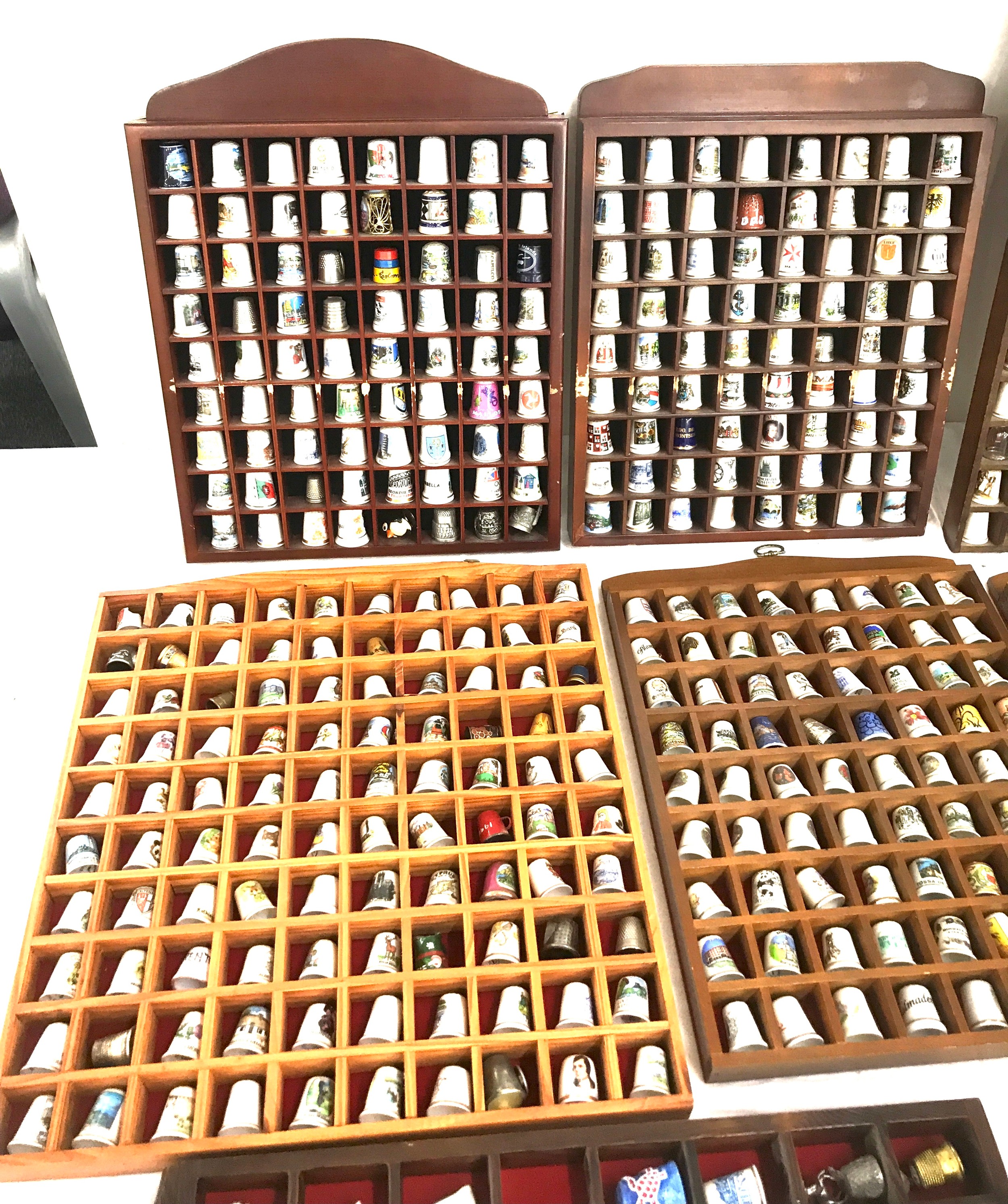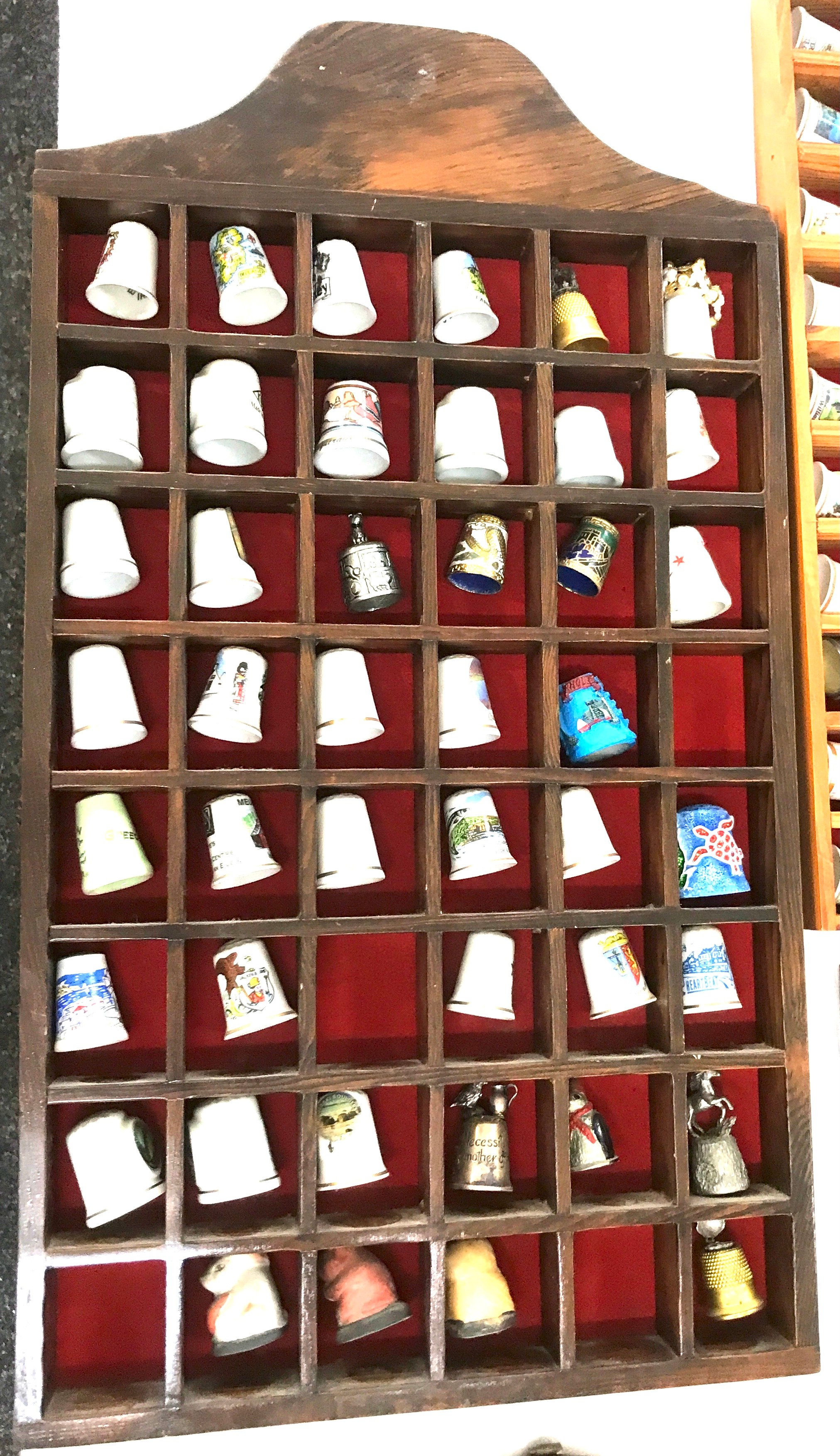 Large selection of assorted Thimbles includes metal thimbles, pottery etc with display cases