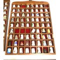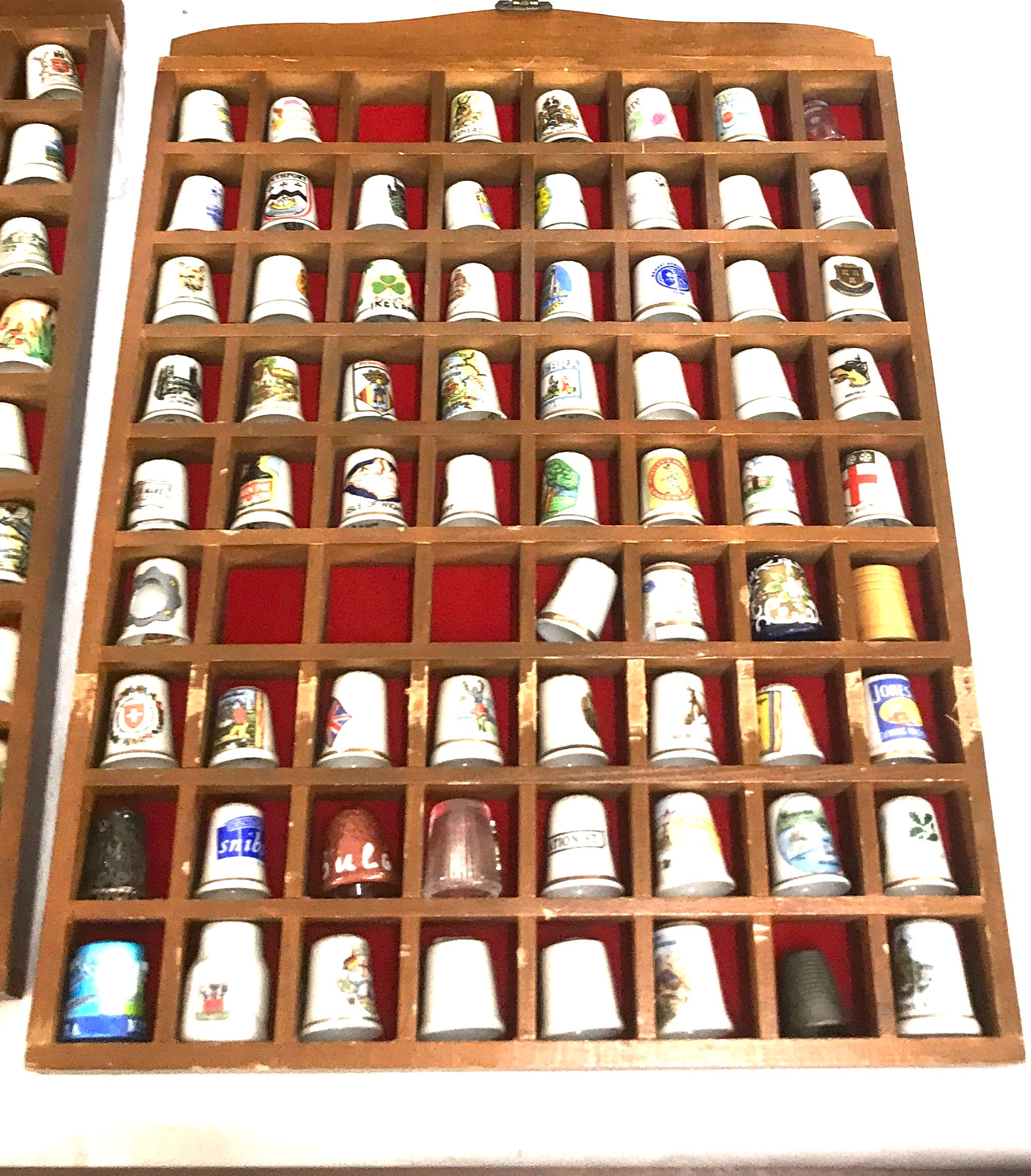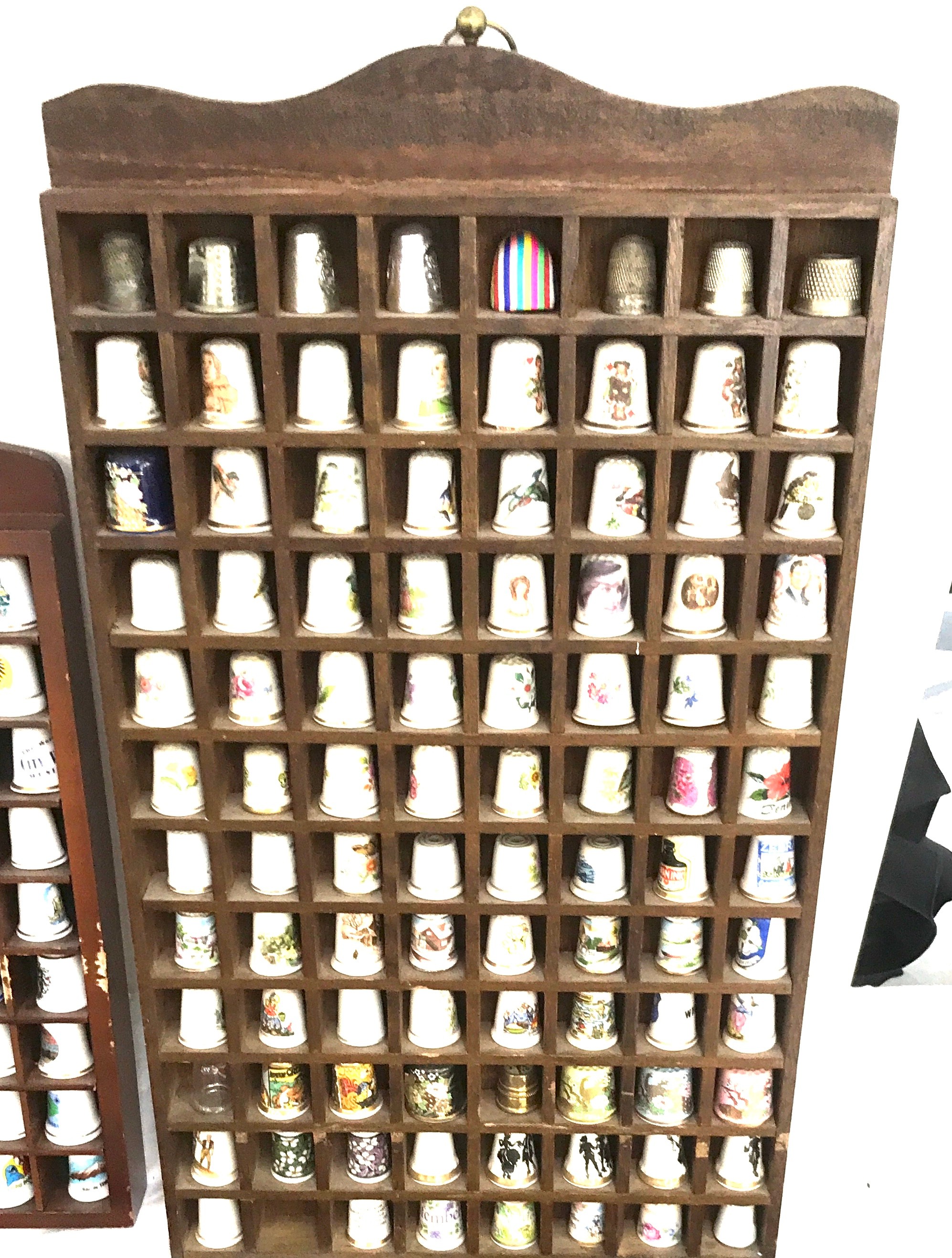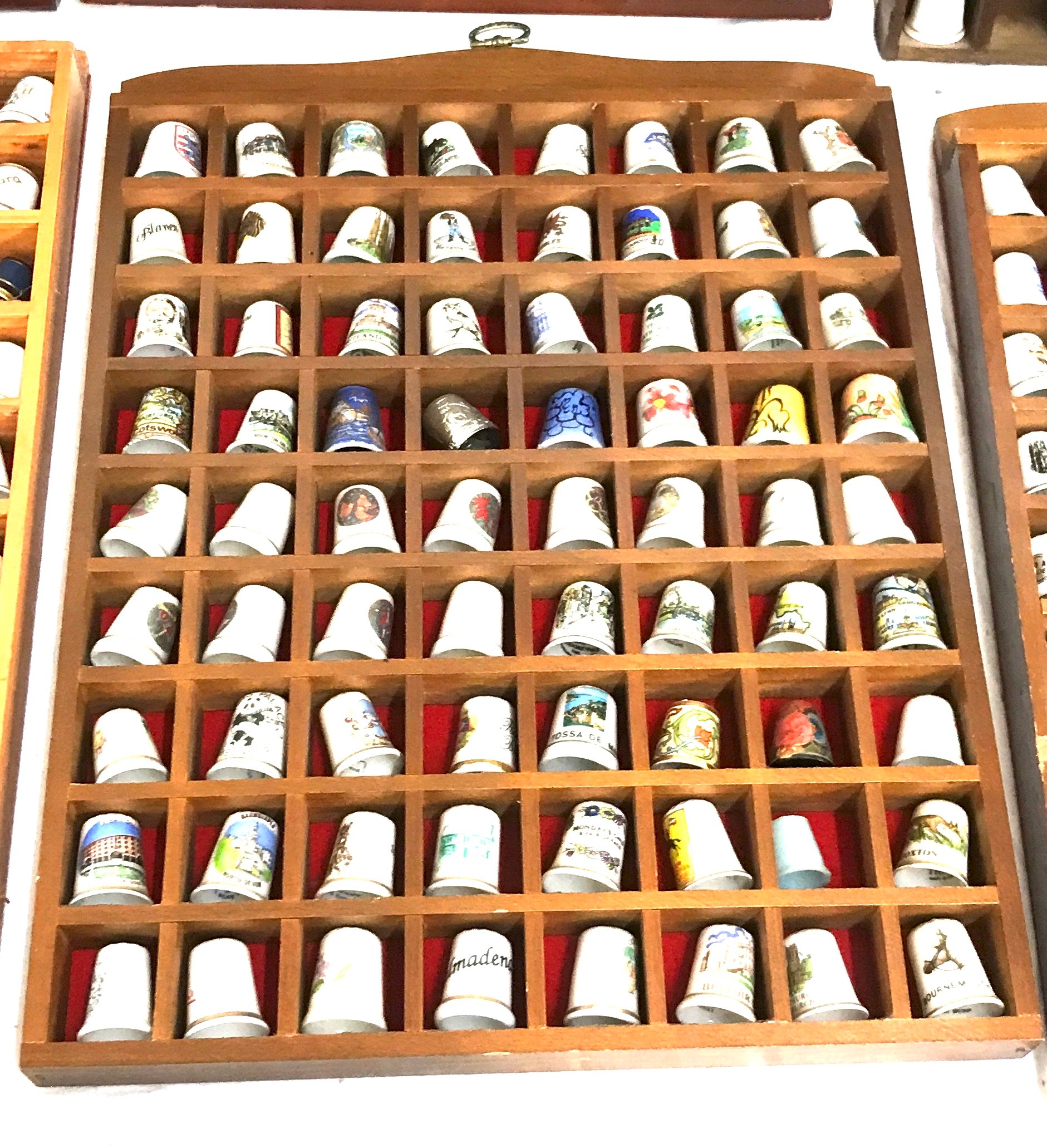 Large selection of assorted Thimbles includes metal thimbles, pottery etc with display cases