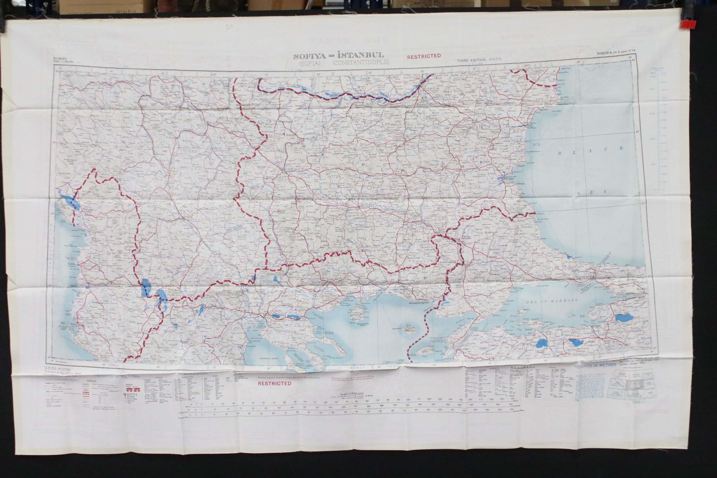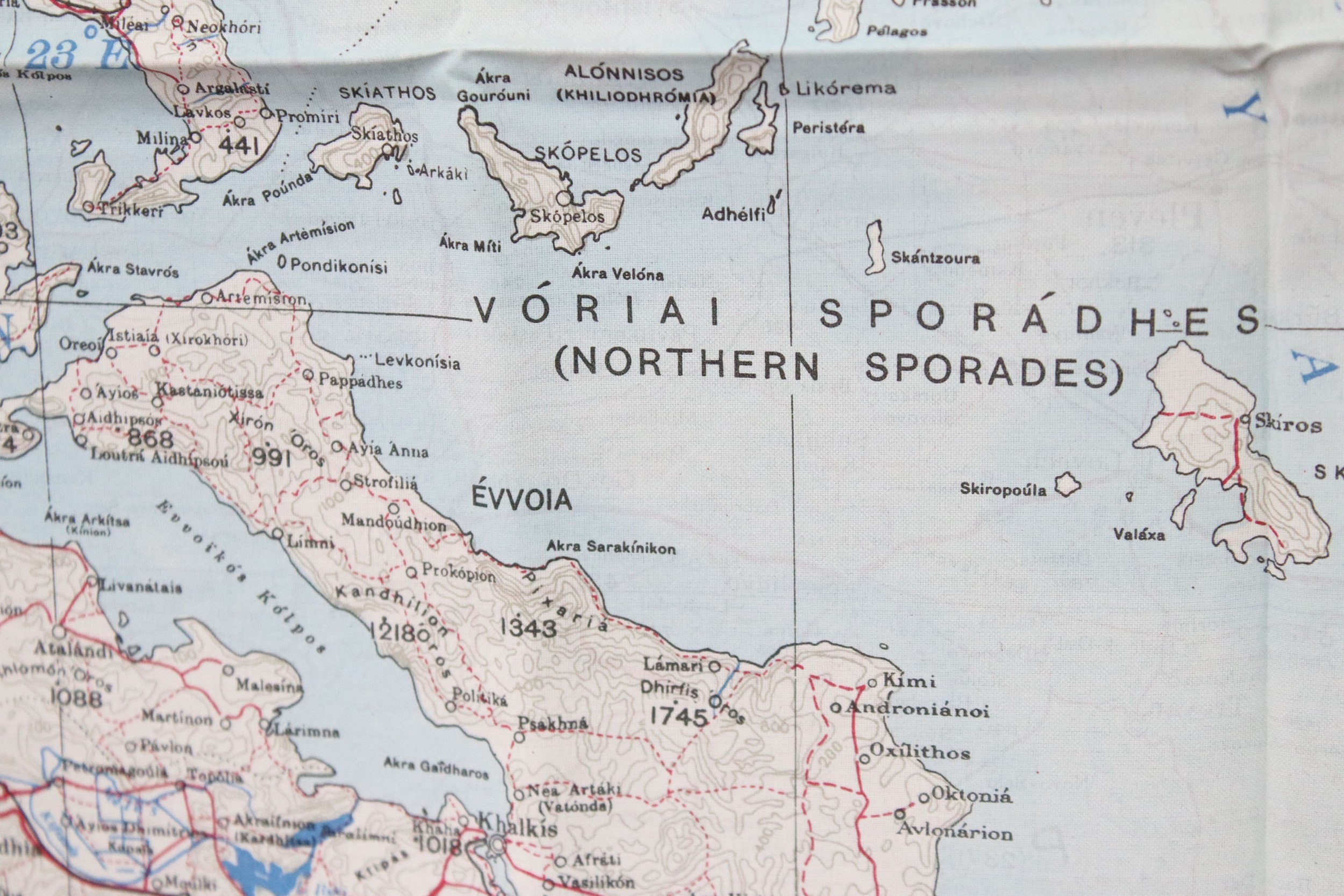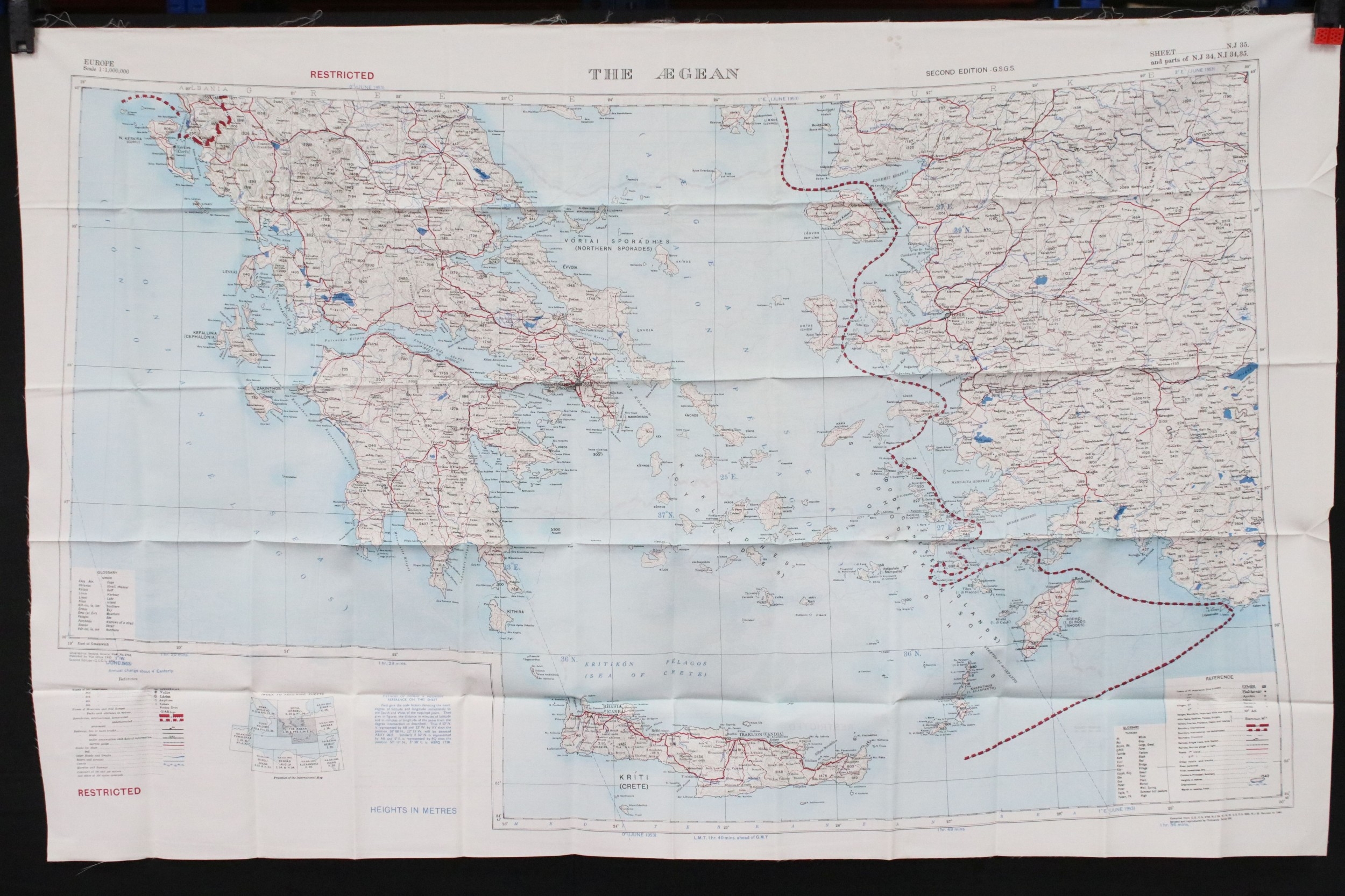 A Royal Air Force / RAF silk escape map covering Agean Sea, Greek Islands, Corfu, Rhodes, Crete, Zante, Santorini, Athens, Turkey, Albania (1)