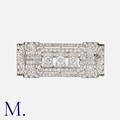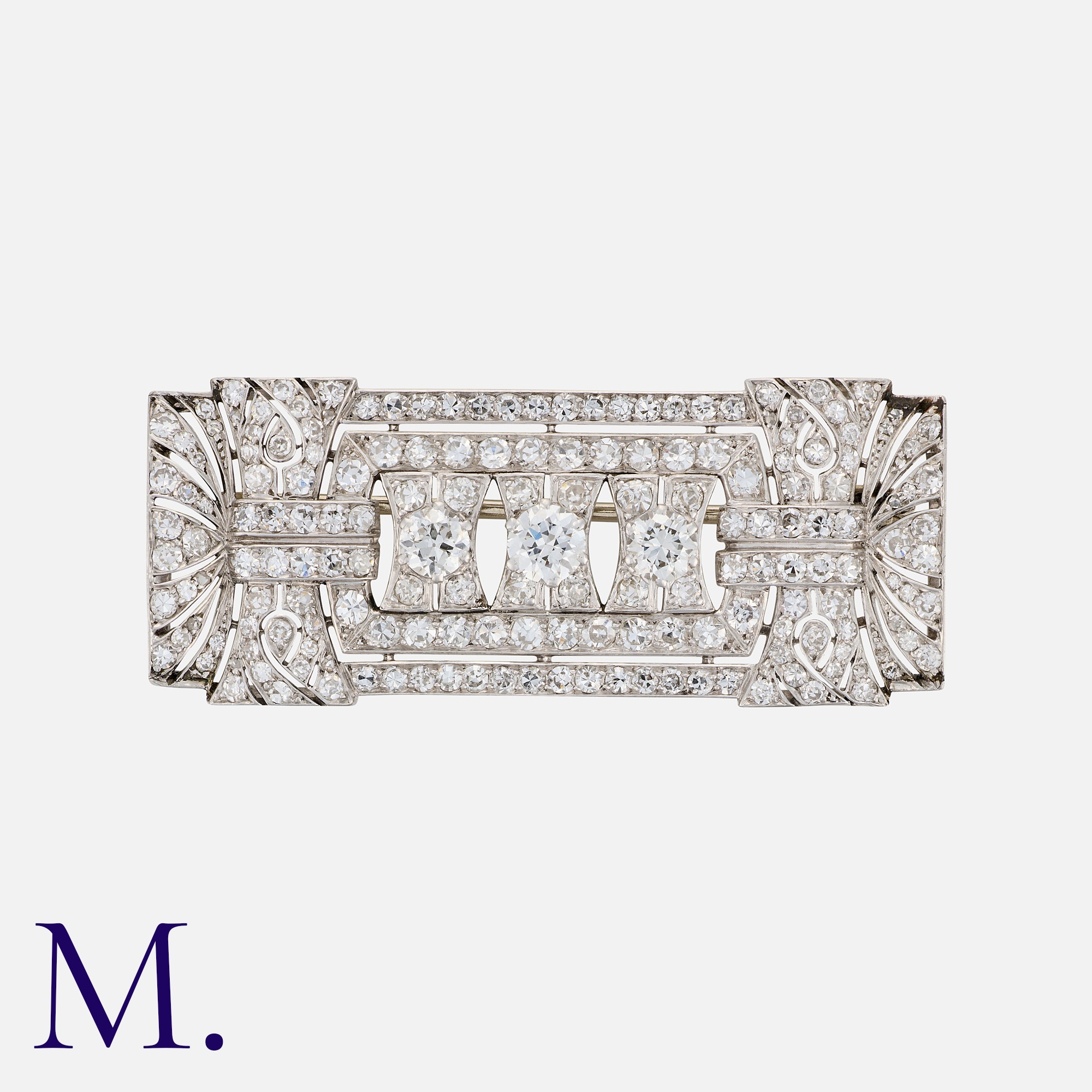 A French Art Deco Diamond Plaque Brooch in platinum, of openwork, geometric design, set with transitional cut and eight cut diamonds totalling approximately 3.00 carats. French Assay Mark.