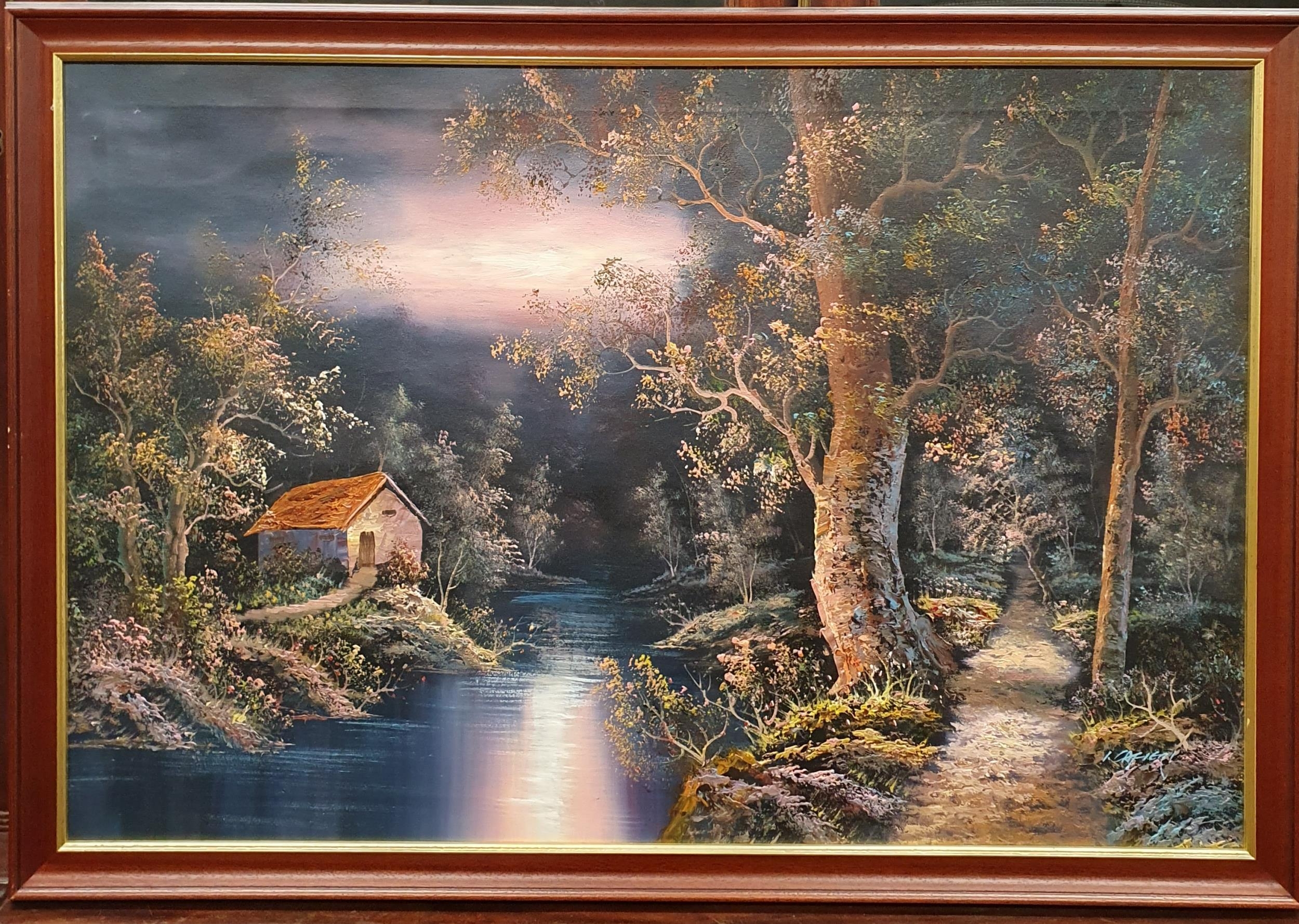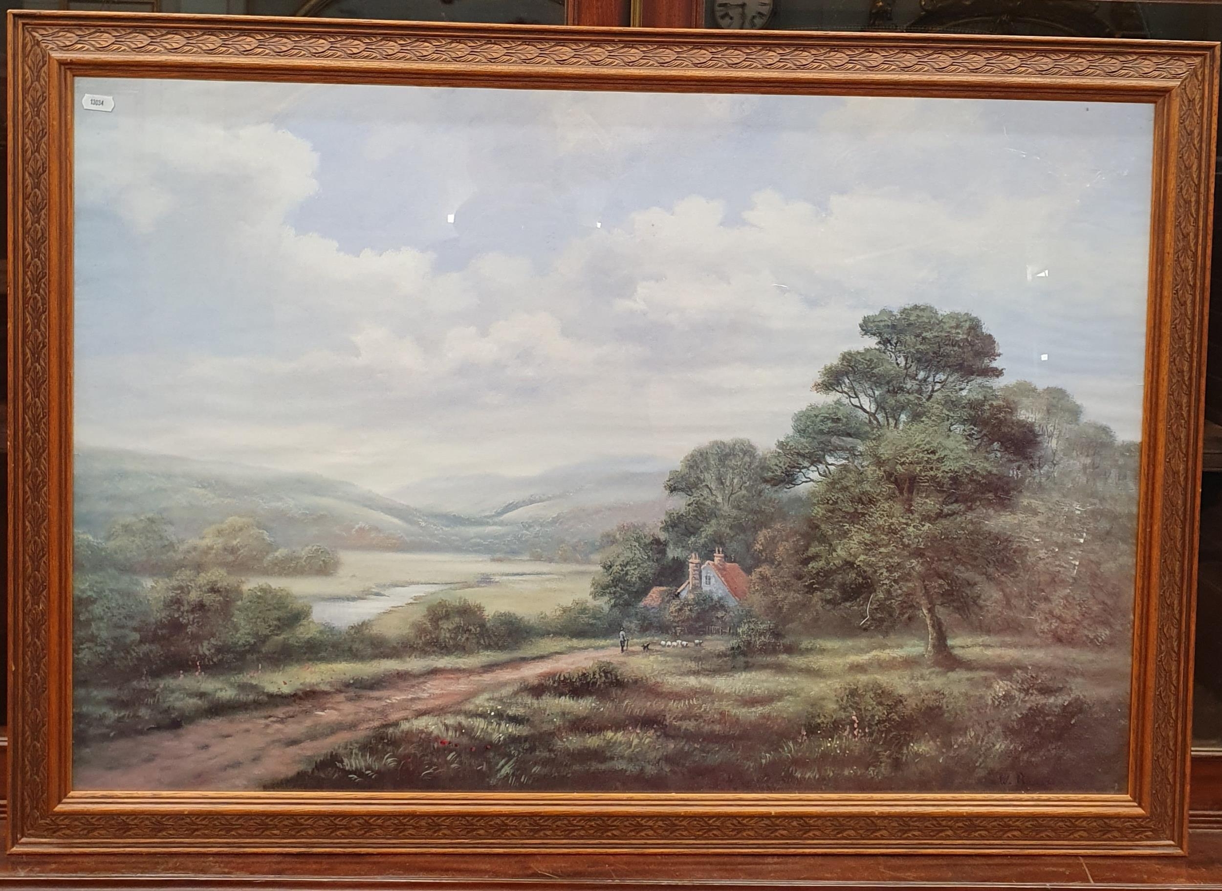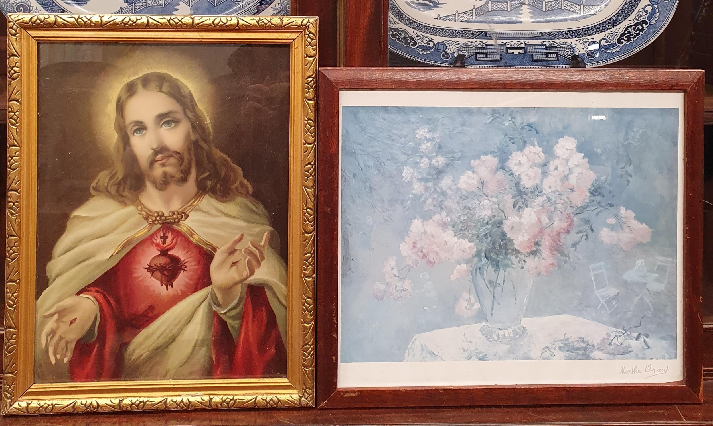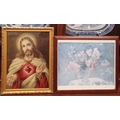 A large Oil on Canvas along with 2 Framed Prints and a Picture of Sacred Heart Of Jesus .