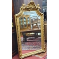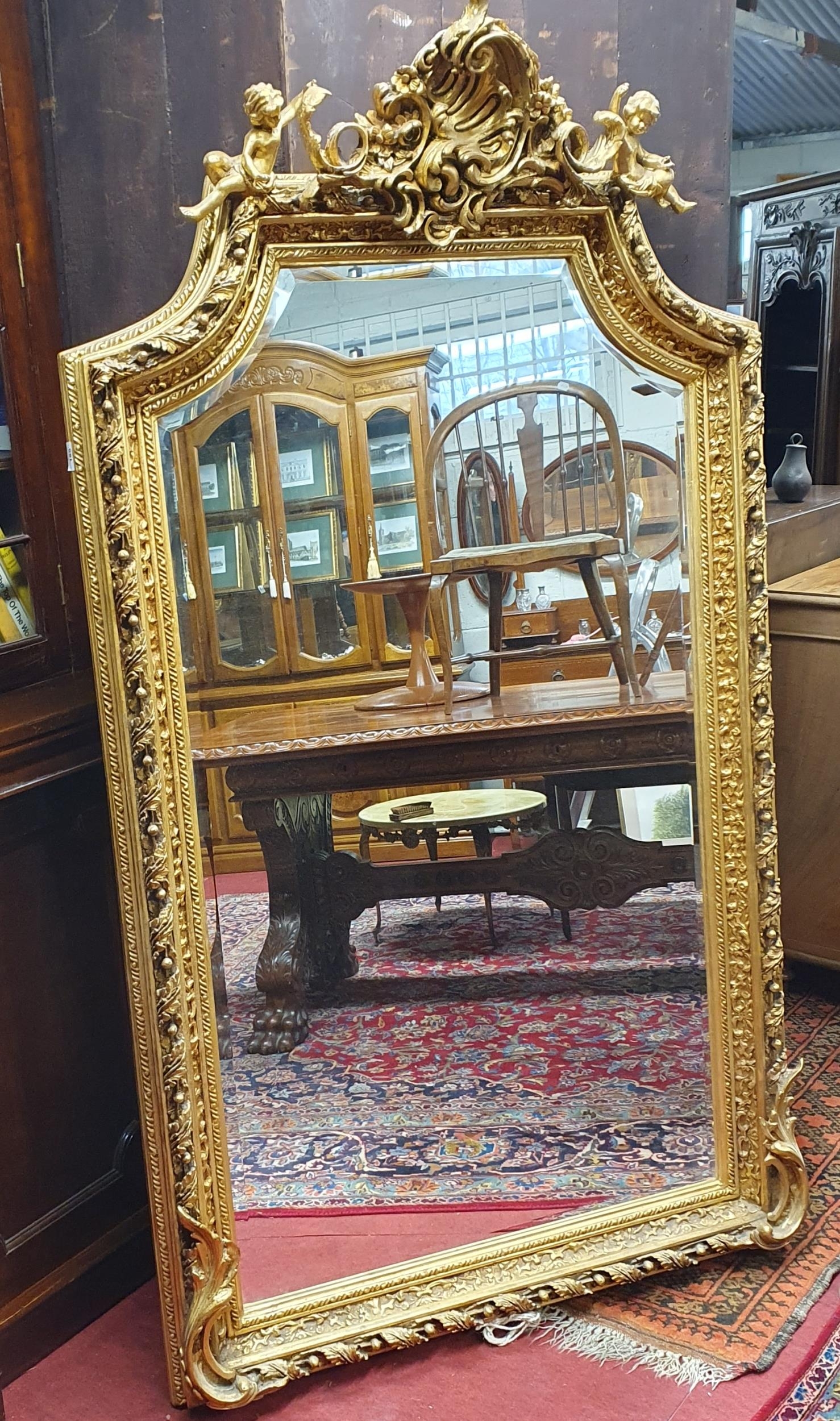 A good highly carved Timber and Plaster Gilt Overmantel Pier Mirror with highly carved outline, bevelled glass and cherub cartouche top. W100 x H181cm approx.