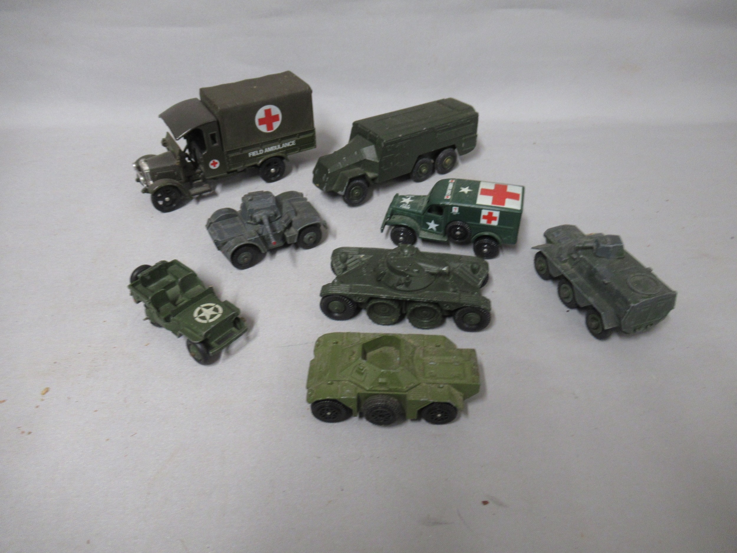 Box of Dinky diecast metal model military vehicles including Troop carrier with troops