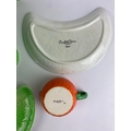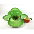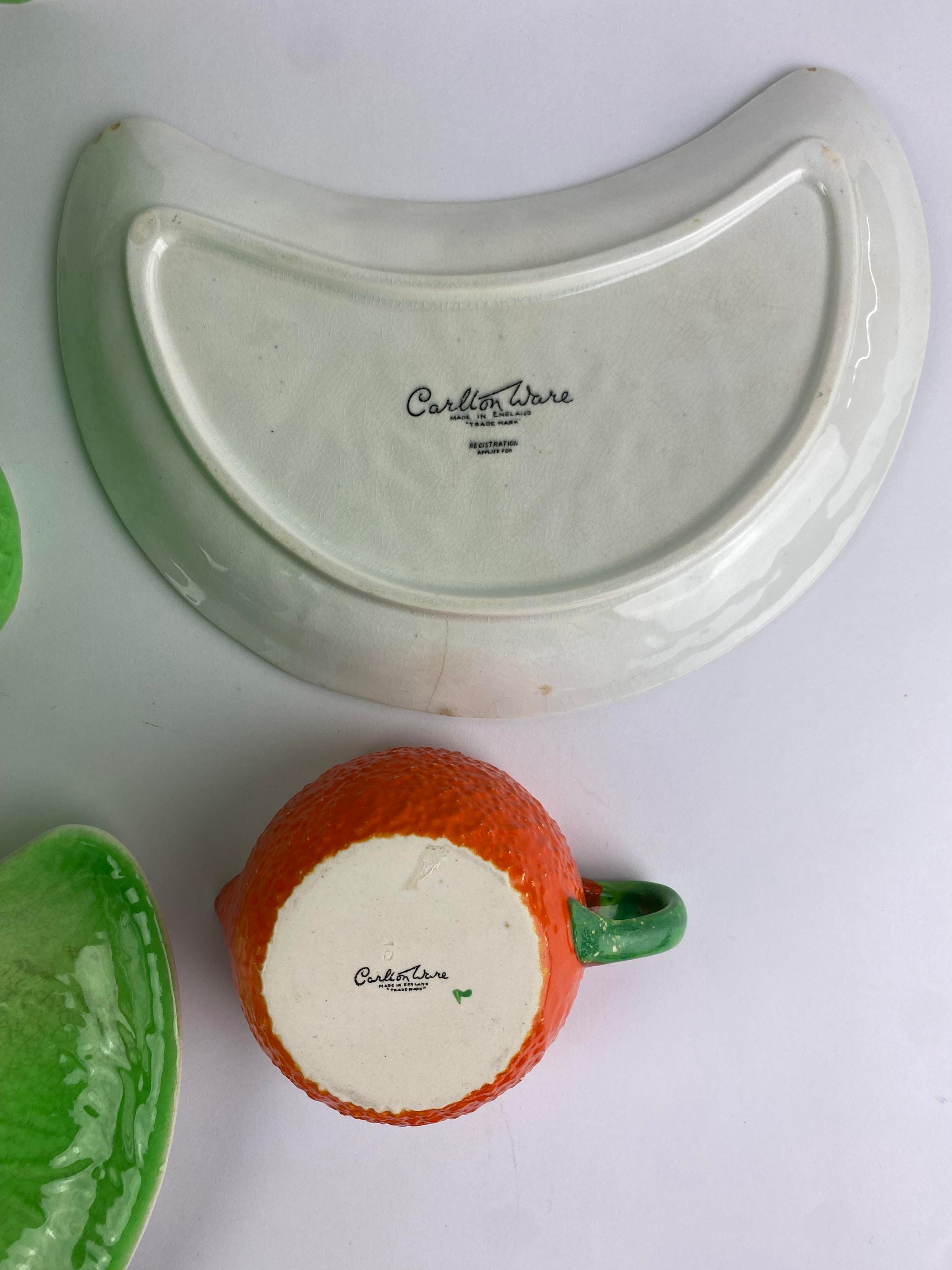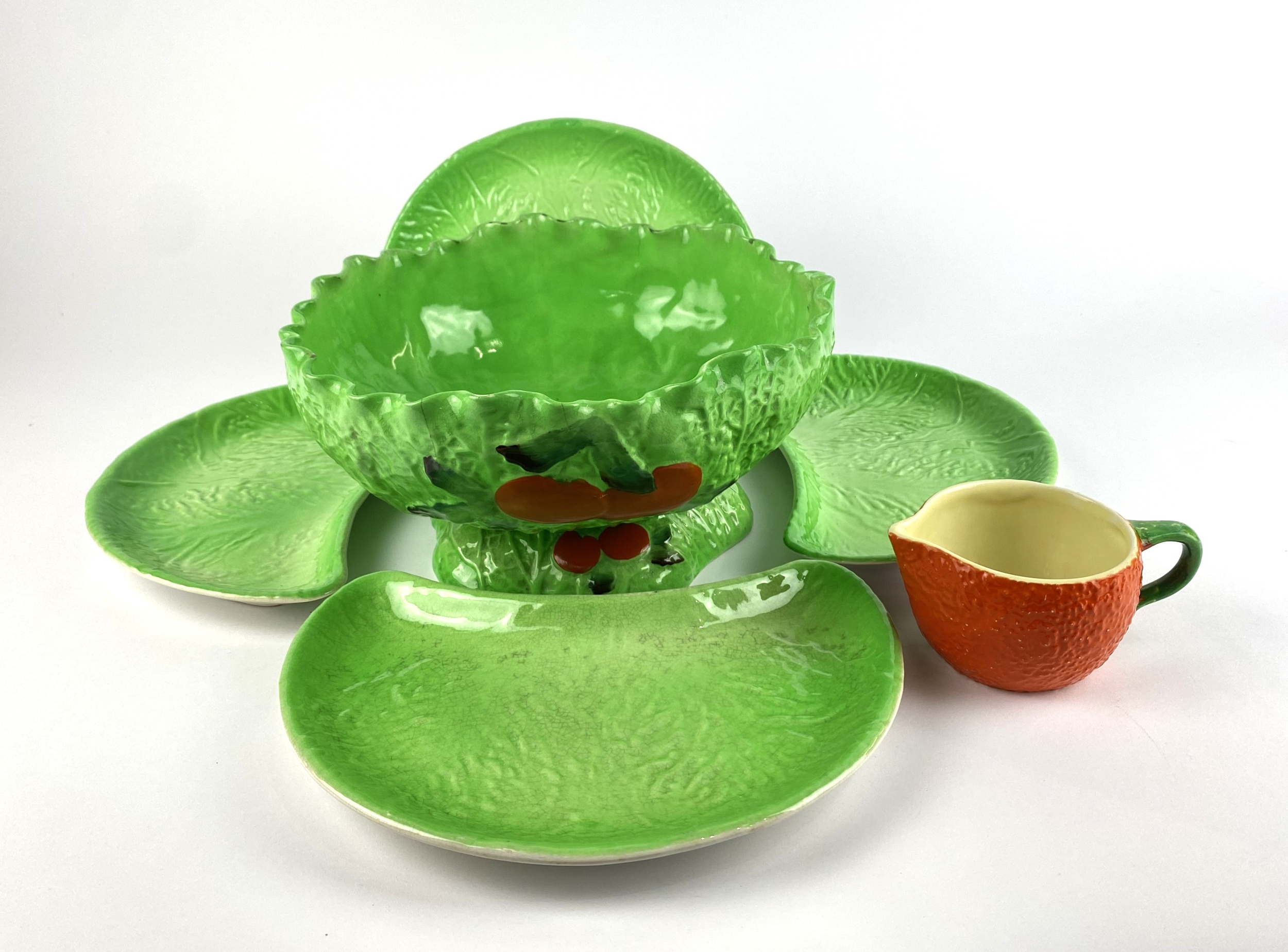A Carlton ware ceramic salad bowl, four kidney shaped salad plates and a small orange jug (a/f)