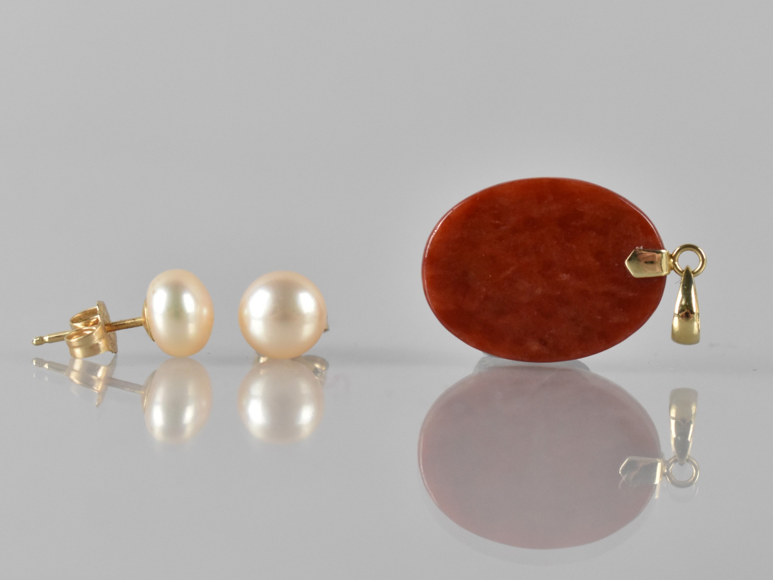 A 14ct Gold Mounted Jasper Pendant, Oval Panel Measuring 20x30mm with a Total 29mm Drop, Stamped to Bale Interior 14K WW, Together with a Pair of 14ct Gold Mounted Pearl Earrings, 7mm Diameter, Stamped to Posts 585