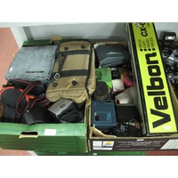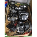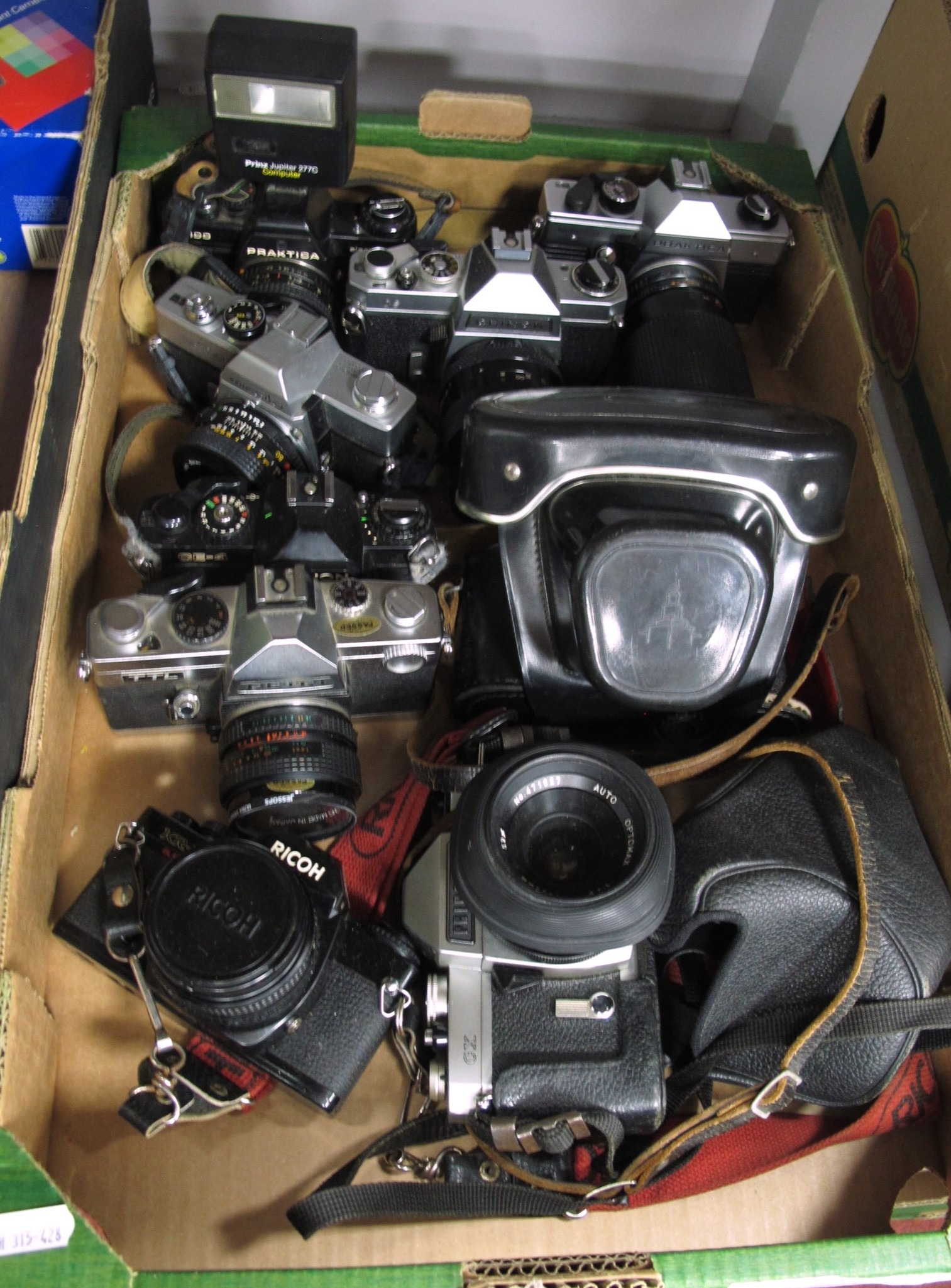 Vintage 35mm SRL cameras to include Ricoh KR-10 Super with 50mm f/2, Minolta SRT101 with 50mm f/2 MD, Praktica B100 with 50mm f/2.4, Praktica Super TL with 50mm f/2.8 various others. One Box [284121]