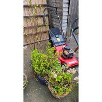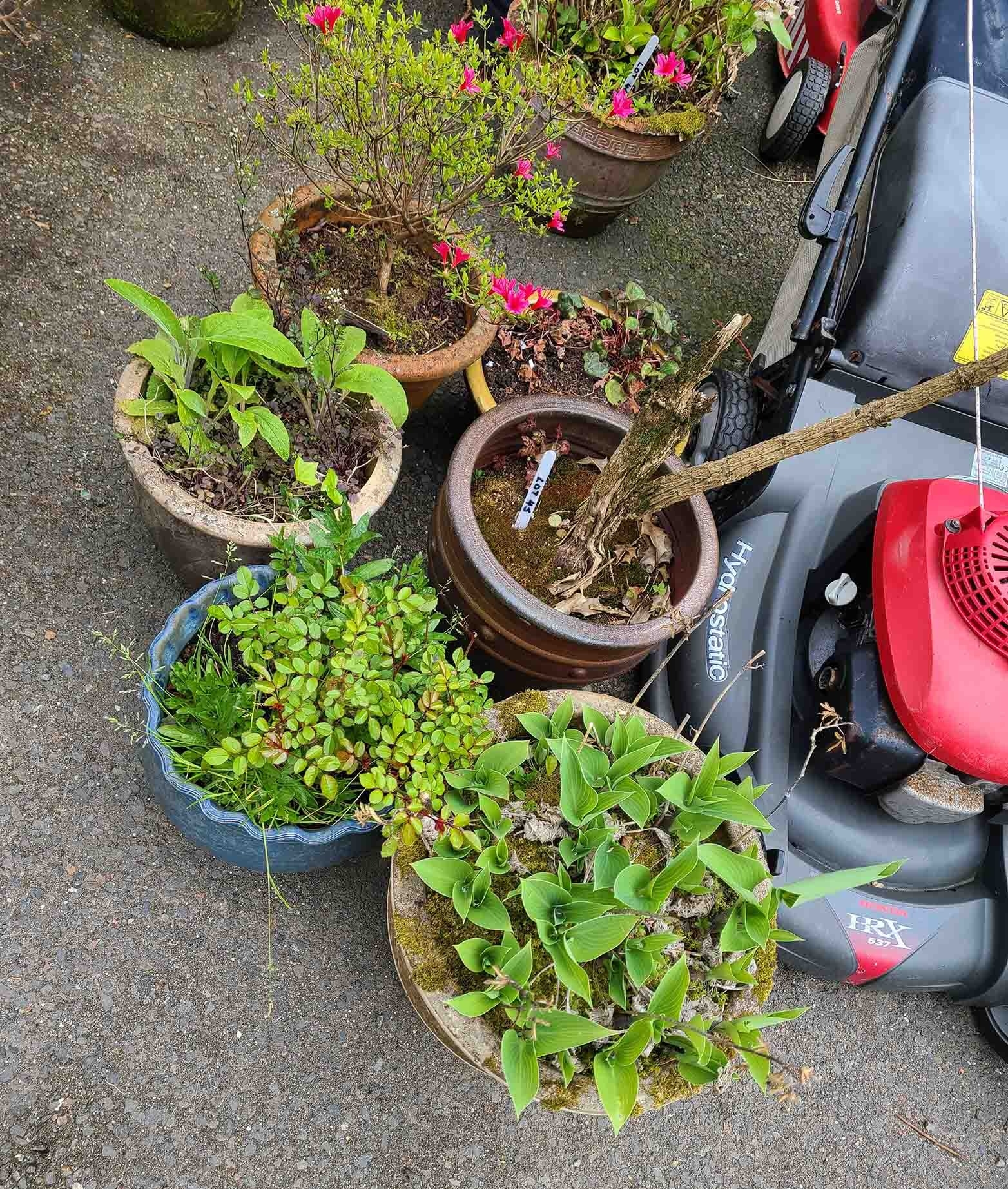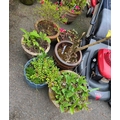 Six assorted garden pots planted with various shrubs