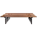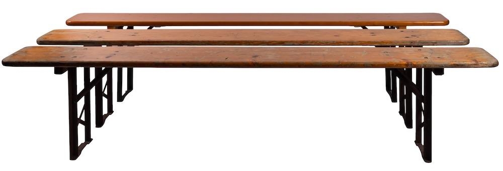 Two German pine and metal folding tables, with three similar benches en suite, 20th century; the tables 77cm high, 219cm long, 50cm wide