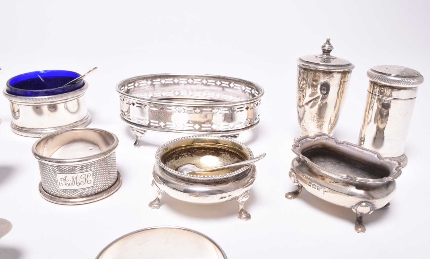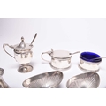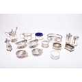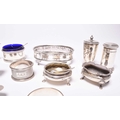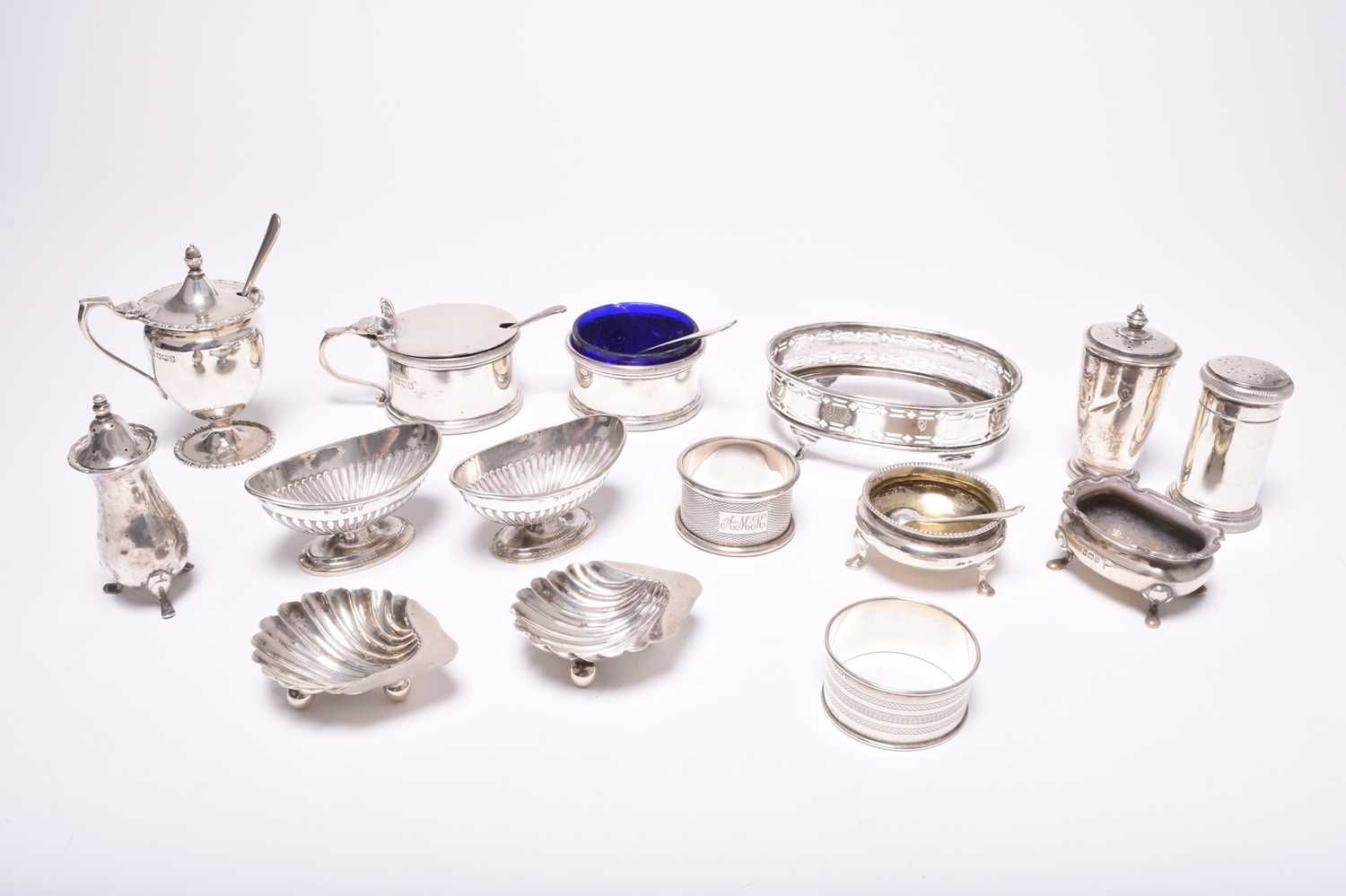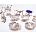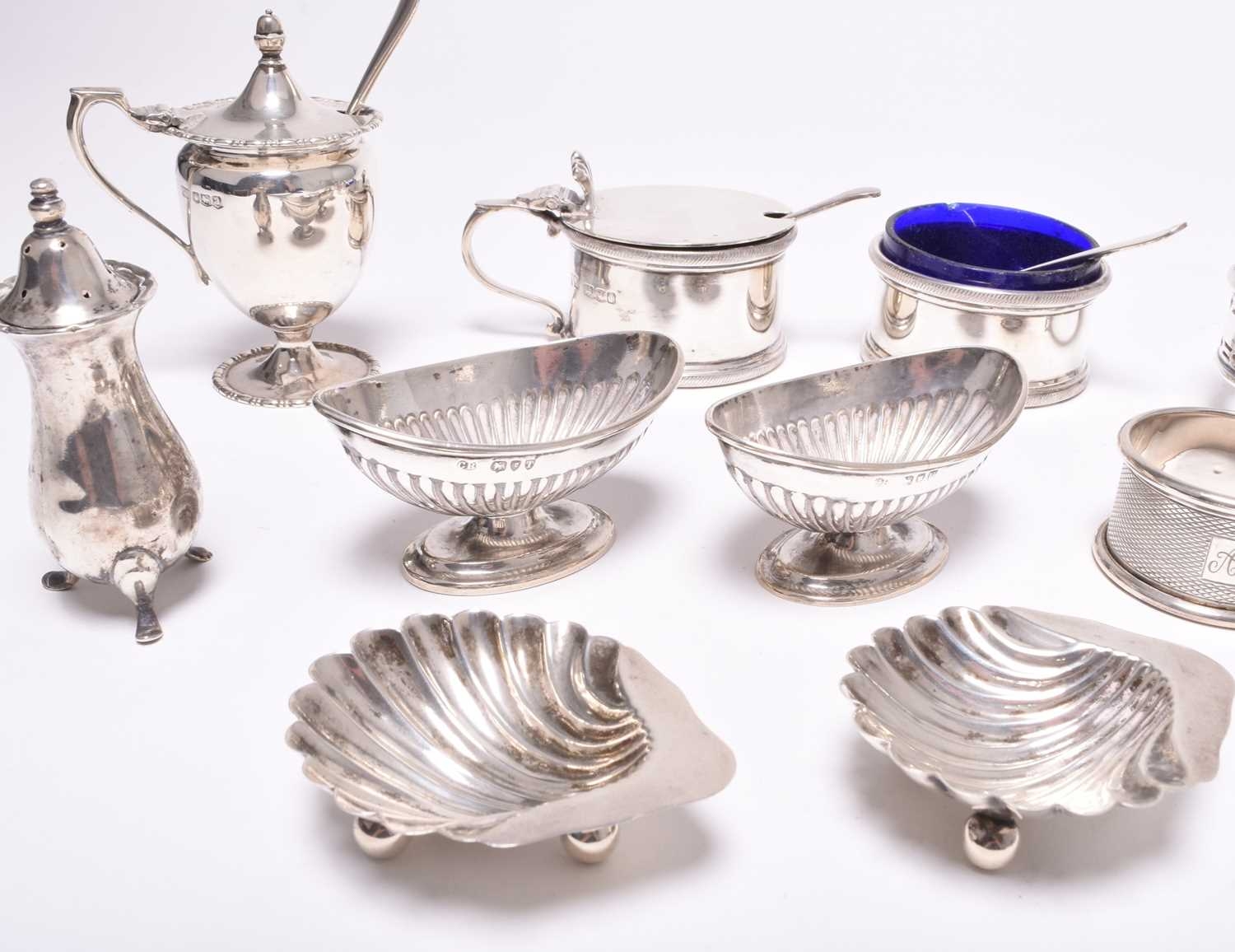 A collection of various silver cruets, comprising; a pair of navette form pedestal salts, London 1894 & 1895, a pair of shell form salts, a three piece cruet set, London 1944, two pepper pots, two further salts, a mustard, cruet spoons and two napkin rings, total weight approx 16oz (a lot)